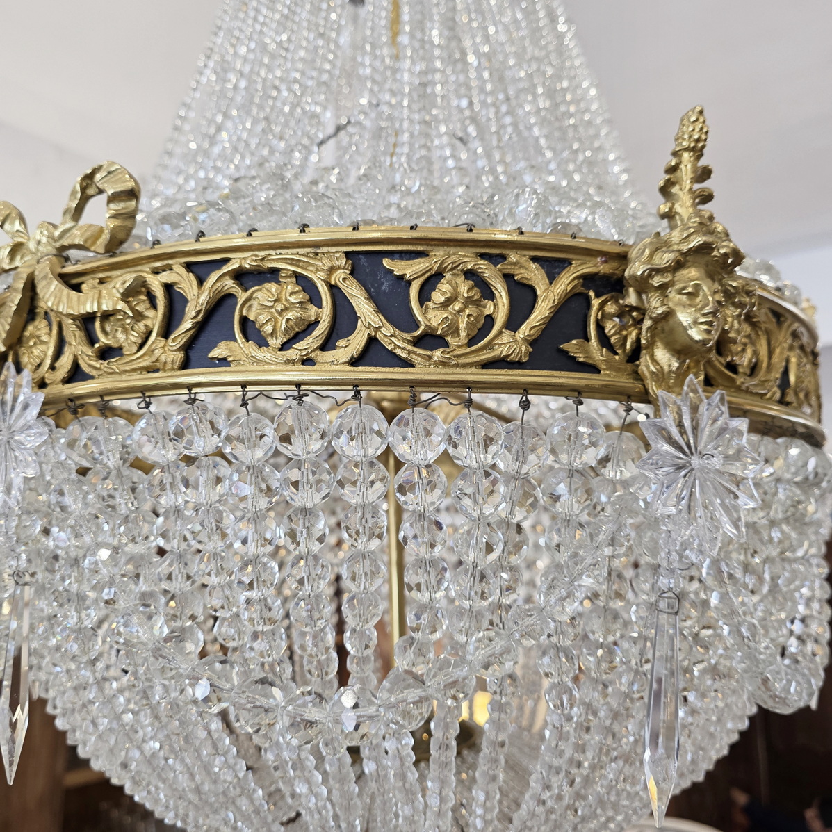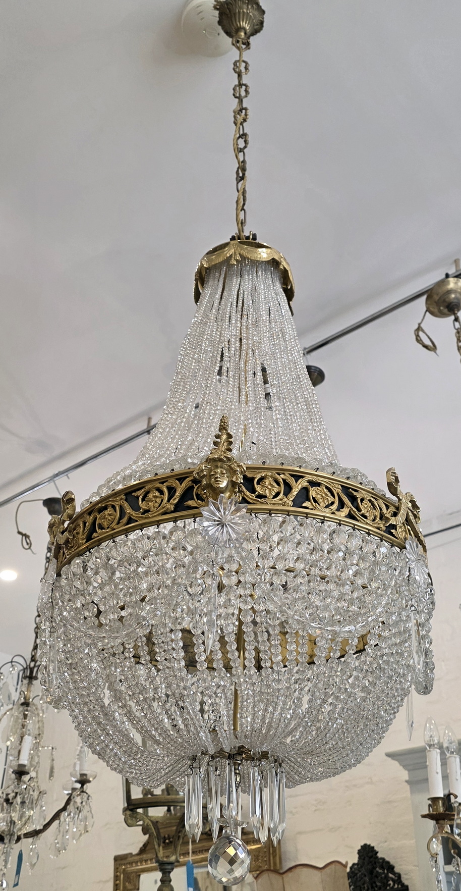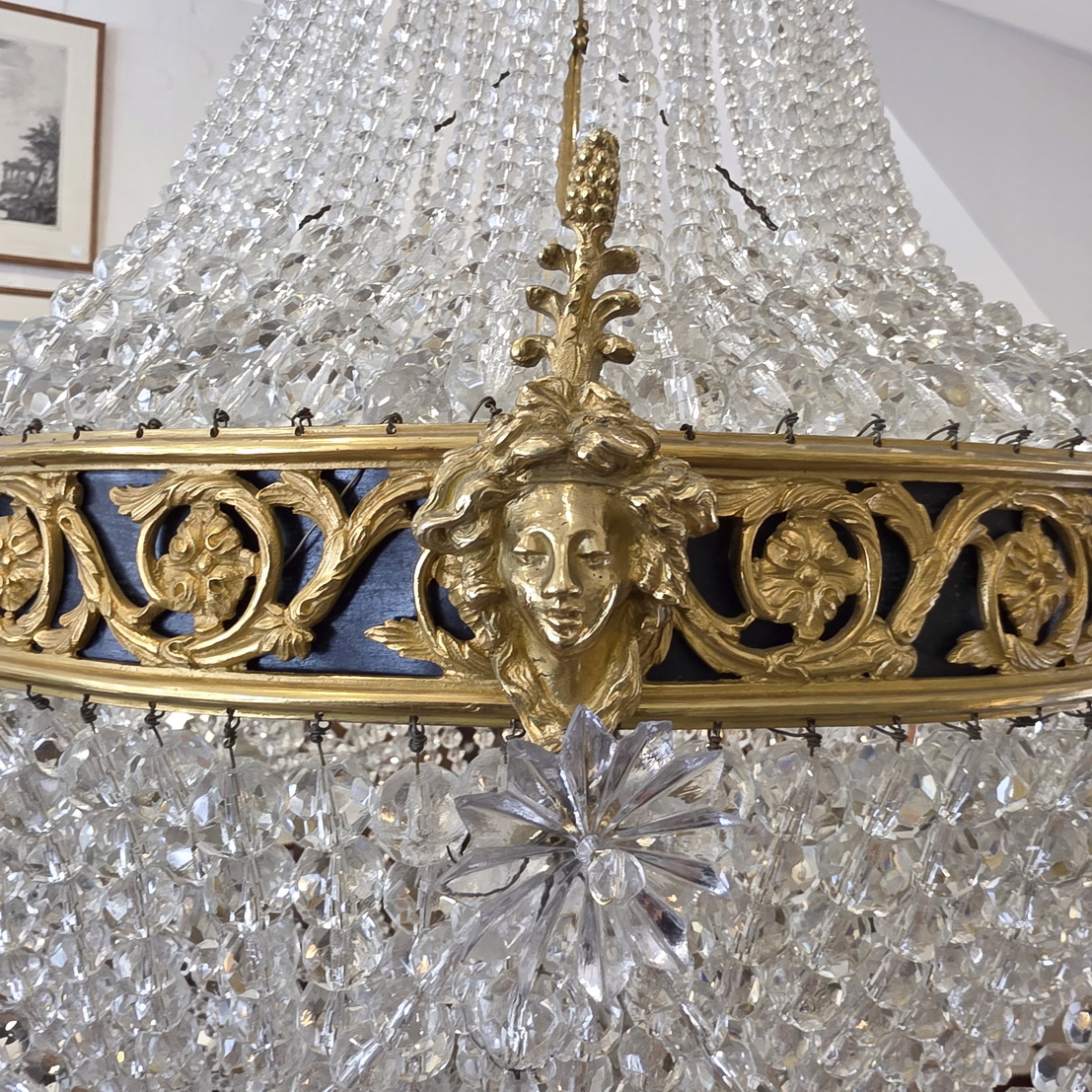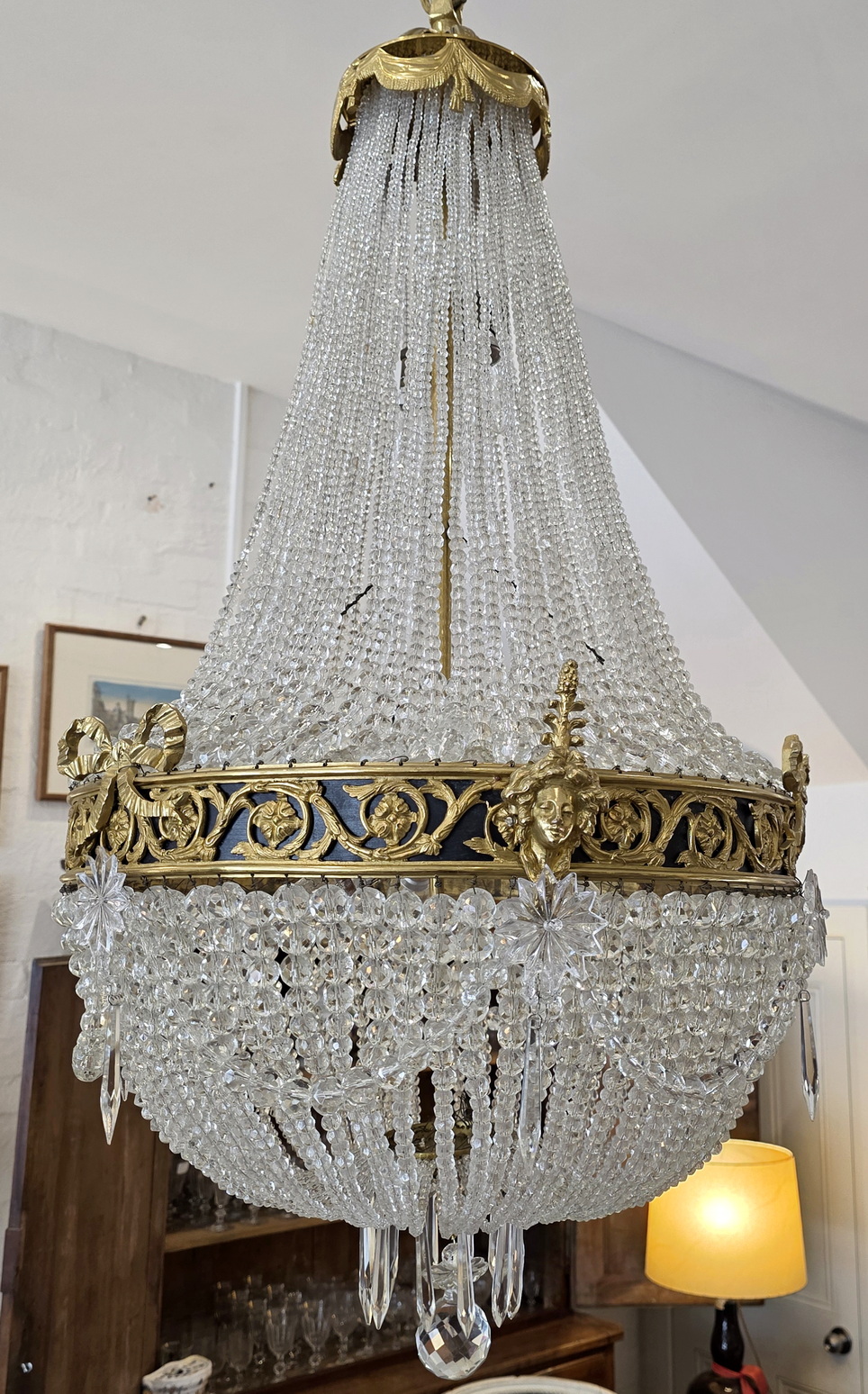 A fine, French Louis XVI style gilt brass ‘Montgolfier’ chandelier decorated with gilt brass caryatid heads and knotted bows on a frieze with fretted foliate volutes, the body made with long chains of crystals above a 'basket' of crystal-chain, with crystal 'rosettes' and swags of crystal chains. The plinth decorated with pencil crystals and a faceted plinth ball. Internally fitted with three lights that light up the crystal chains from within. Of excellent, Classical proportions and made with fine quality crystals and workmanship. Area of Paris, circa 1930.