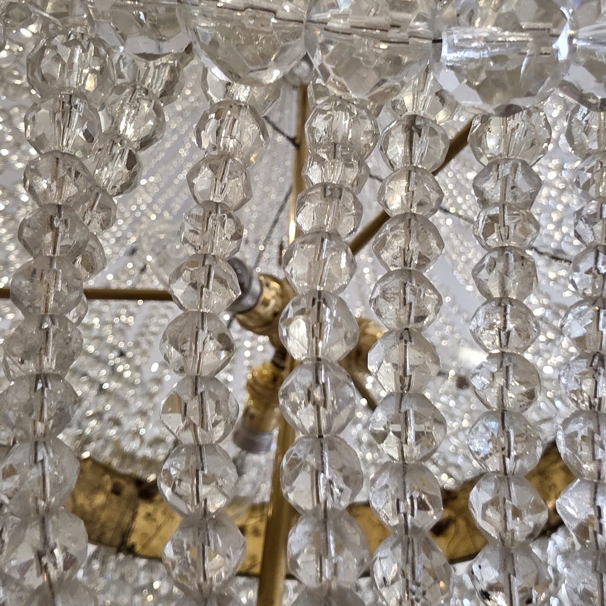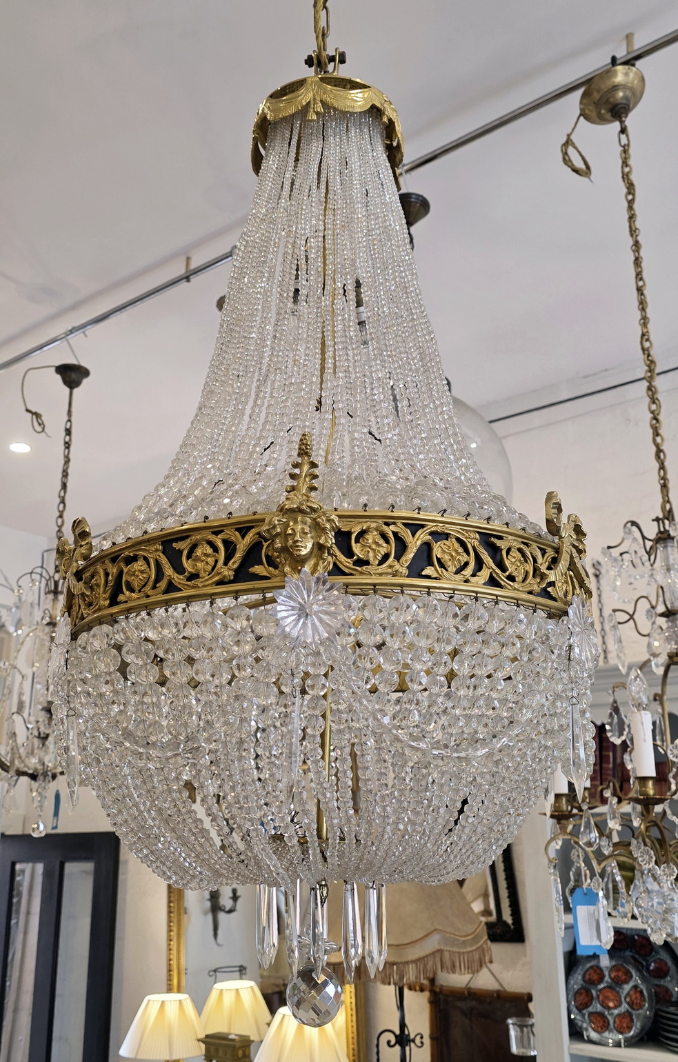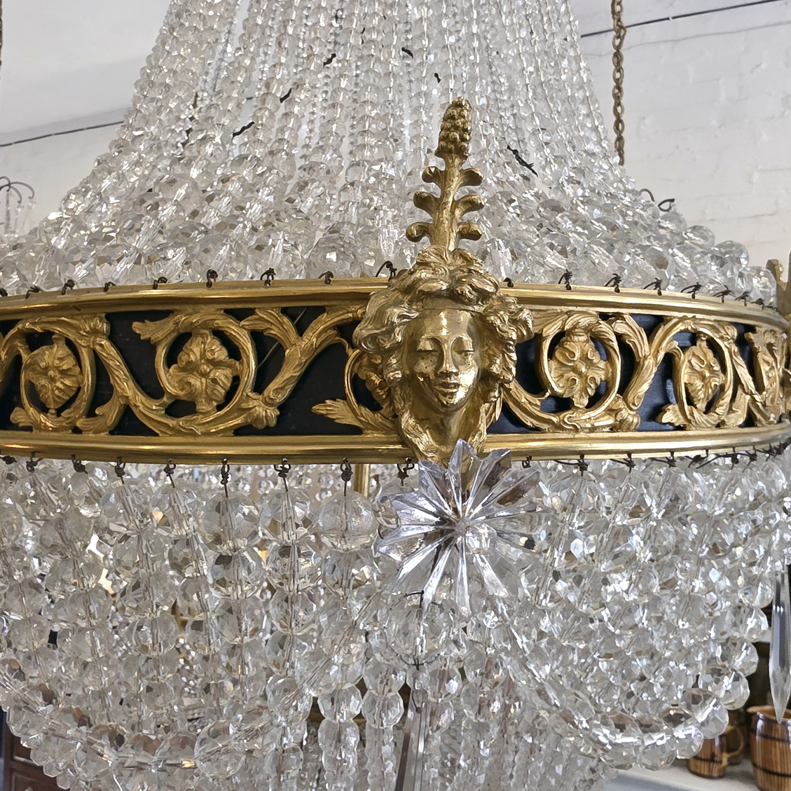 A fine, French Louis XVI style gilt brass ‘Montgolfier’ chandelier decorated with gilt brass caryatid heads and knotted bows on a frieze with fretted foliate volutes, the body made with long chains of crystals above a 'basket' of crystal-chain, with crystal 'rosettes' and swags of crystal chains. The plinth decorated with pencil crystals and a faceted plinth ball. Internally fitted with three lights that light up the crystal chains from within. Of excellent, Classical proportions and made with fine quality crystals and workmanship. Area of Paris, circa 1930.
