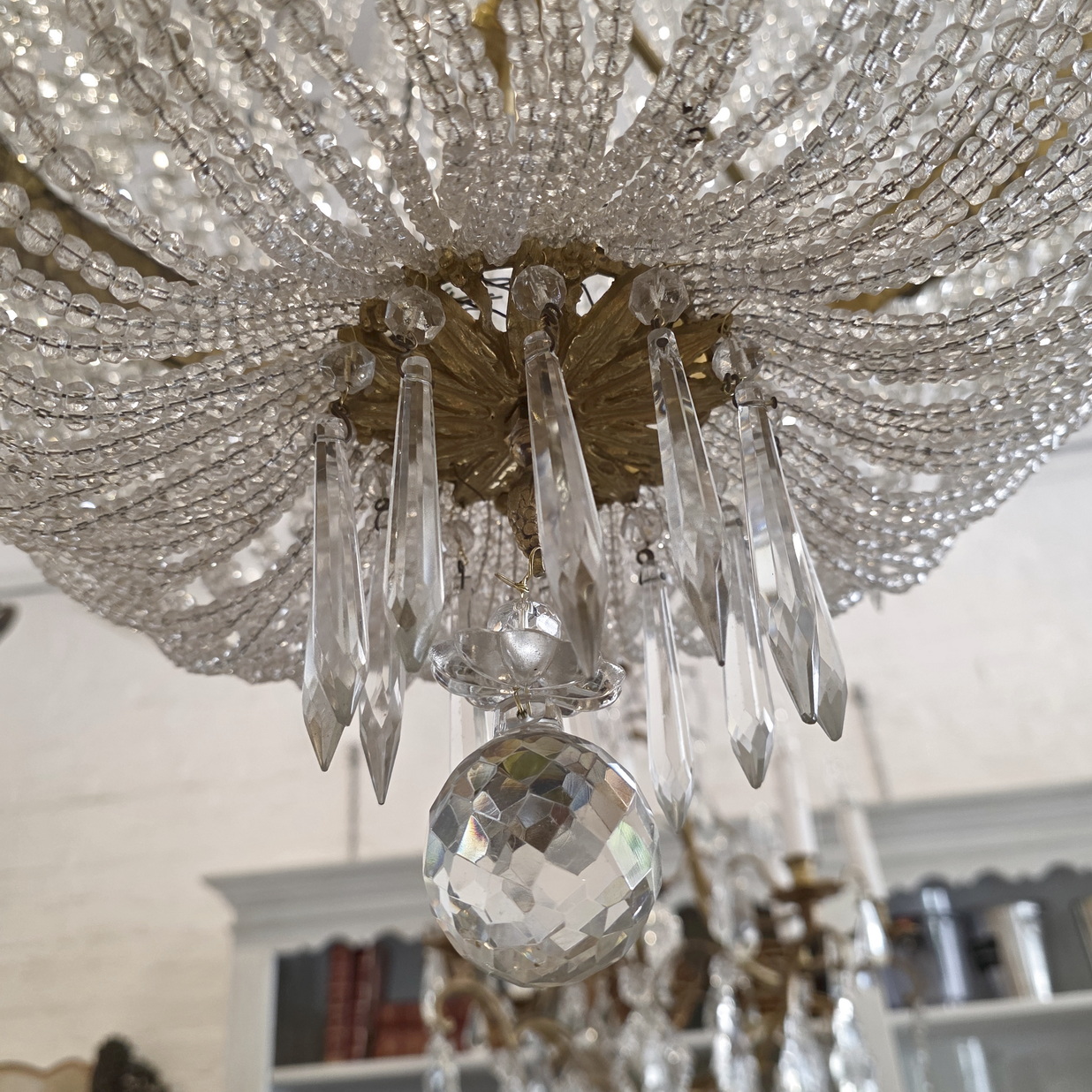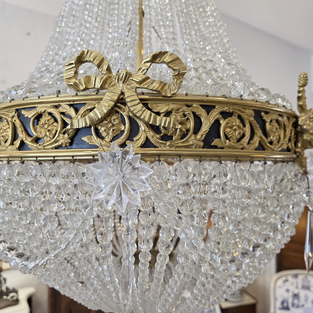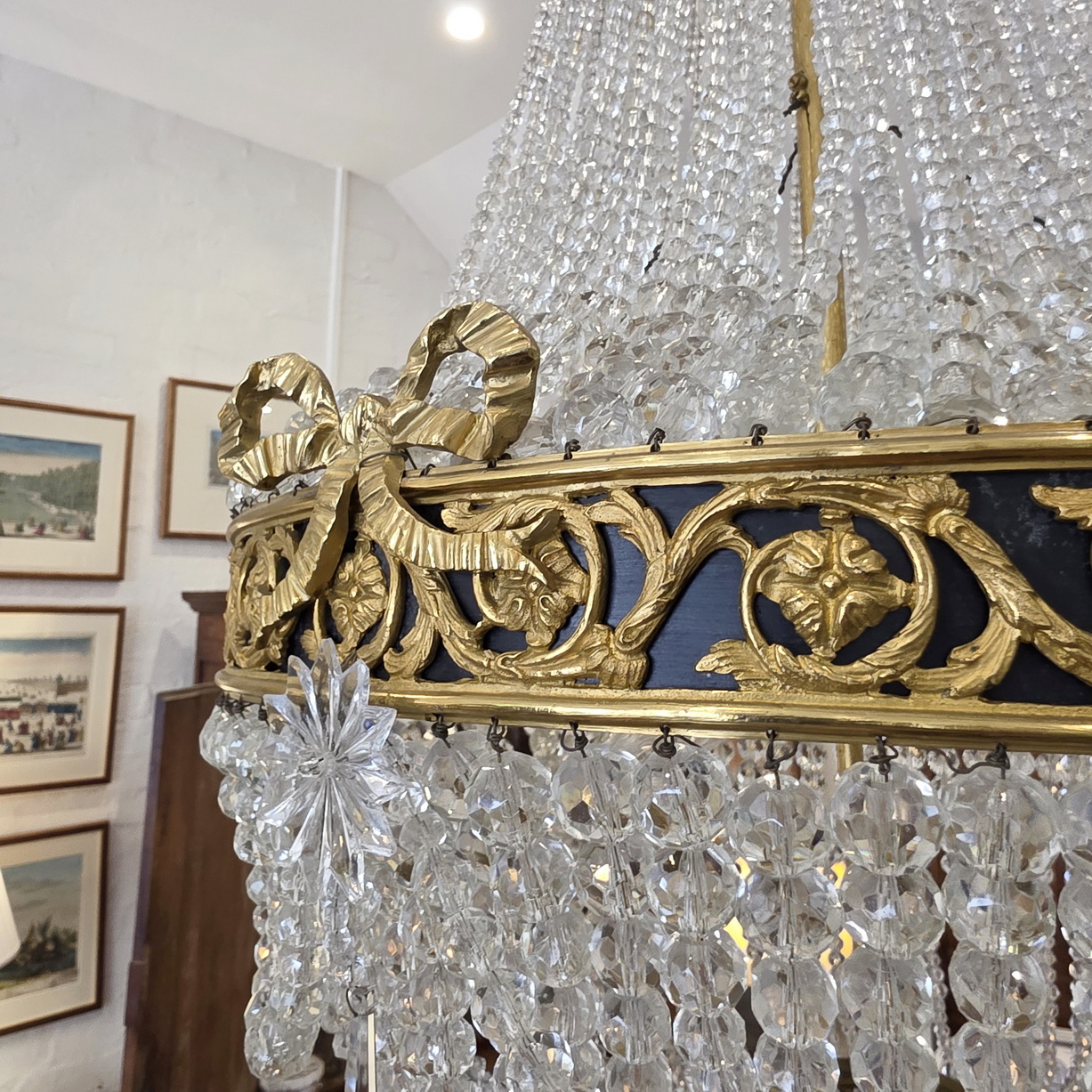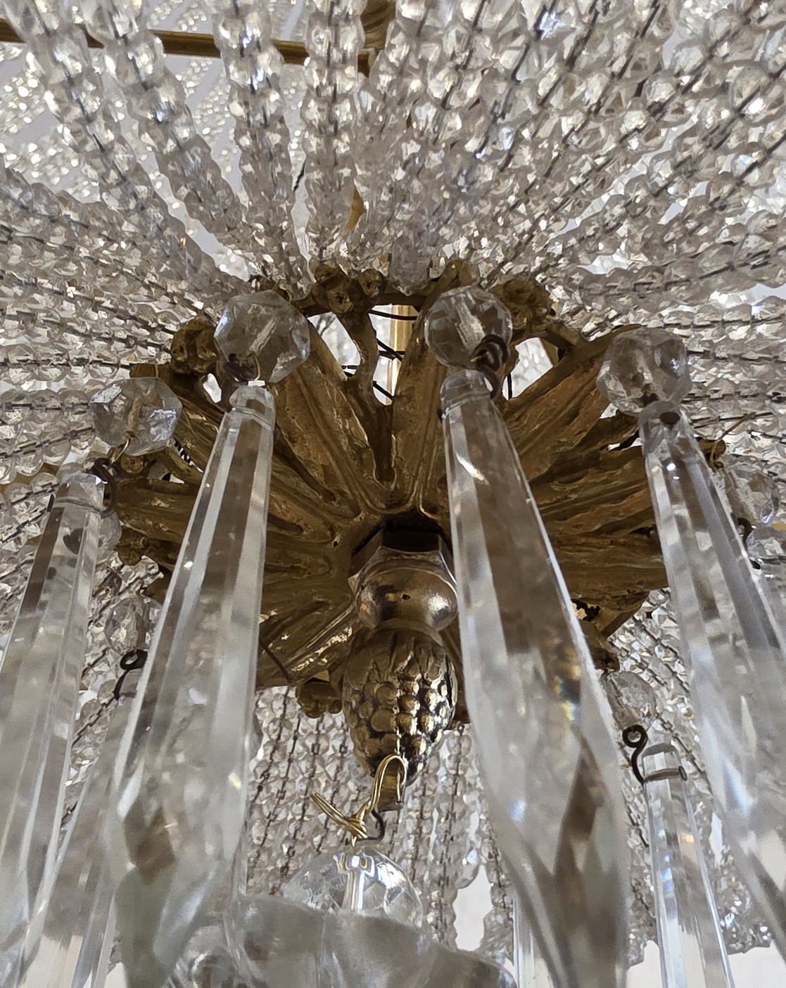 A fine, French Louis XVI style gilt brass ‘Montgolfier’ chandelier decorated with gilt brass caryatid heads and knotted bows on a frieze with fretted foliate volutes, the body made with long chains of crystals above a 'basket' of crystal-chain, with crystal 'rosettes' and swags of crystal chains. The plinth decorated with pencil crystals and a faceted plinth ball. Internally fitted with three lights that light up the crystal chains from within. Of excellent, Classical proportions and made with fine quality crystals and workmanship. Area of Paris, circa 1930.