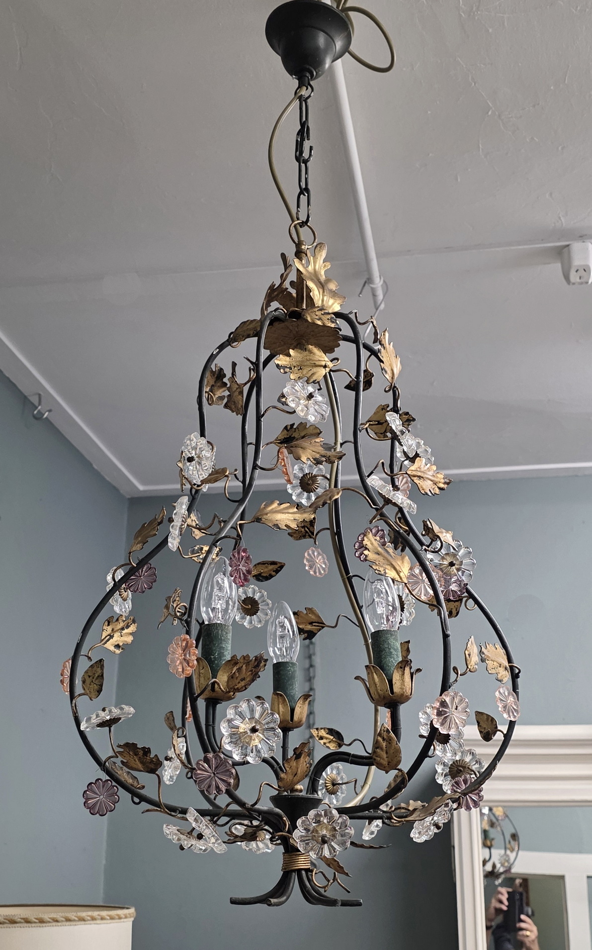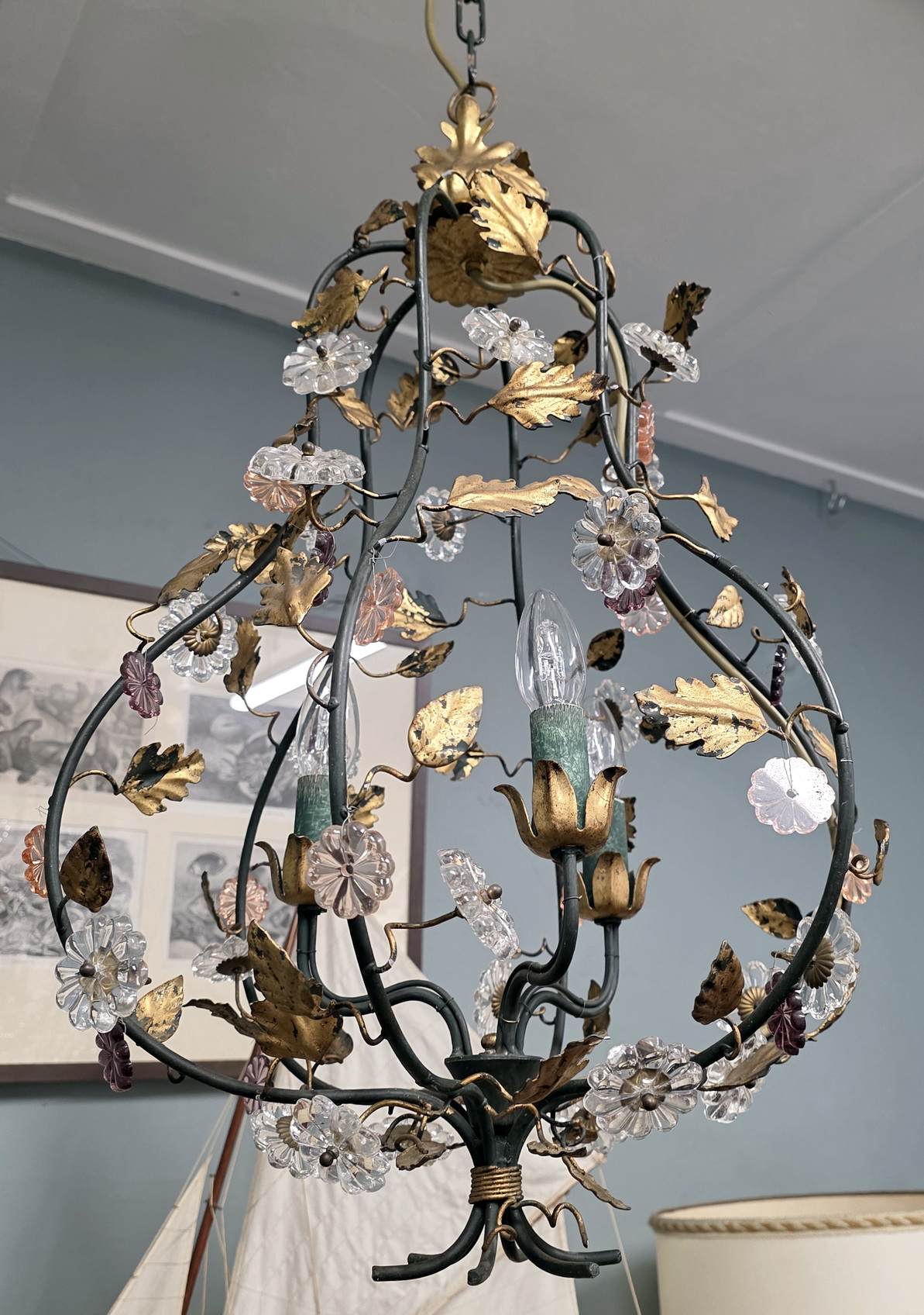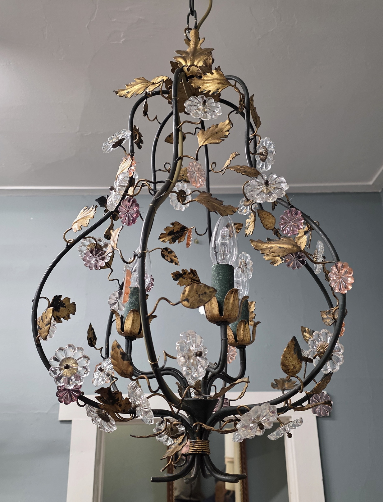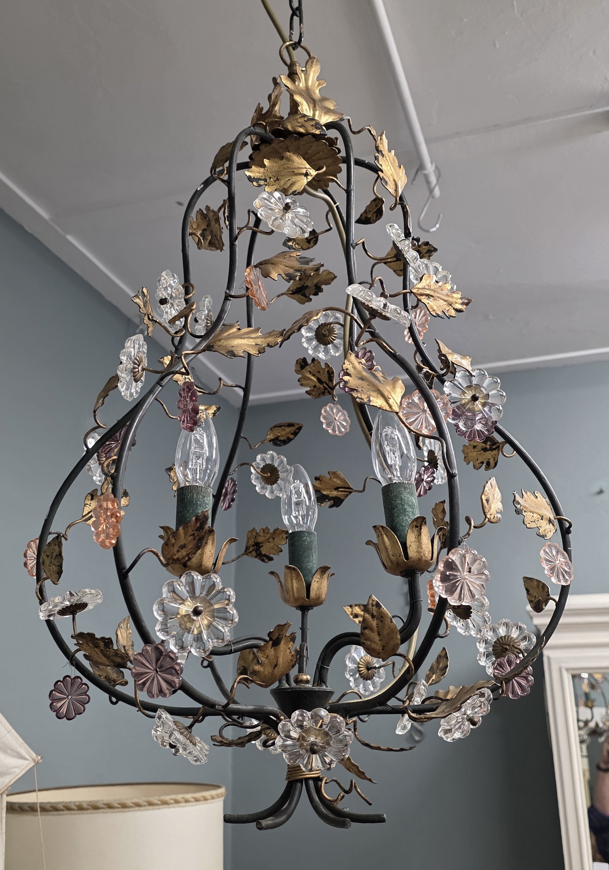 A vintage French gilt tole work, three light 'cage' chandelier in the style of Maison Charles, decorated with delicate gilt tole vines and leaves and with cut-crystal and with large 'rosette' crystals. Area of Paris, circa 1960.
