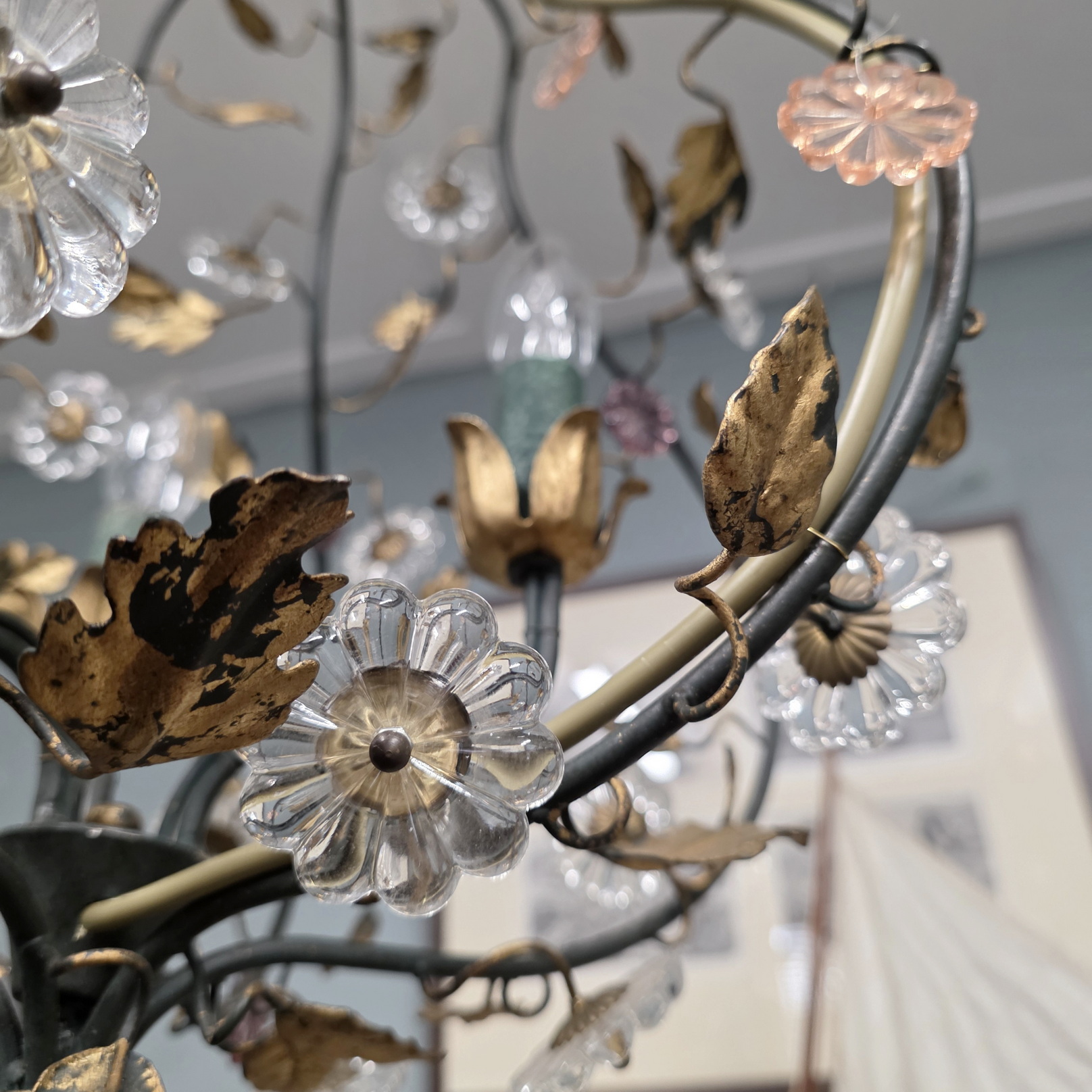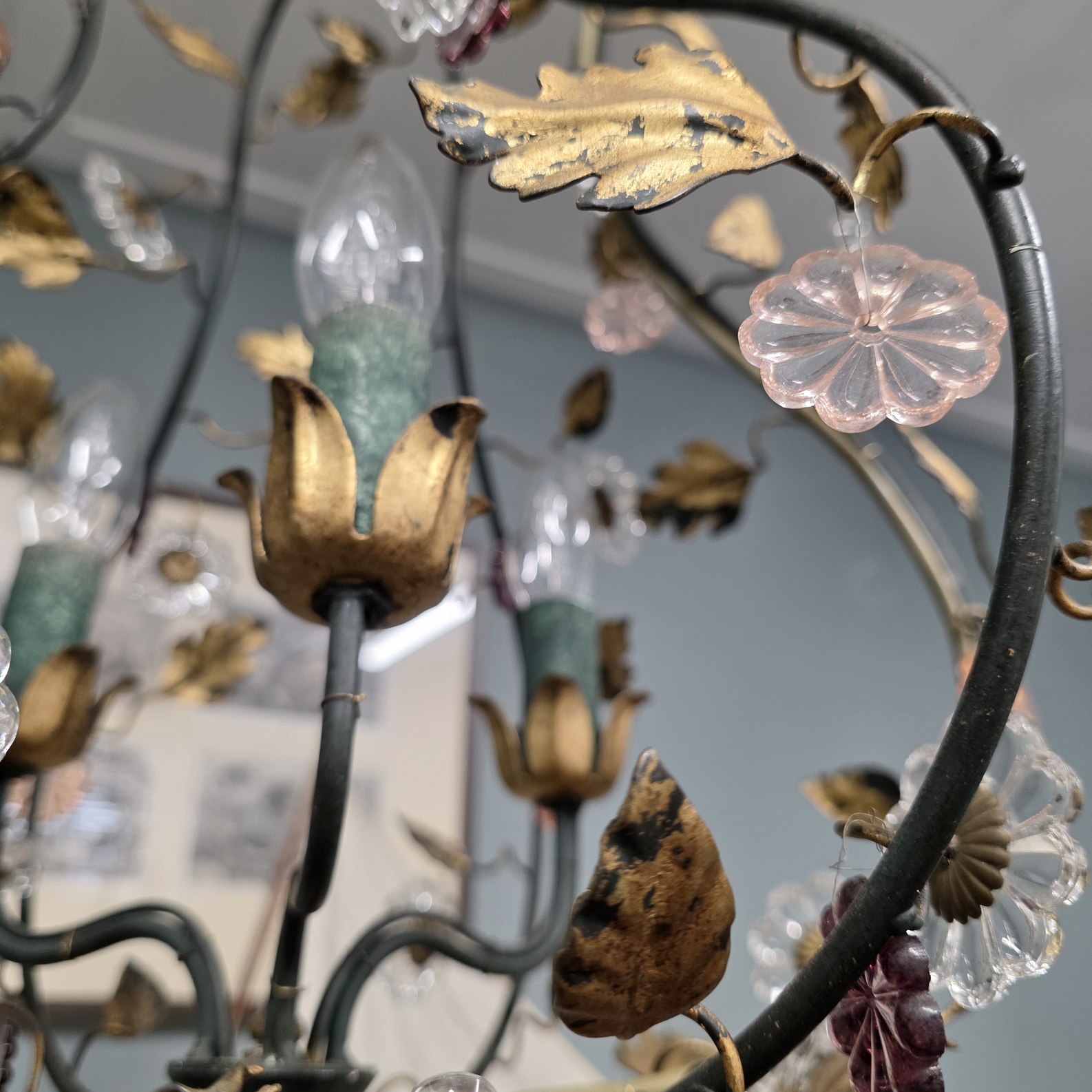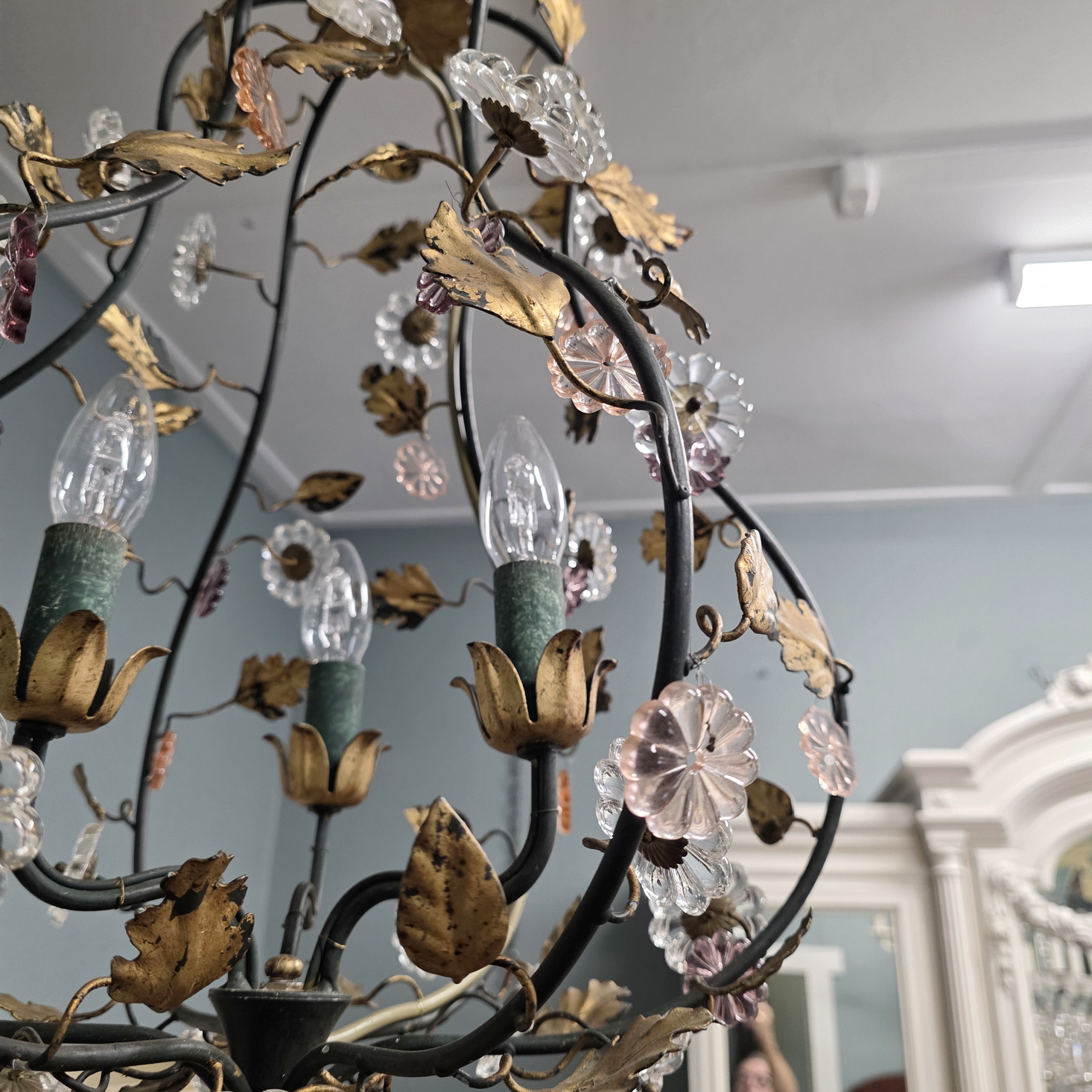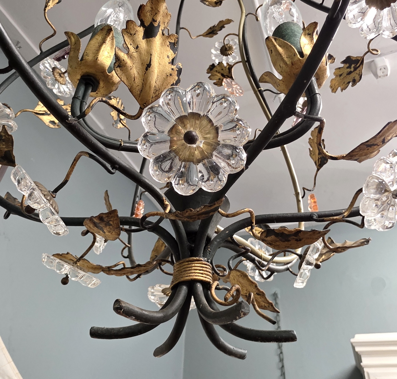 A vintage French gilt tole work, three light 'cage' chandelier in the style of Maison Charles, decorated with delicate gilt tole vines and leaves and with cut-crystal and with large 'rosette' crystals. Area of Paris, circa 1960.