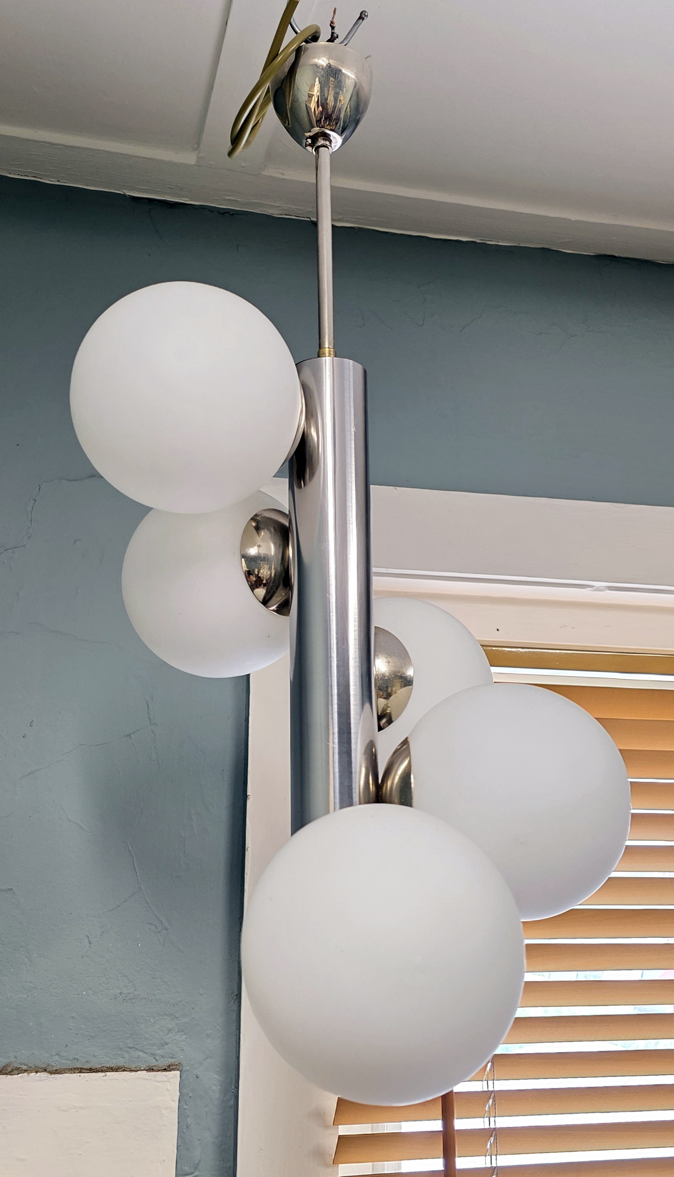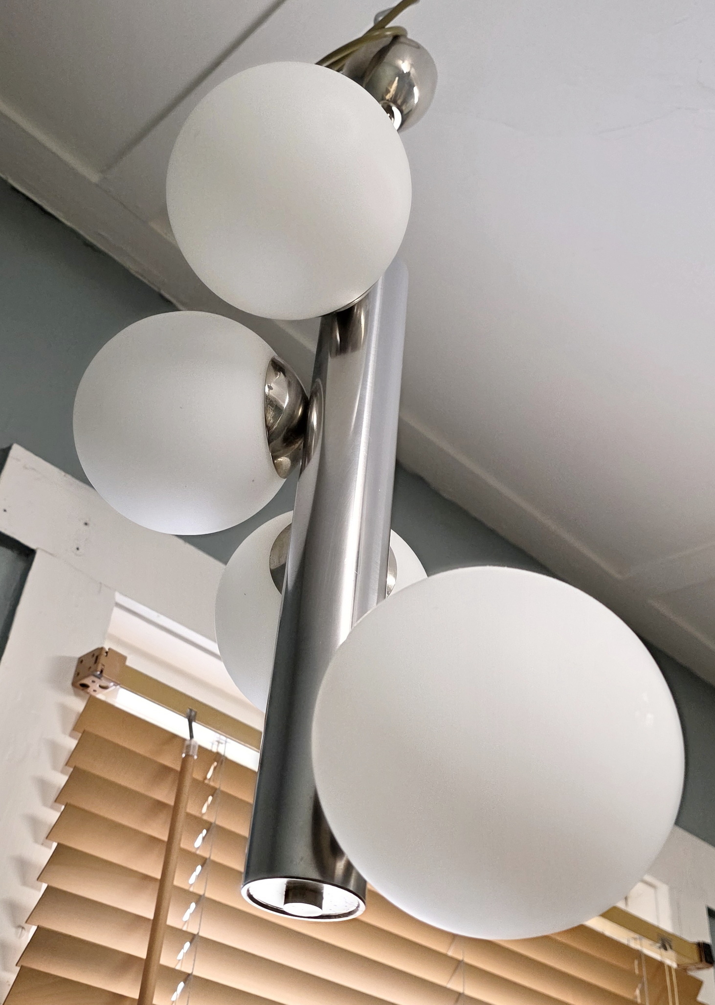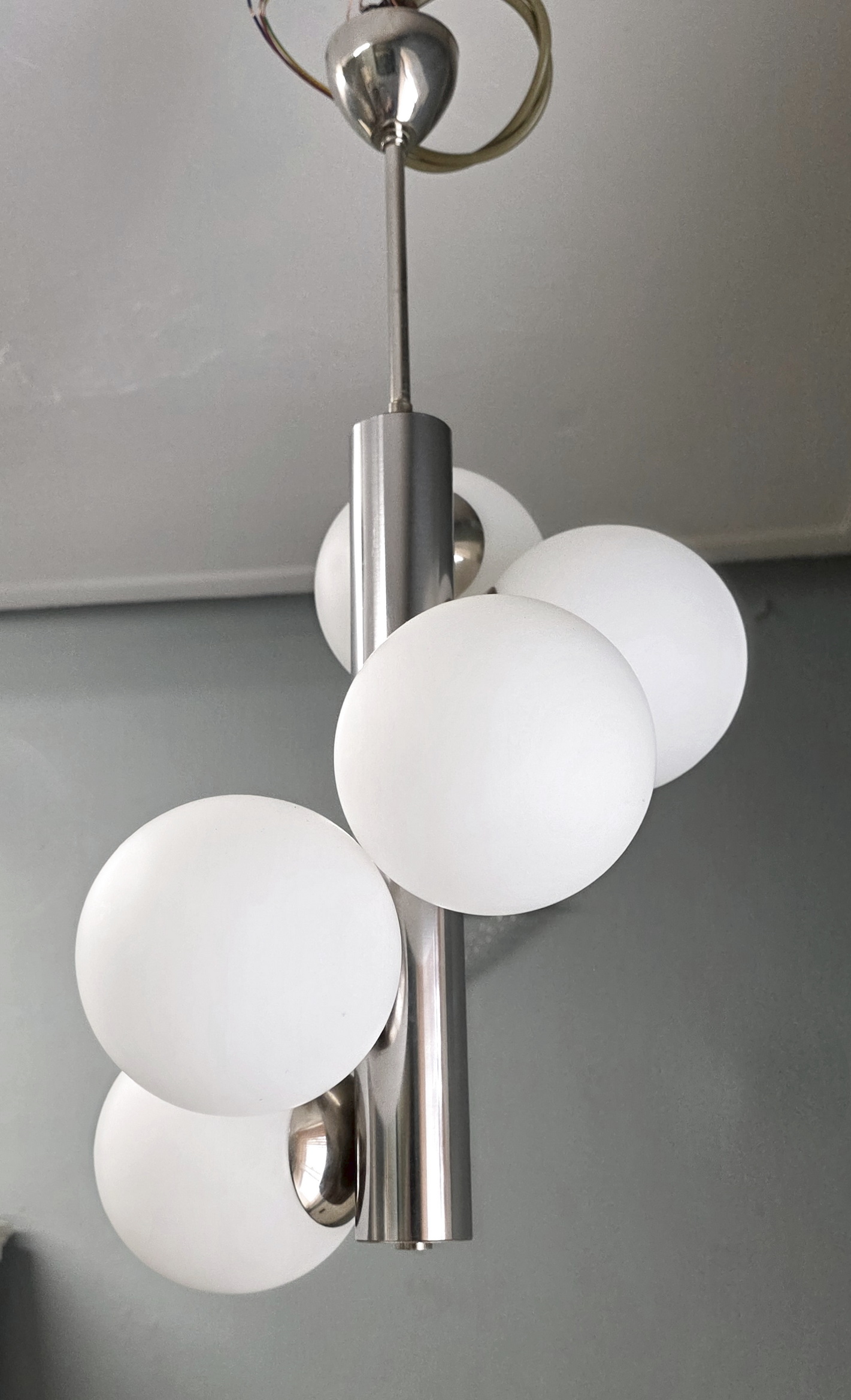 A vintage ceiling light in the style of Kaiser Leuchten, the main cylindrical chrome metal shaft supporting five while glass balls internally fitted with lightbulbs. Retaining its original chrome rod and ceiling cup. Area of Germany, circa 1970.