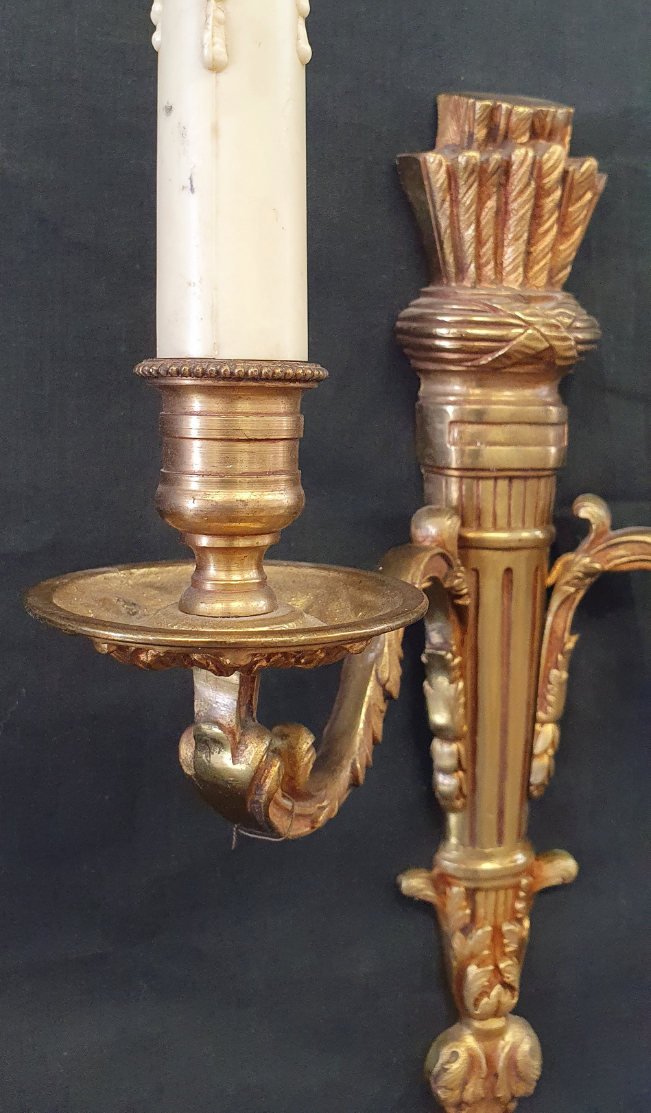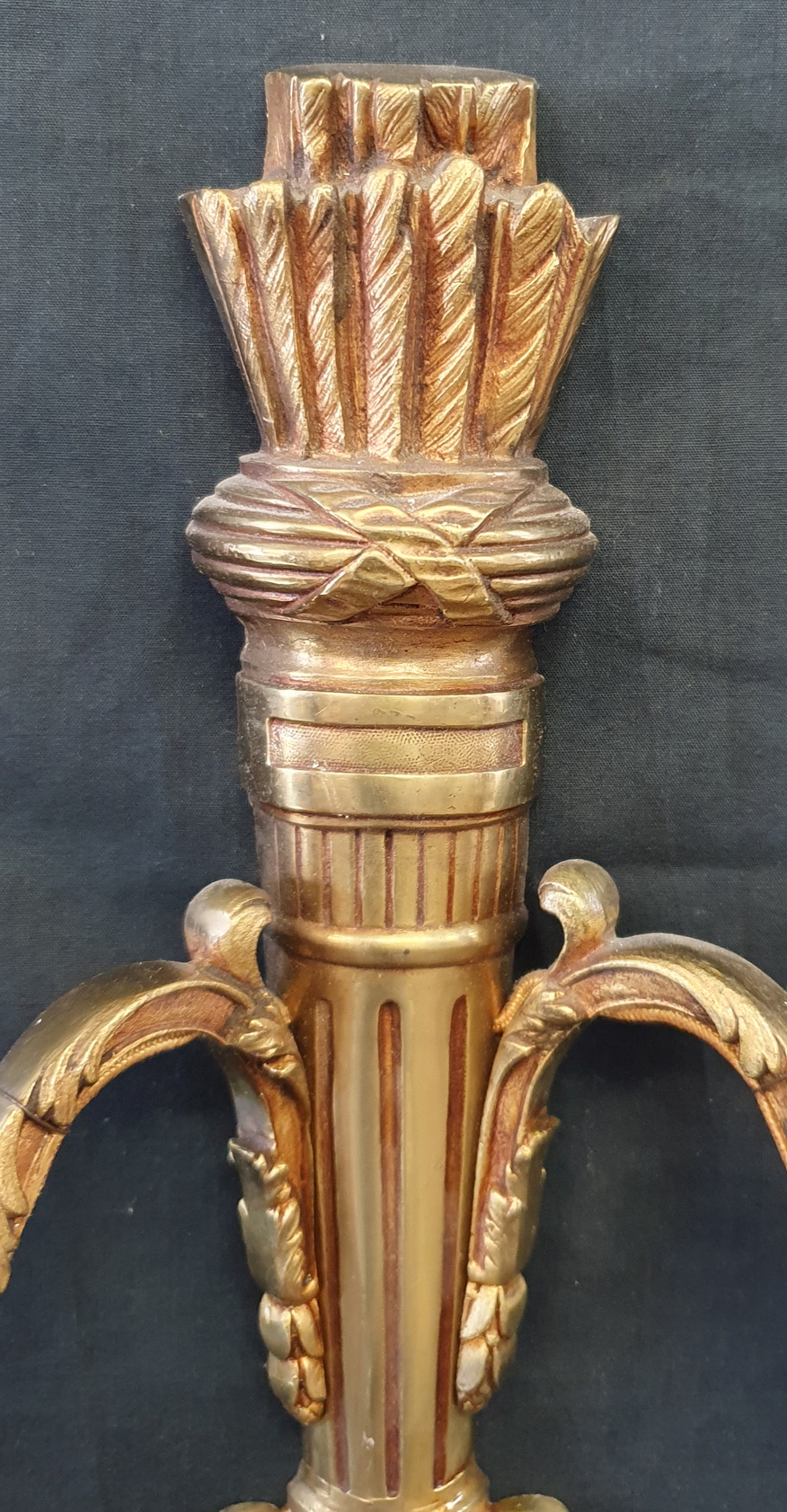 A pair of fine, early 20th century French Louis XVI style, two-arm gilt brass wall lights in the shape of Classic quivers decorated with fluting and with stylised acanthus leaves. Please note the fine quality of the cast, chased and gilt metalwork. Area of Paris, circa 1930.