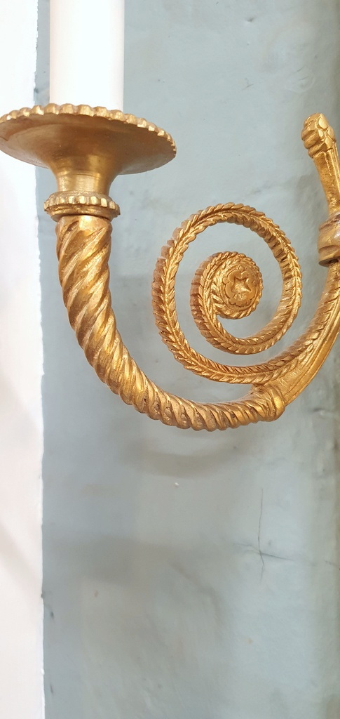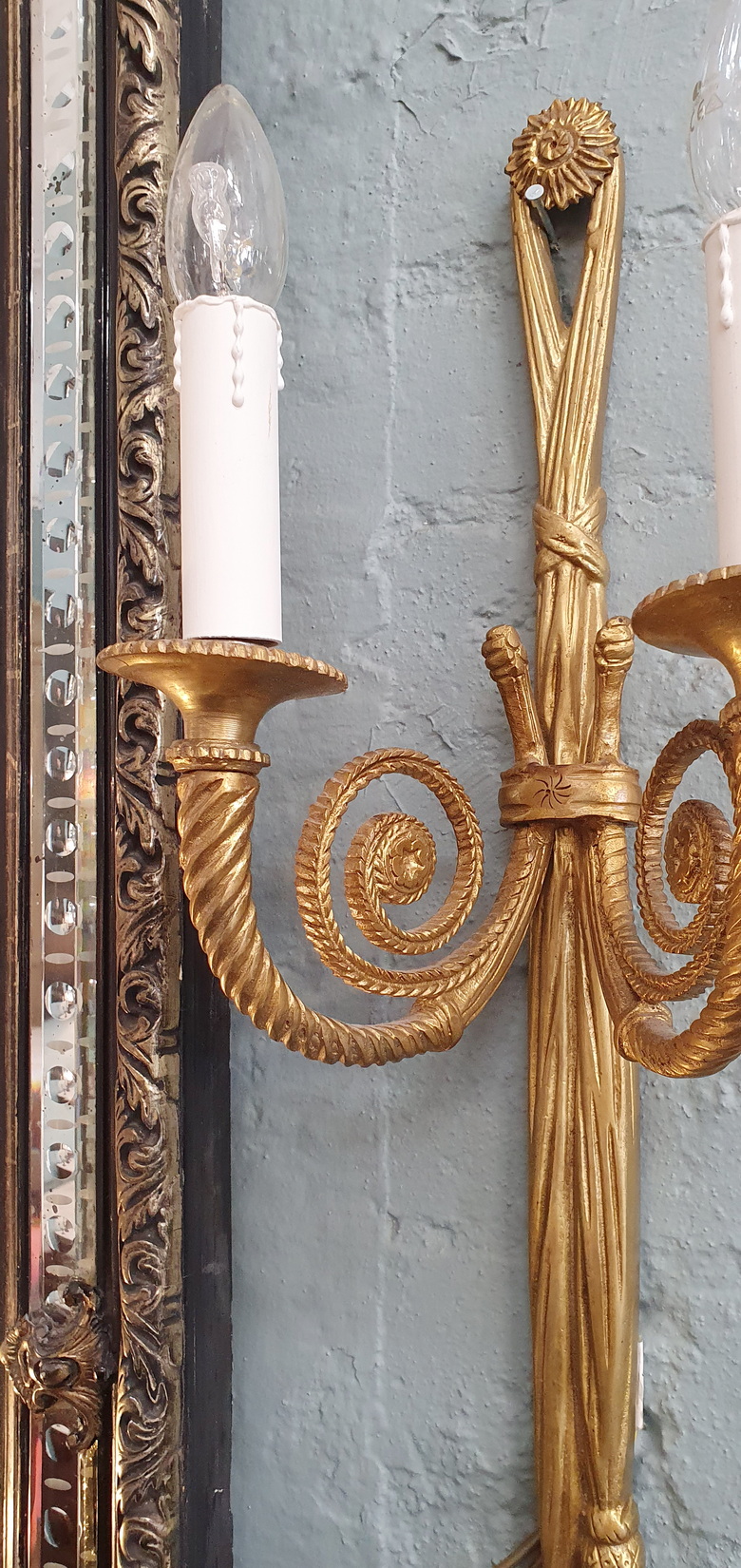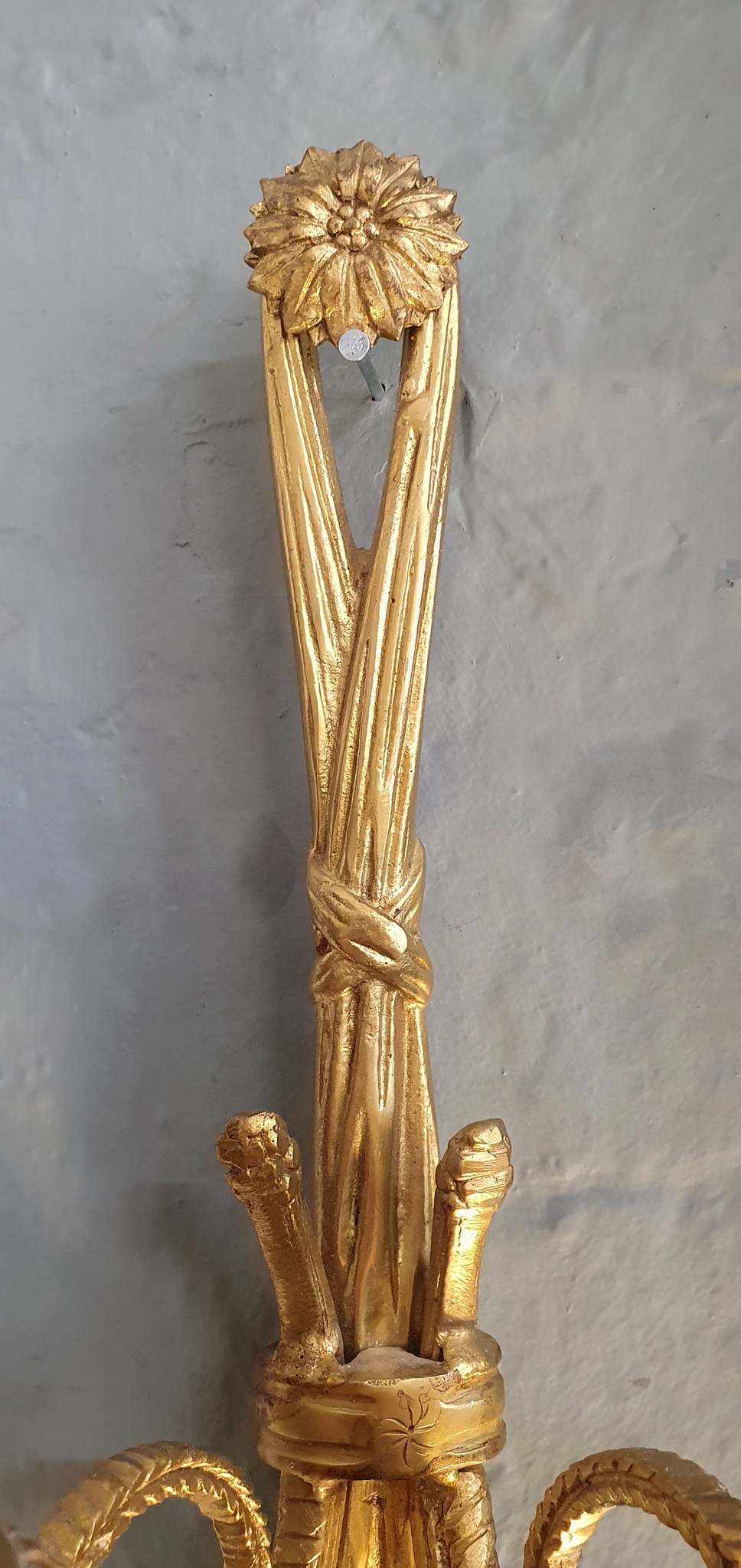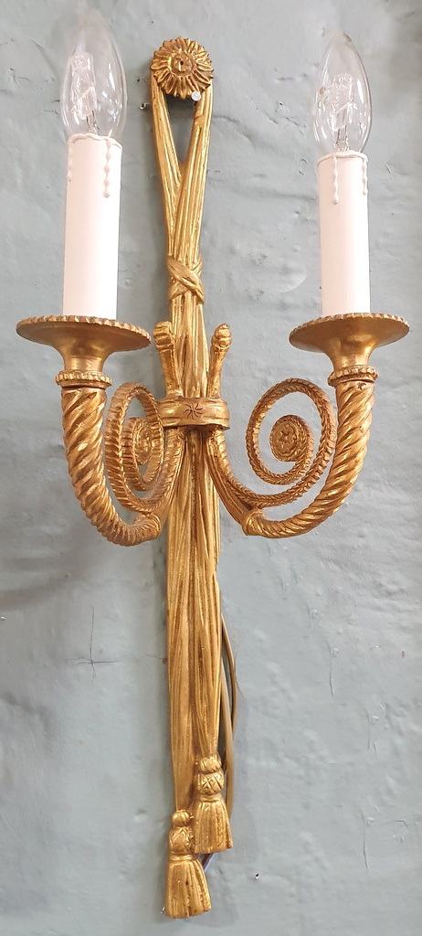 An elegant and large-sized, early 20th century French Louis XVI style, Maison Lucien Gau design gilt brass wall light decorated in the shape of out-sized tassels, each of the lights fitted with twist-turned arms and sconces. Area of Paris, circa 1930.