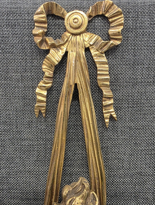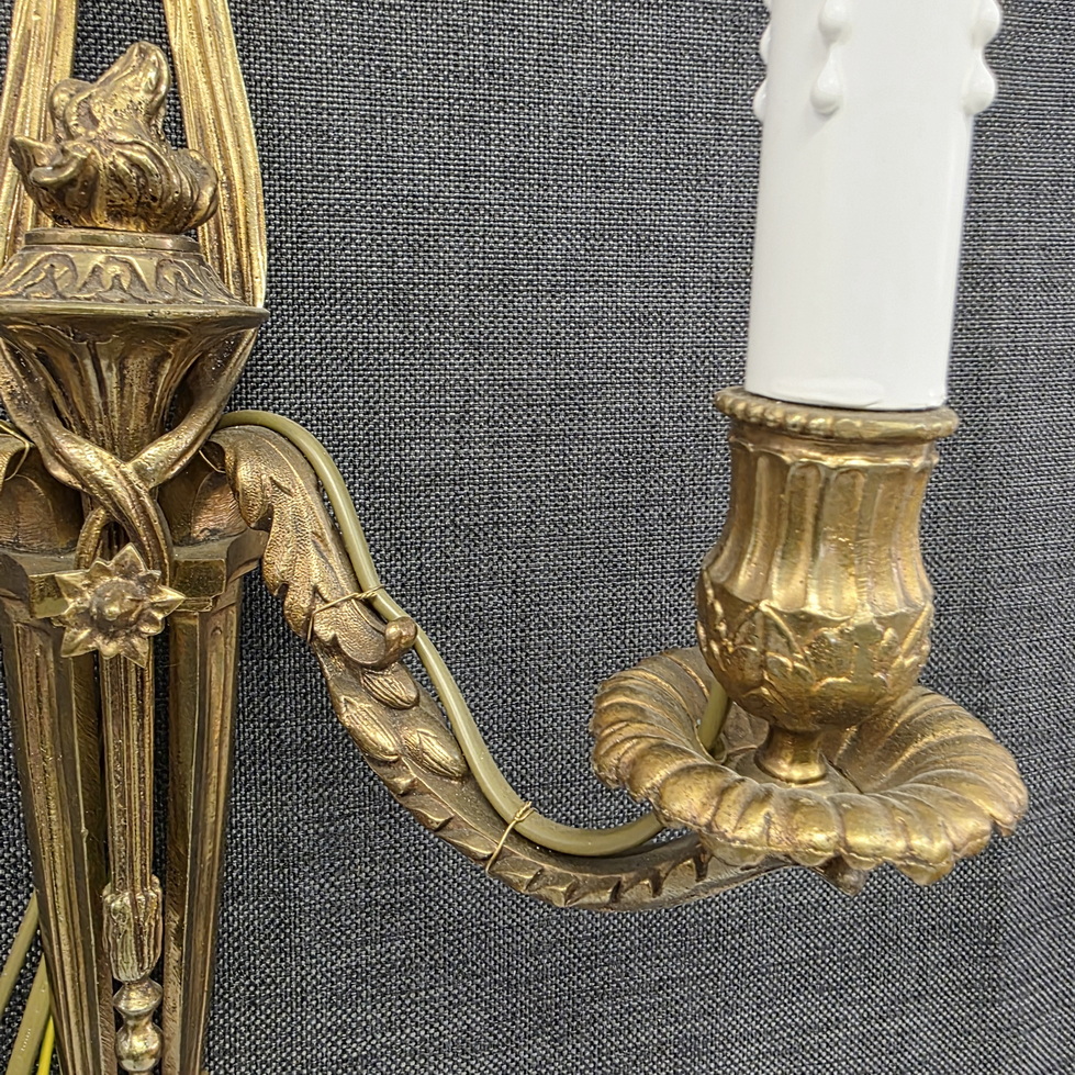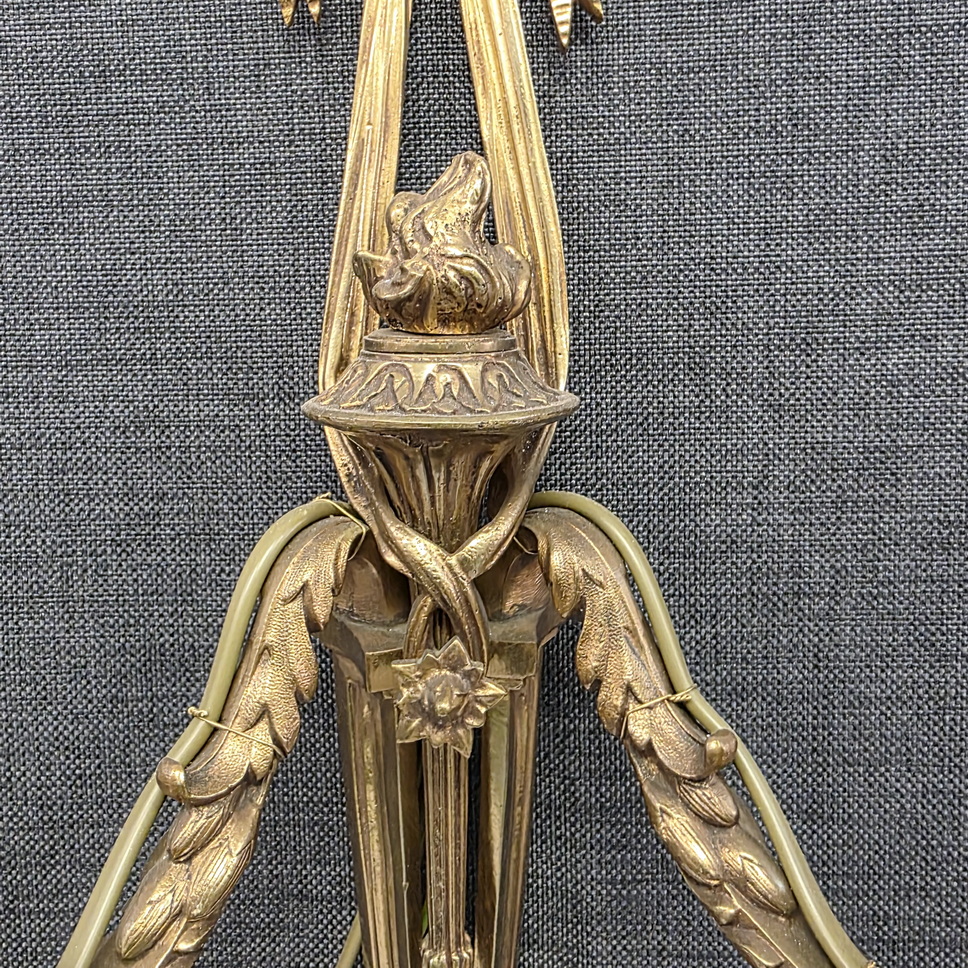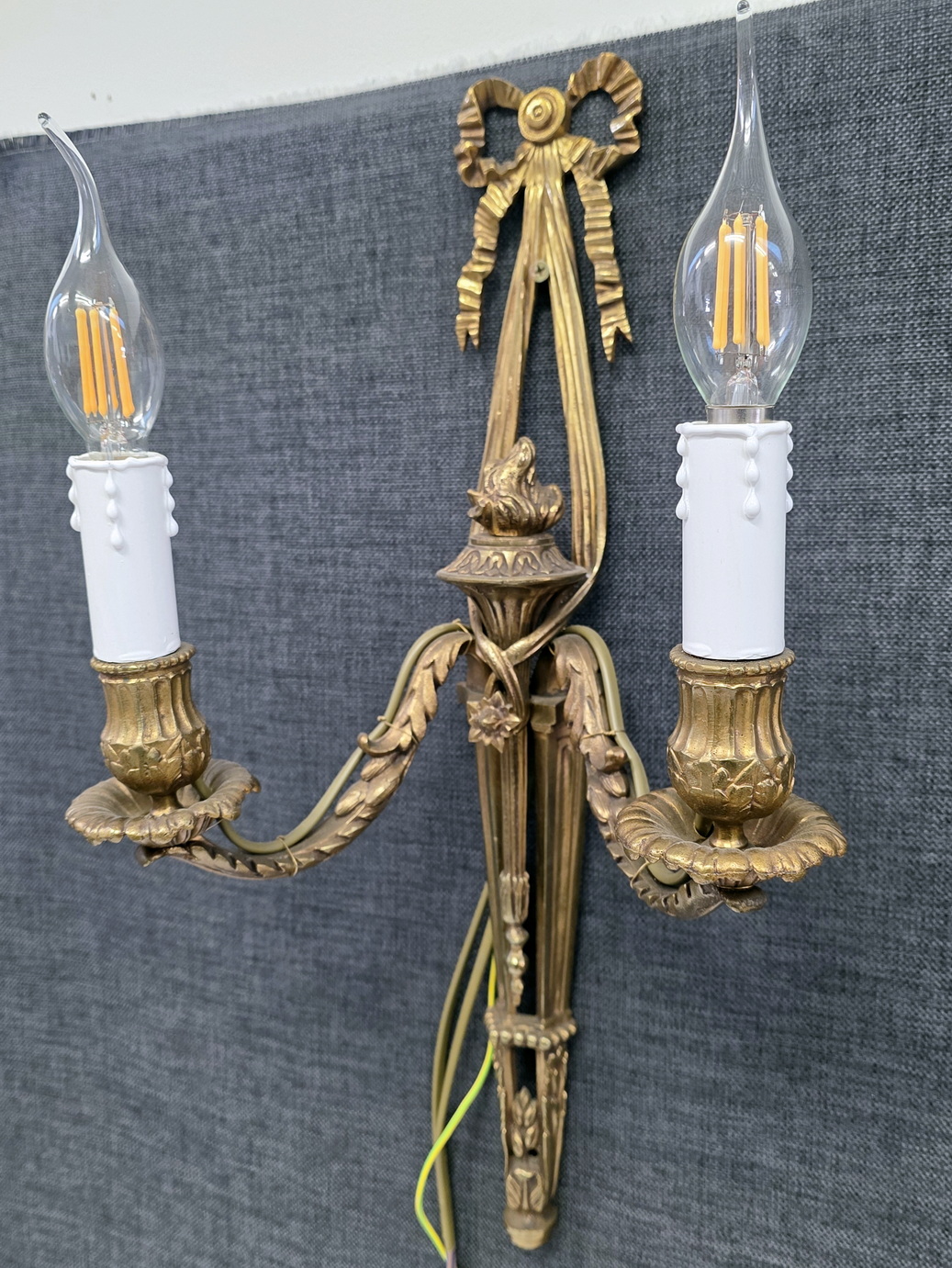 A pair of fine, early 20th century French Louis XVI style gilt brass wall lights, decorated with out-sized knotted bows, each of the pairs of arms in the shape of foliate scrolls and fitted with sconces. Please note the fine quality craftsmanship. Area of Paris, circa 1900.