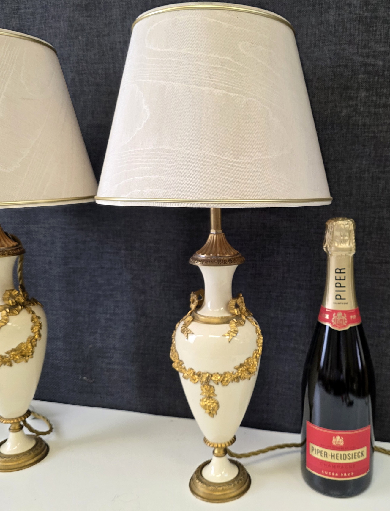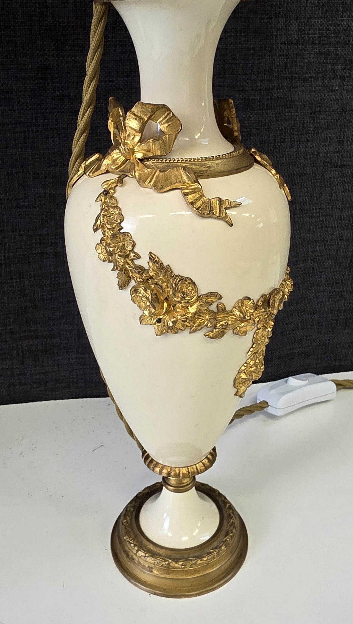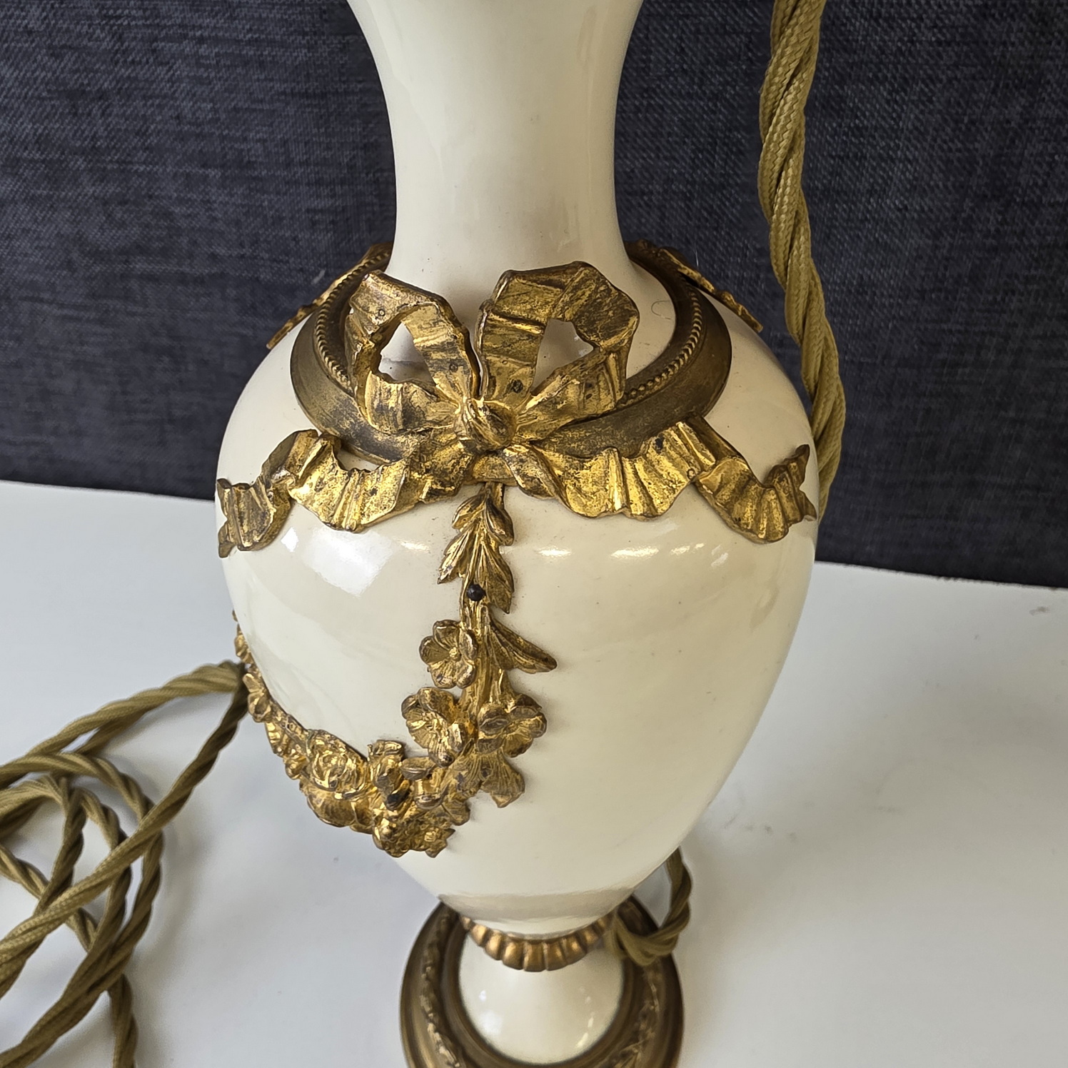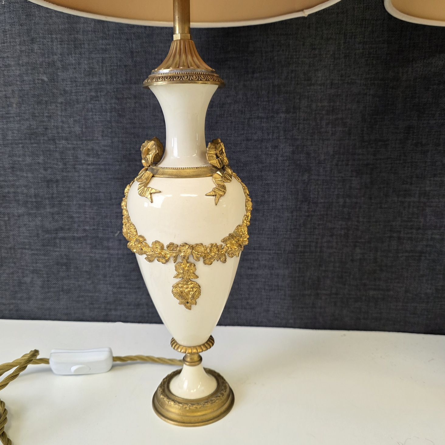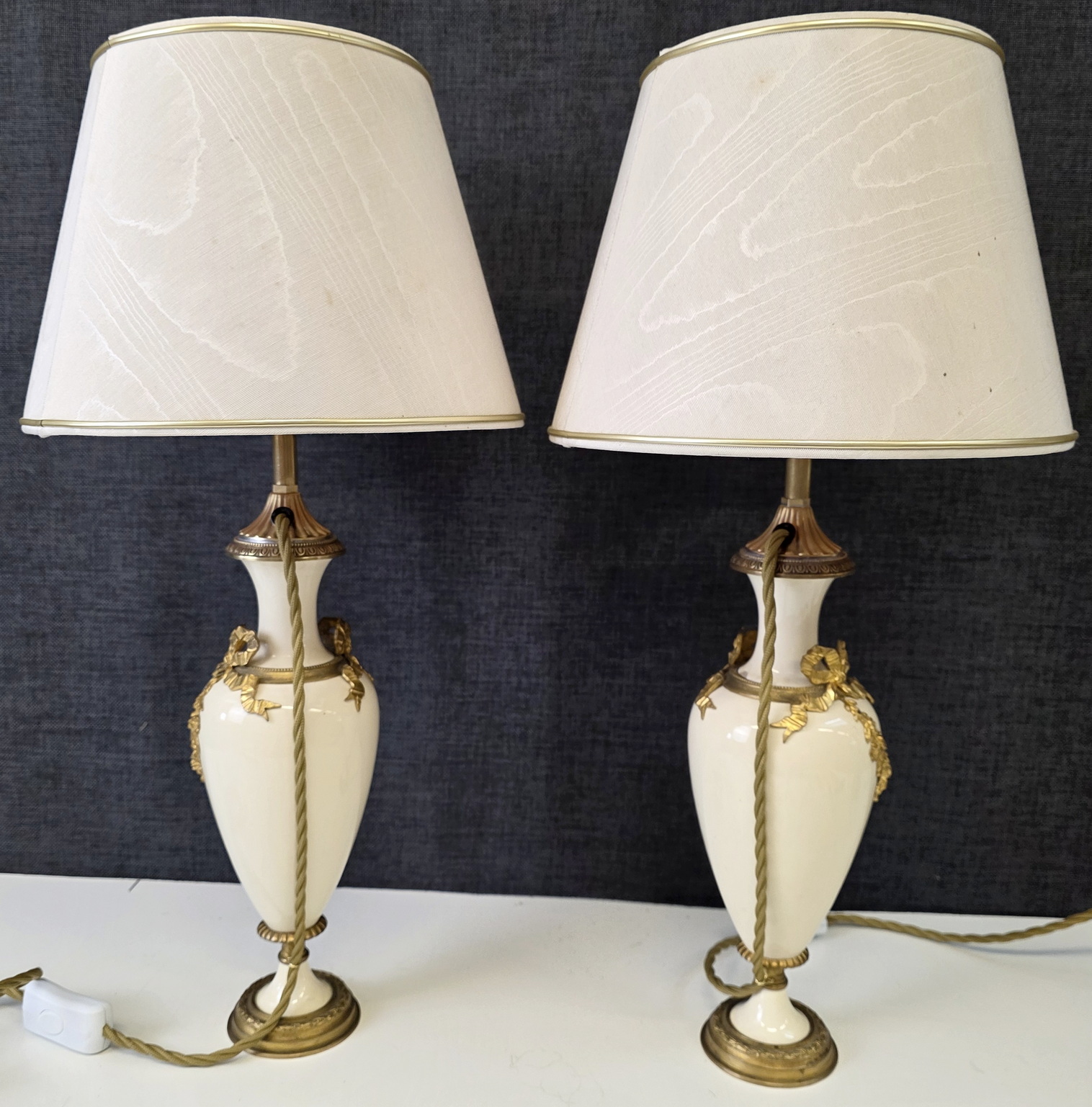A pair of 19th century French Louis XVI style, finely cast, chased and gilt bronze and turned marble 'Cassolette' urns, later made into table lamps and fitted with silk lampshades. Area of Paris, circa 1870.