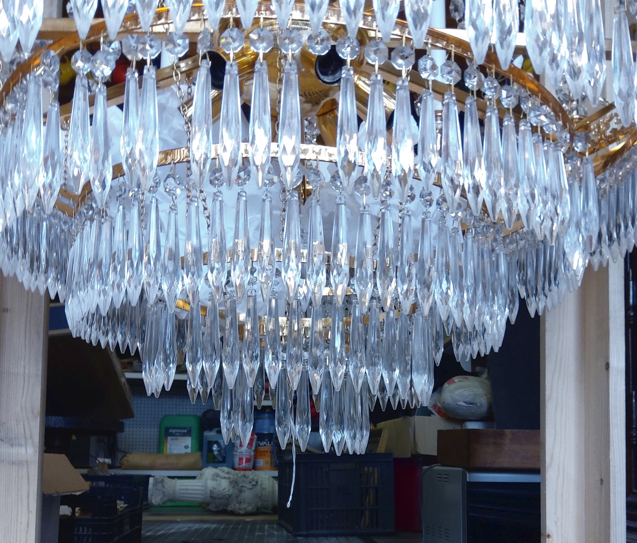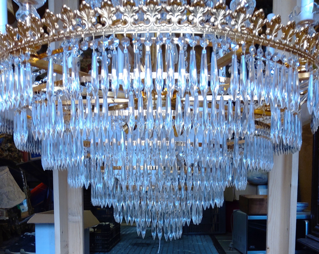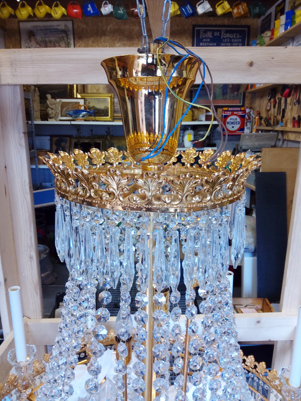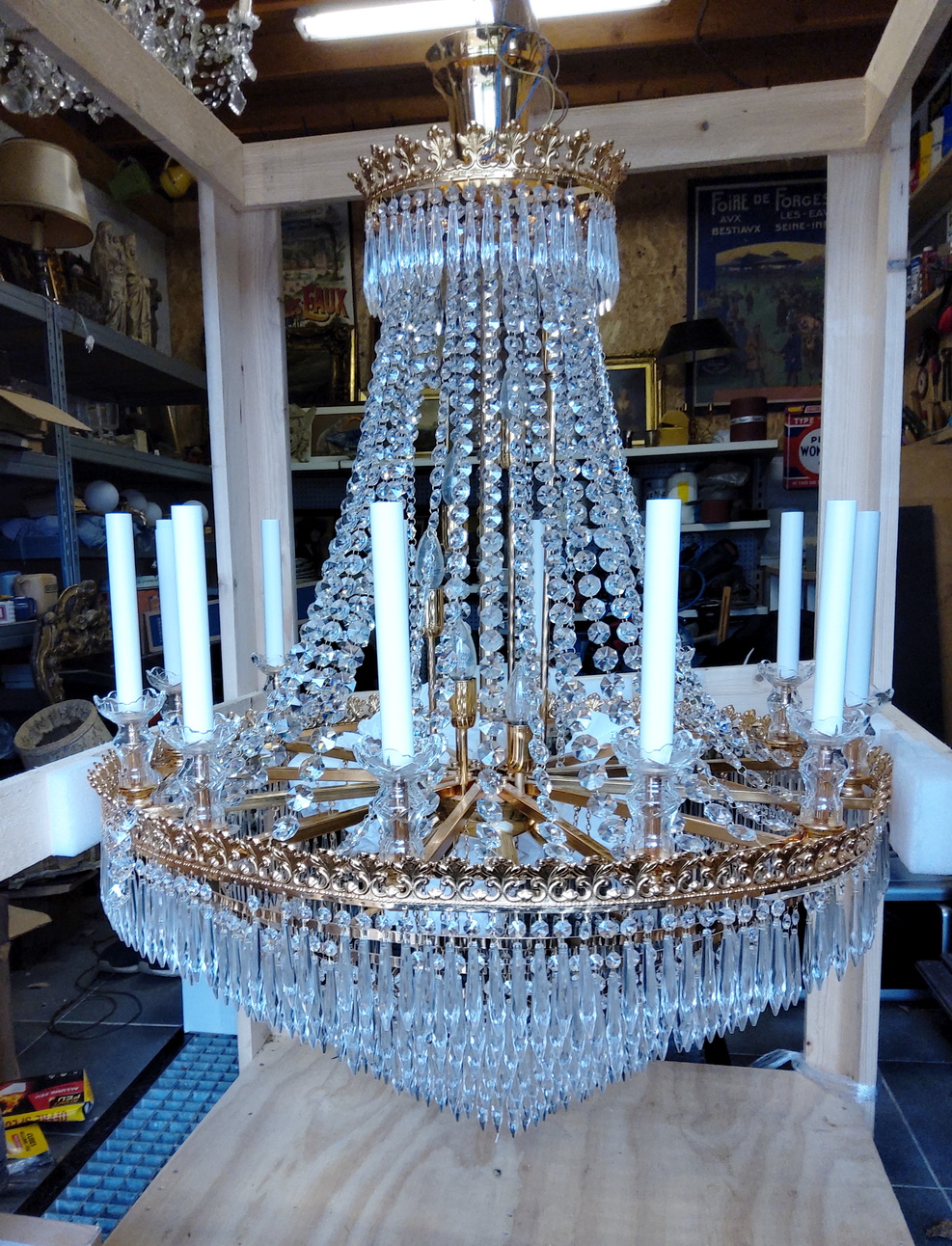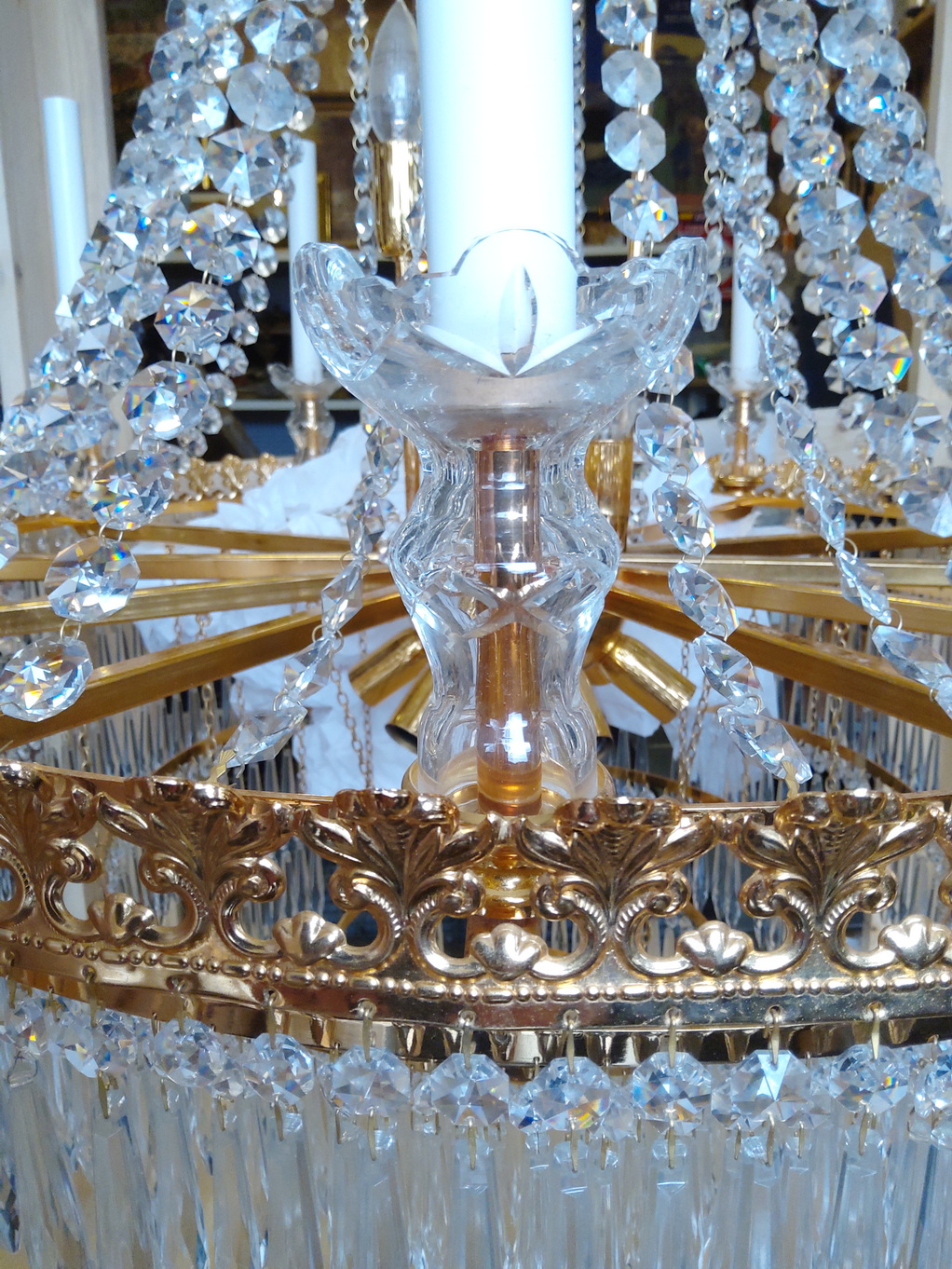 An elegant and large, vintage Parisian Louis XVI style, gilt brass and cut crystal ‘Corbeille’ (basket) chandelier, fitted with twelve external lights, each light fitted with a tall cut-crystal drip-tray. This chandelier is internally lit by six more lights, and externally is decorated with densely-arranged chains of crystal beads hanging from a 'crown' pediment, and with several tiers of 'pencil' cut crystals. Please note the fine quality of the gilt brass work. Area of Paris, circa 1970.