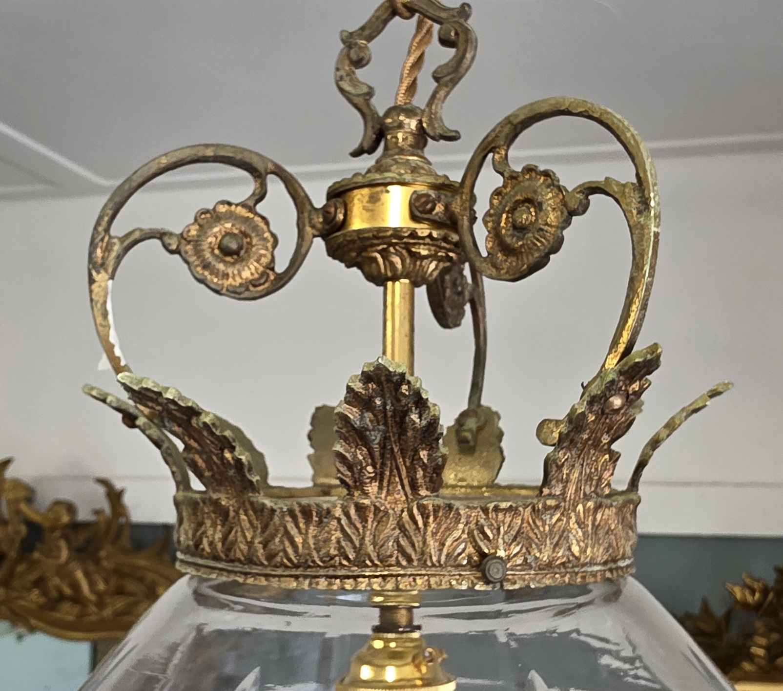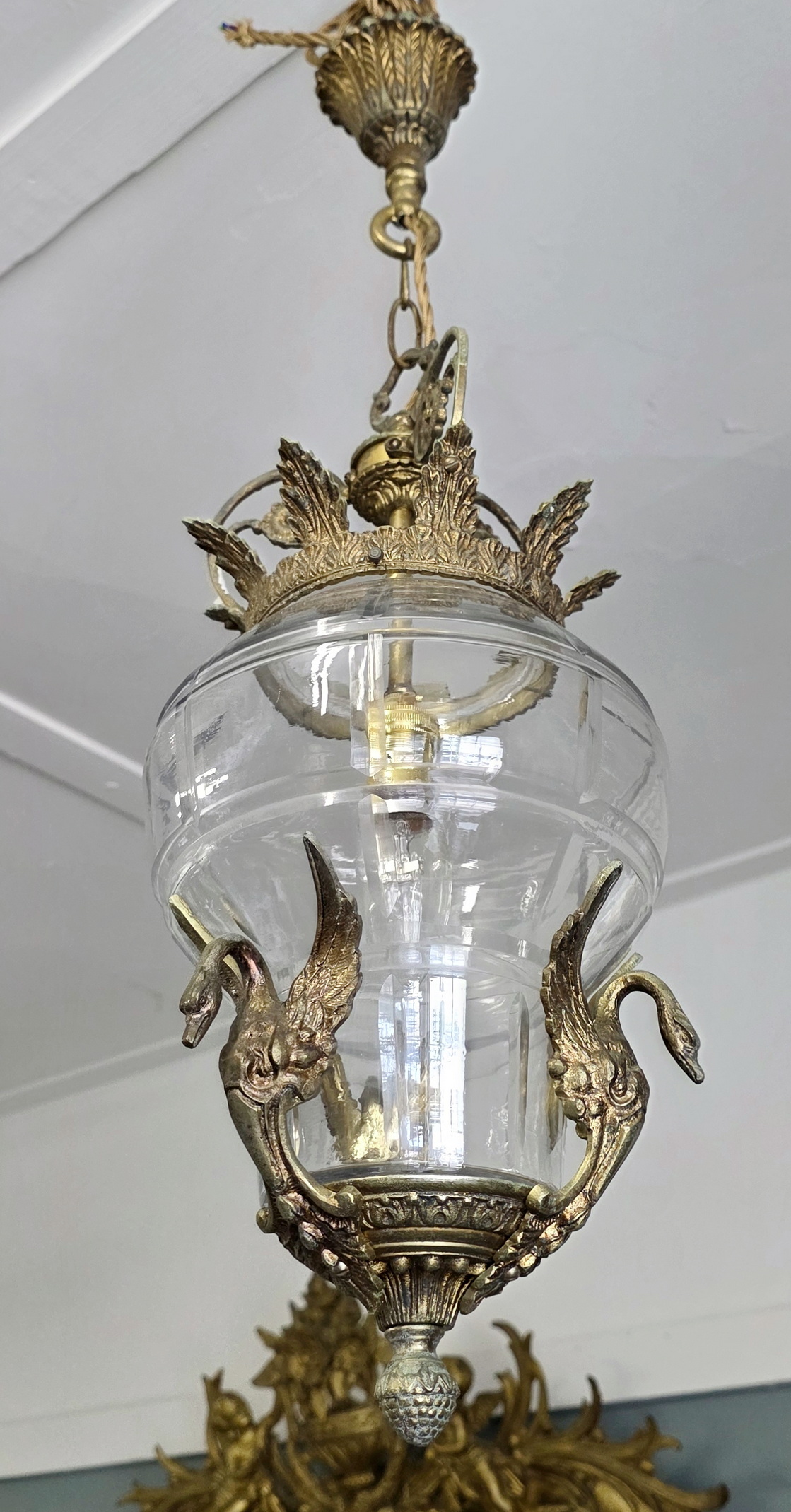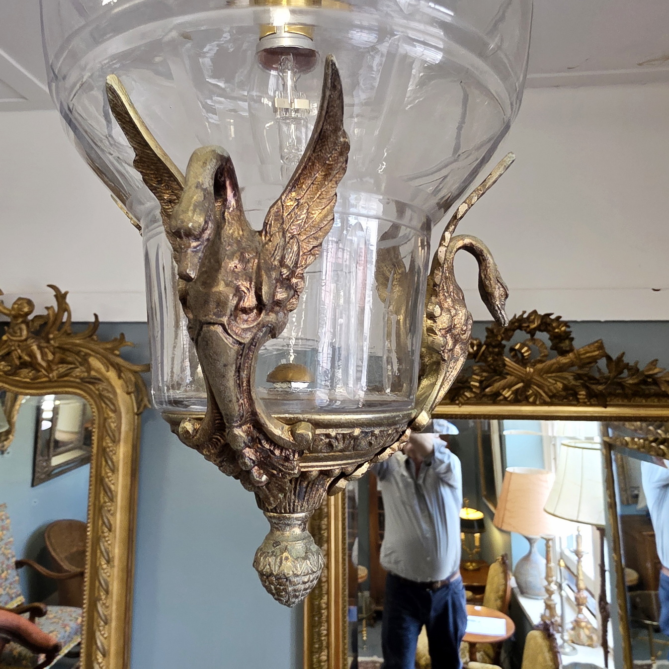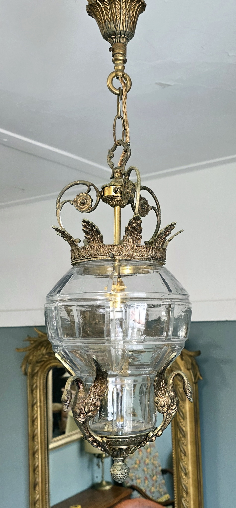 A French Empire style ceiling lantern, the pediment with elegantly scroll-work and foliate pattern crown, the plinth with a central pine cone and with swan finials, retaining the original cast, faceted glass body. Paris, circa 1950.Please note: the swan motif is a symbol of Josephine Bonaparte. It refers to the black swans that the navigator Nicolas Baudin (1754-1803) brought back to France from South Australia, and which Josephine Bonaparte took for her aviary at the 'Château de Malmaison'.