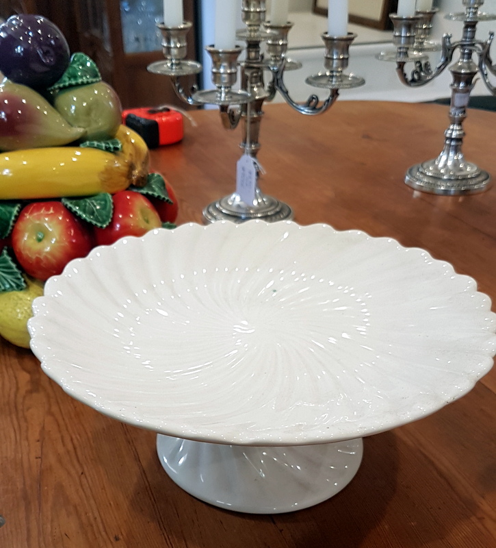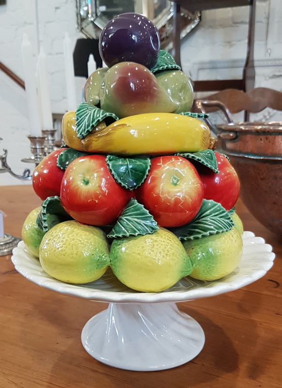 An early 20th century French majolica table decoration in the shape of a circular white bowl on a pedestal, with a pile of lemons, apples, bananas, pears and topped by a plum, interspersed with leaves. France, circa 1930.