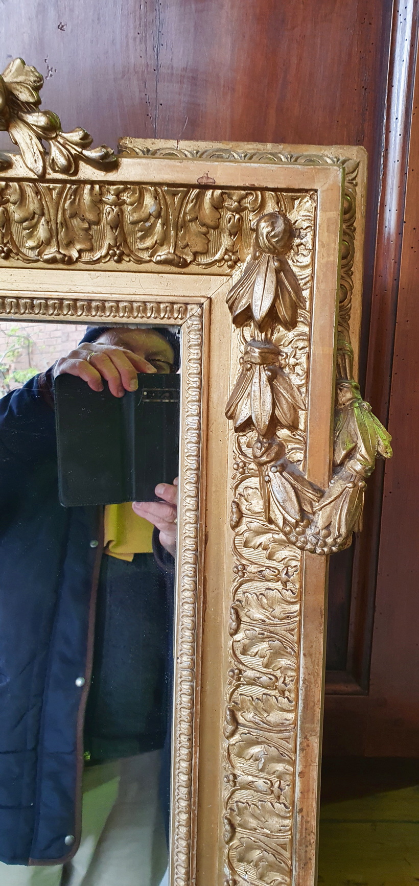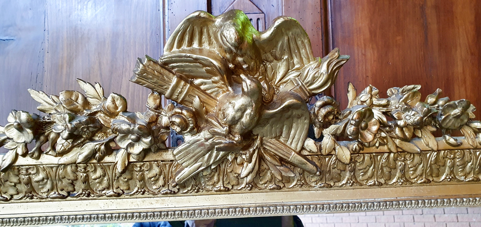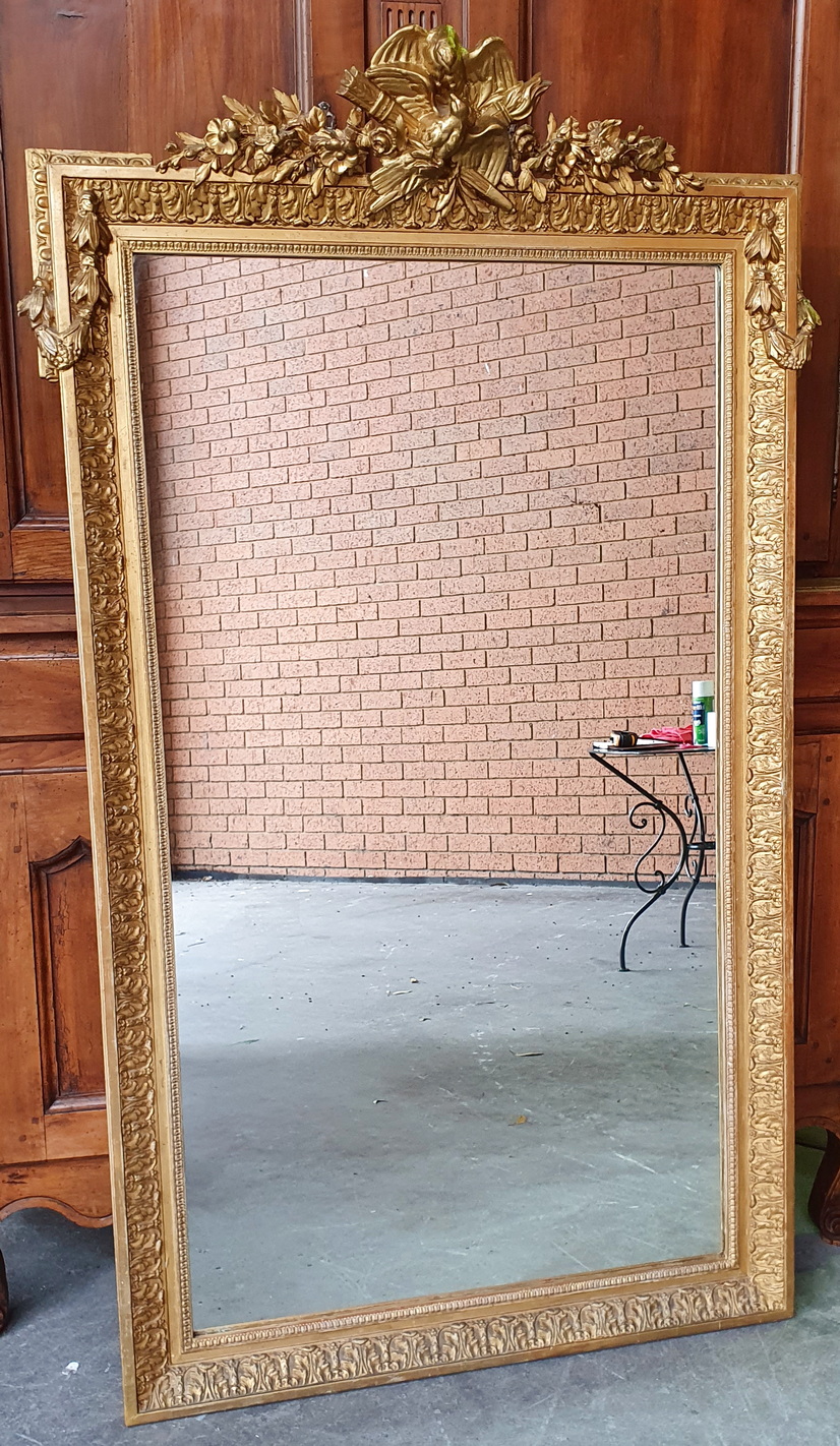 A 19th century French Napoleon III period, Louis XVI style gilt mirror of fine quality and of elegant proportions, the frame decorated with large acanthus leaf mouldings, surmounted by a crest decorated with an allegorical 'Torch & Quiver' motifs, allegories for the 'Flame of Passion' and the piercing 'Arrows of Intelligence', and also with a pair of 'Cooing Birds', an allegory for 'Romance'. The top corners of the mirror are festooned with swags of laurel leaves and trellises of flowers. Retaining the original gilding and the original mirror plate. Area of Paris, circa 1860.