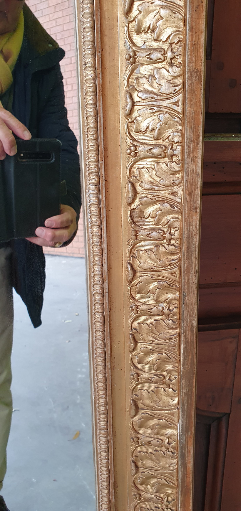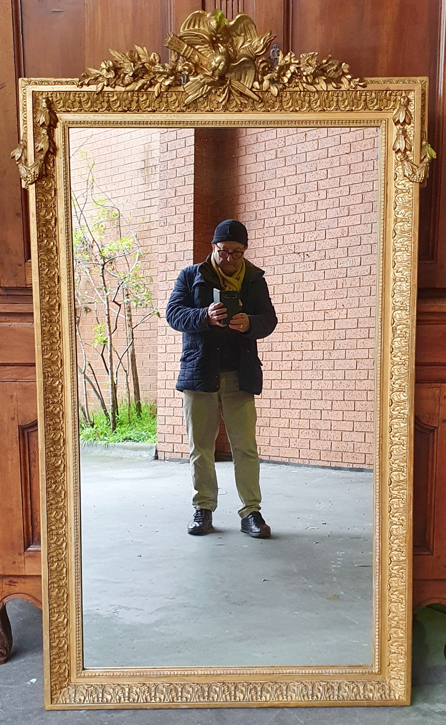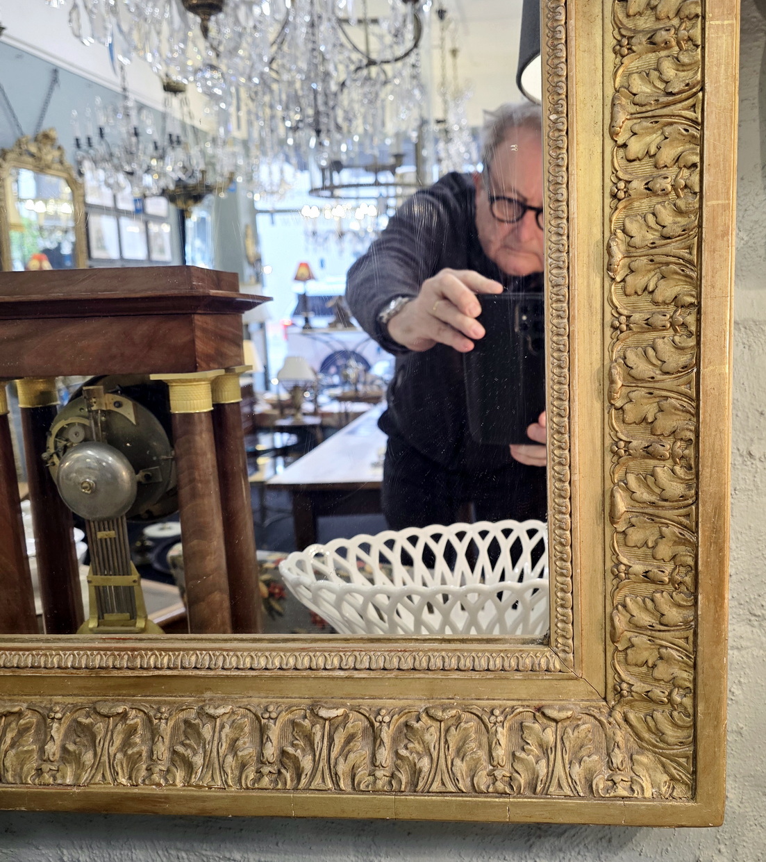 A 19th century French Napoleon III period, Louis XVI style gilt mirror of fine quality and of elegant proportions, the frame decorated with large acanthus leaf mouldings, surmounted by a crest decorated with an allegorical 'Torch & Quiver' motifs, allegories for the 'Flame of Passion' and the piercing 'Arrows of Intelligence', and also with a pair of 'Cooing Birds', an allegory for 'Romance'. The top corners of the mirror are festooned with swags of laurel leaves and trellises of flowers. Retaining the original gilding and the original mirror plate. Area of Paris, circa 1860.