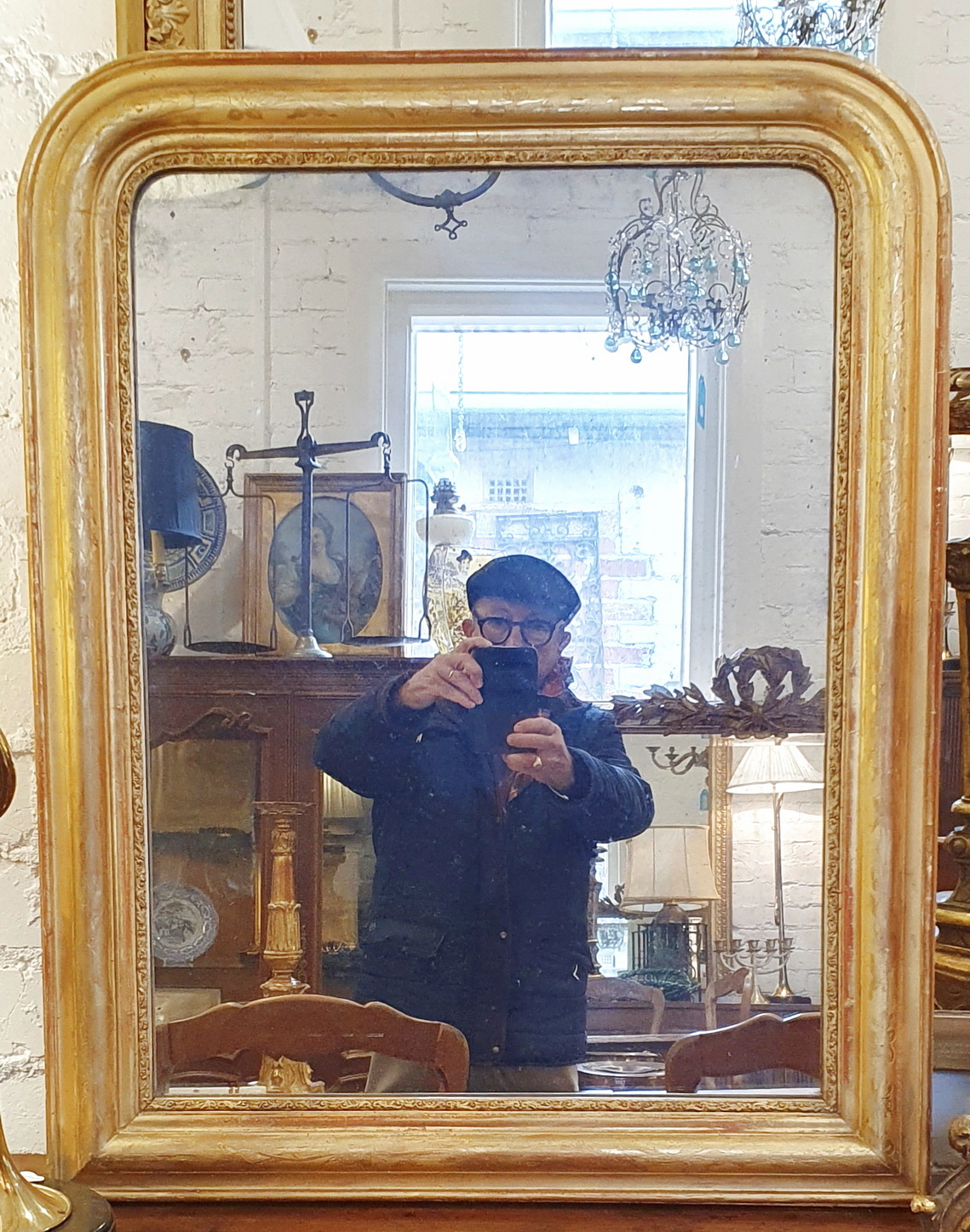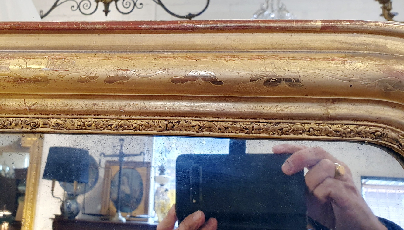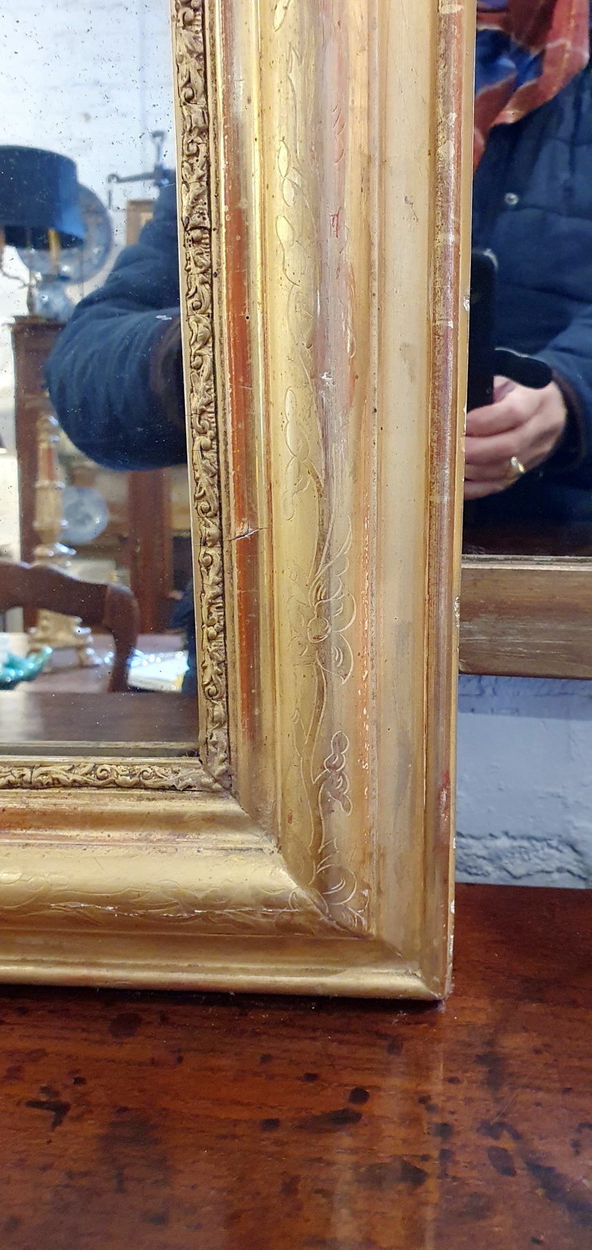 An early 19th century French Louis Philippe period gilt mirror, the gilt frame decorated with ogee mouldings, stylised foliate mouldings and with etched foliate patterns, the original gilt finish nicely worn. Fitted with its original mirror plate. Area of Paris, circa 1830.
