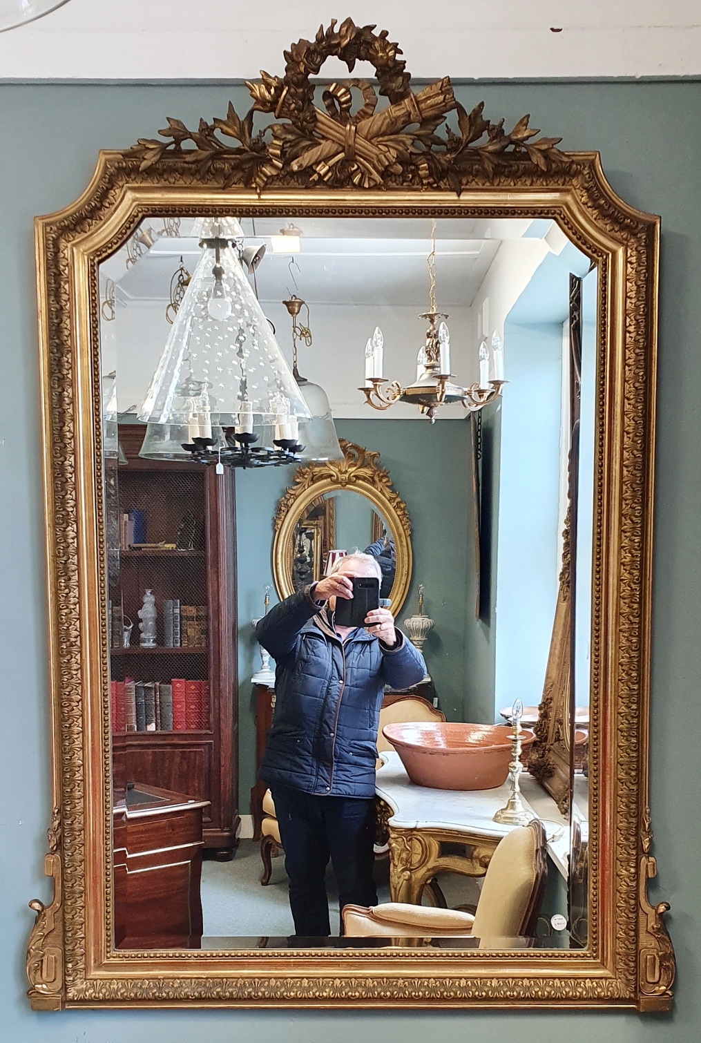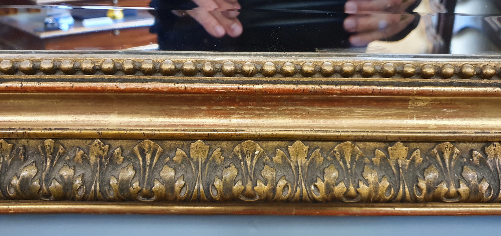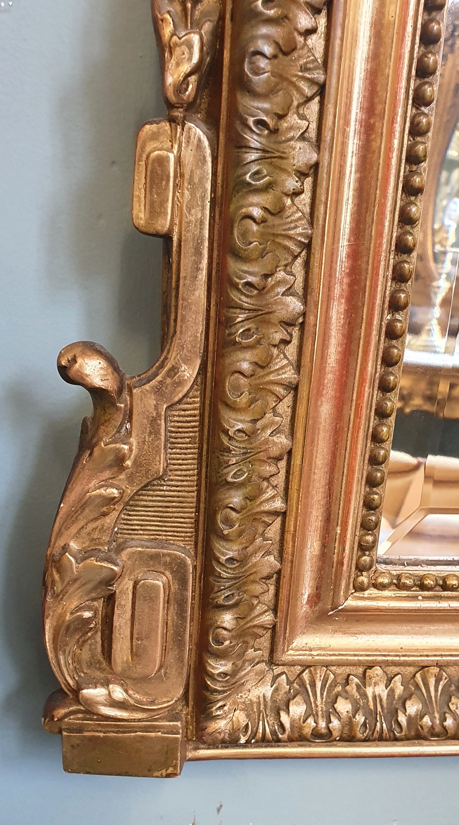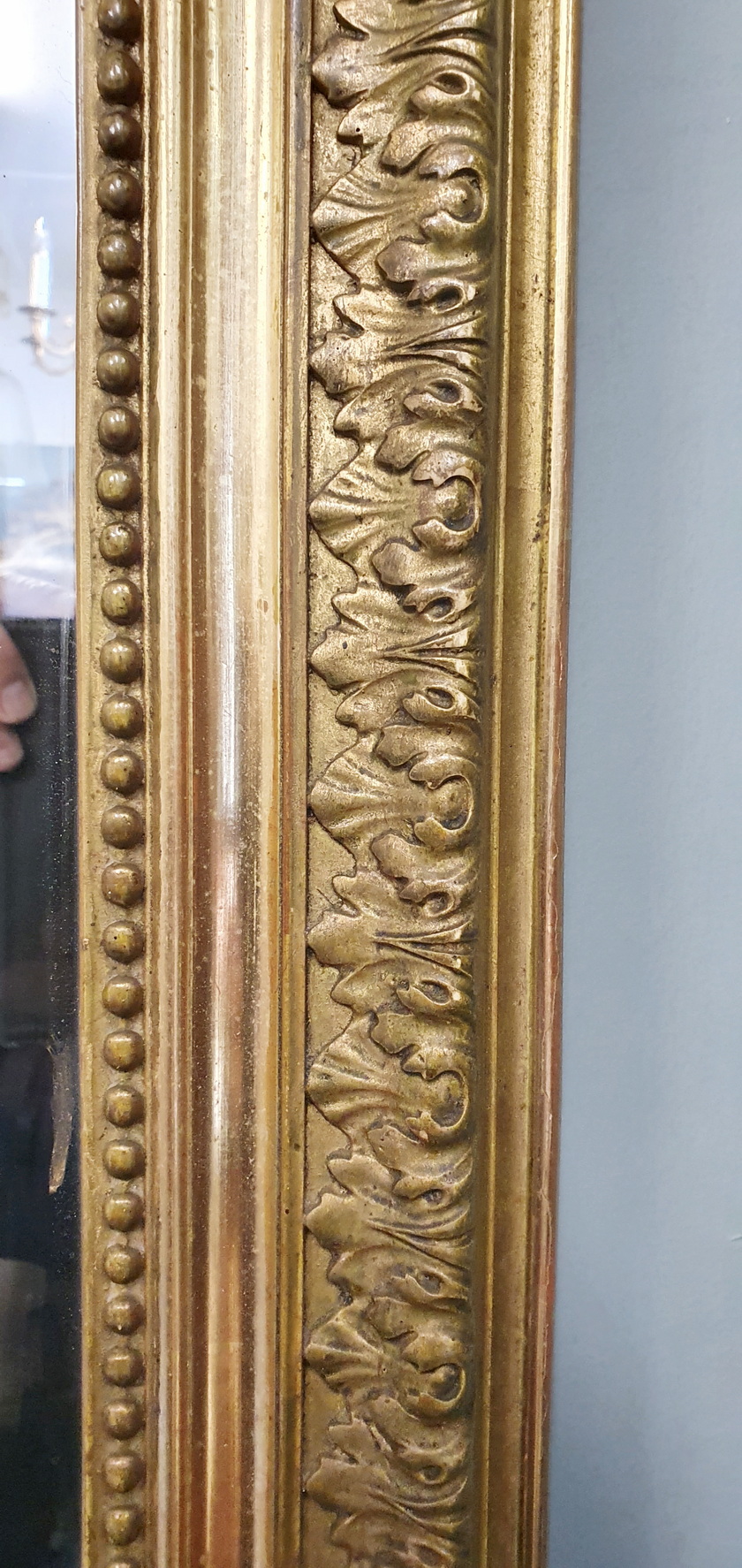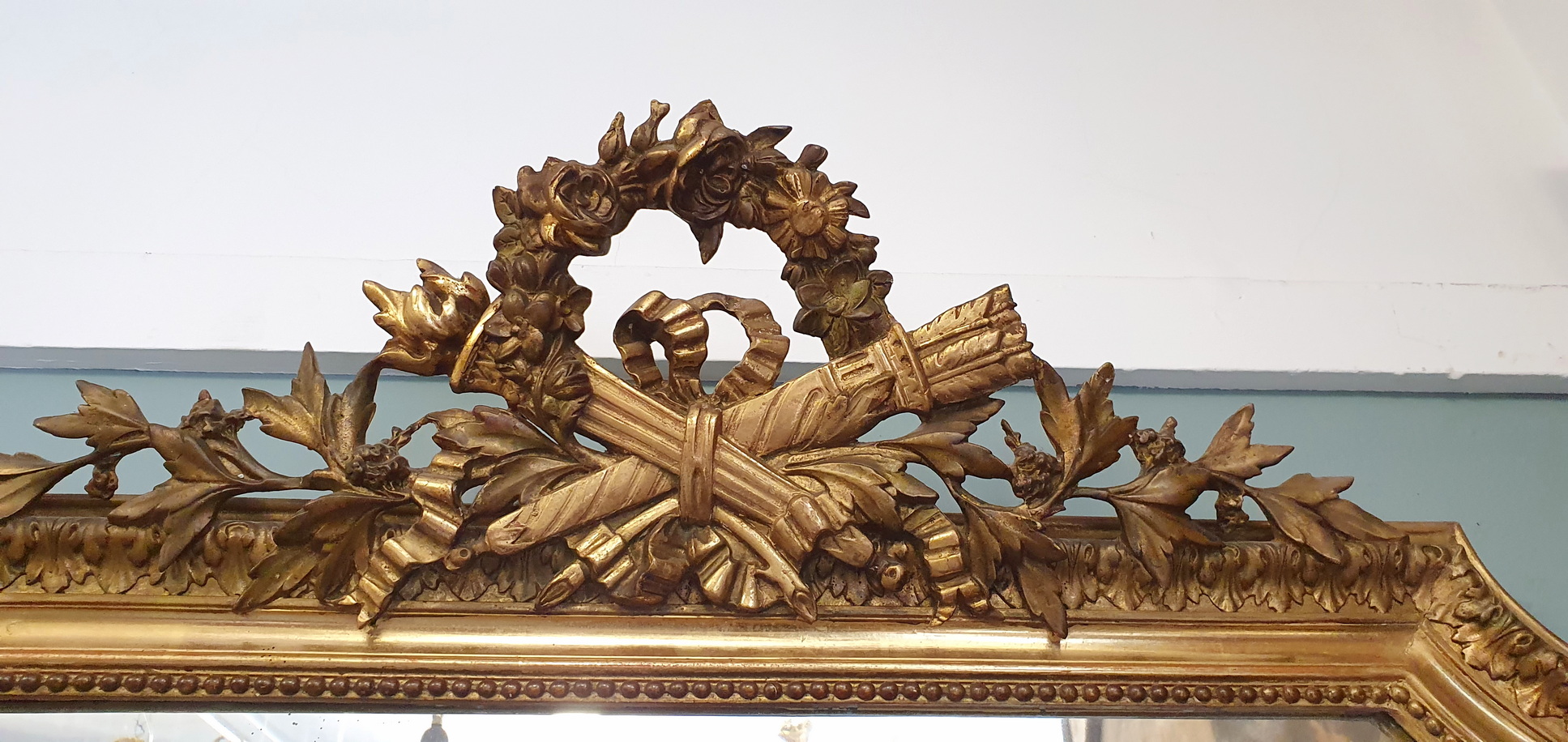 A fine, Parisian quality, 19th century French Napoleon III period, gilt pastille-work Louis XVI style mirror, the allegorical pediment with chamfered corners, surmounted by an out-sized laurel wreath (an allegory for Success) and with crossed quiver and torch (an allegory for Passion and Intelligence), the mirror frame is decorated with Classic acanthus leaf and string-of-pearl patterns. Retaining the original, hand-bevelled mirror plate. Paris, circa 1870.