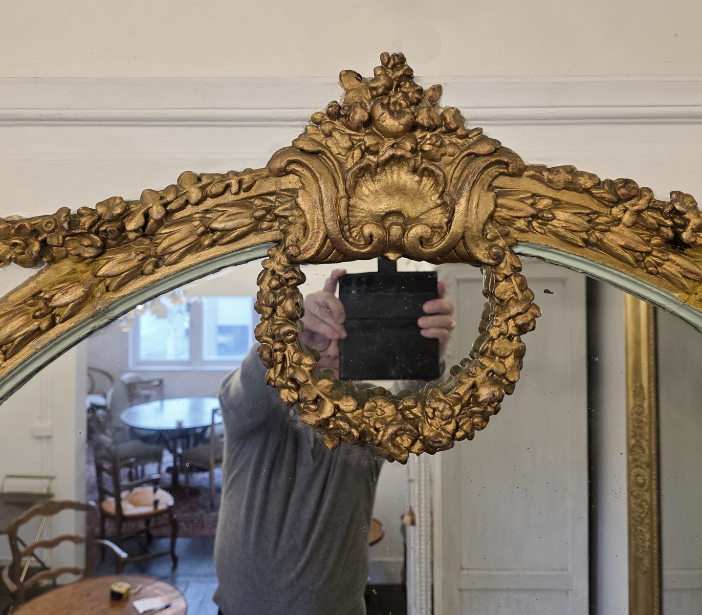 A 19th century French Louis XVI style 'Trumeau' mirror decorated with a pediment festooned with swags of flowers, the mouldings around the arched mirror decorated with wreaths of acanthus leaves. Retaining the original mirror plate. Area of Paris, circa 1880.