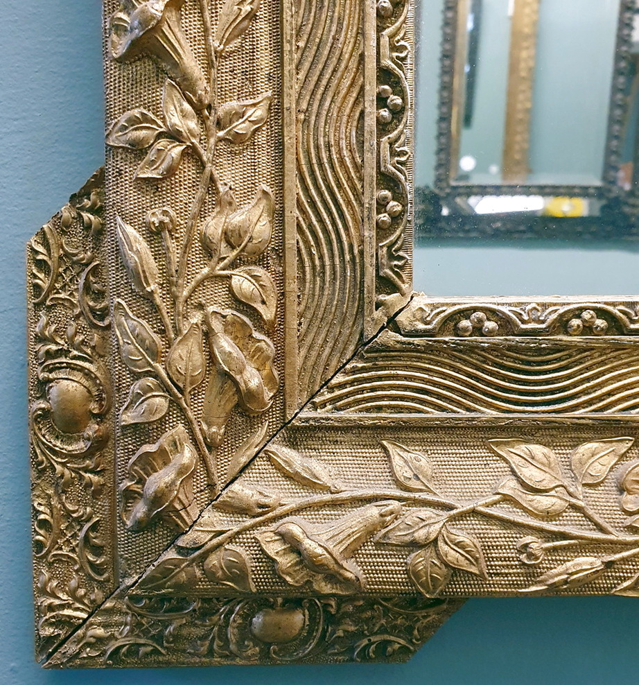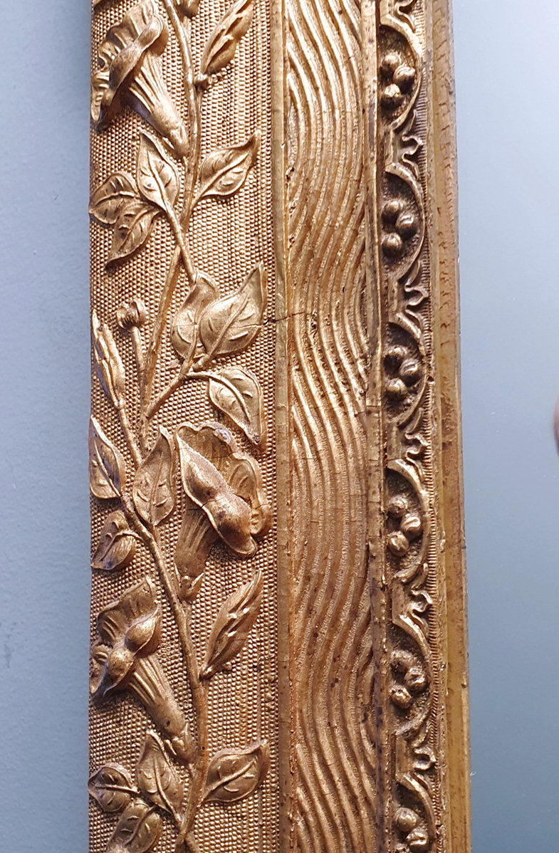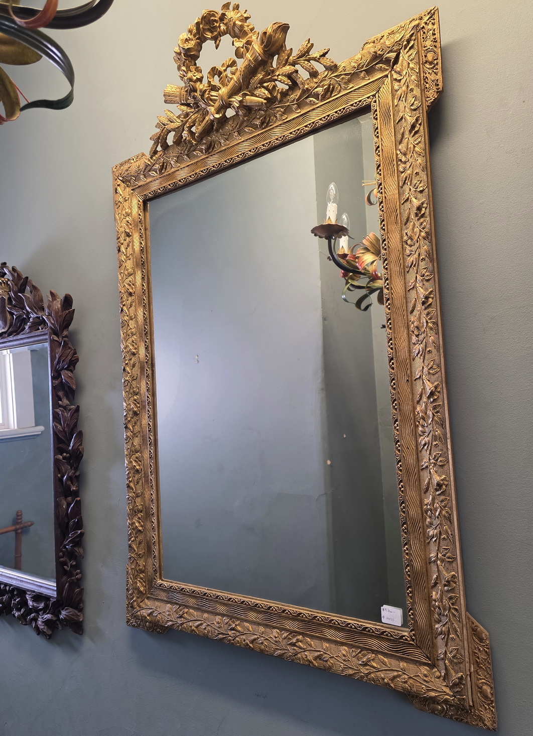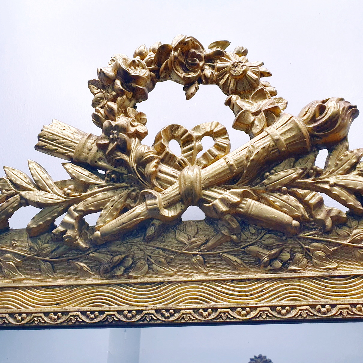 A 19th century French Louis XVI style gilt 'Allegorical' mirror, the frame decorated with stepped corners, with Guilloche moulding patterns and with raised trellises of flowers and leaves. Surmounted by an out-sized floral wreath, laurel fronds (an allegory for Success) and with a knotted bow (an allegory for a Family's Union), around a crossed torch and quiver motif (allegories for the Flame of Passion and the Piercing Arrow of intelligence). Retaining the original mirror plate. Please note the wonderfully soft, original colour of the gilt finish. Area of Paris, circa 1880.