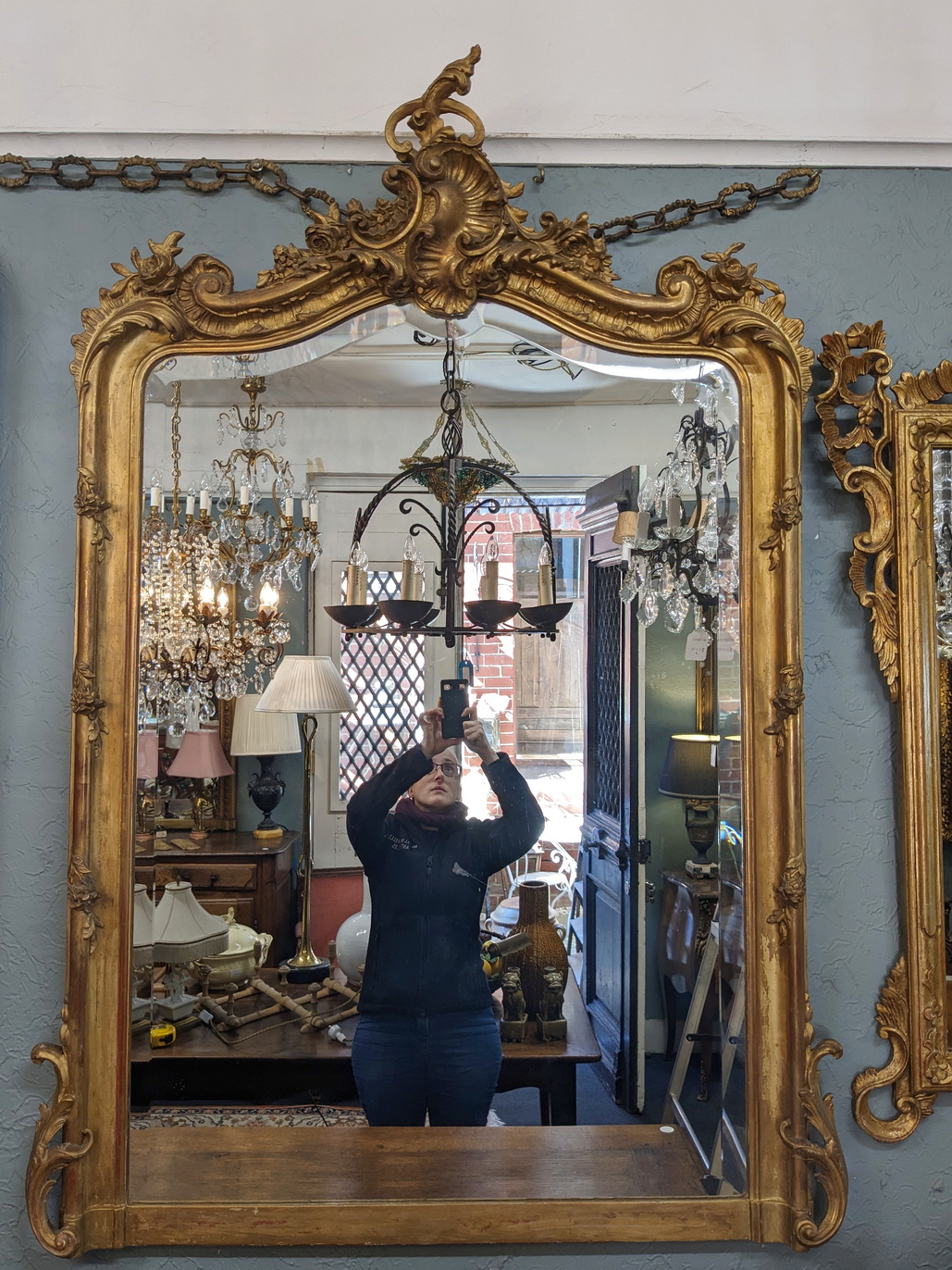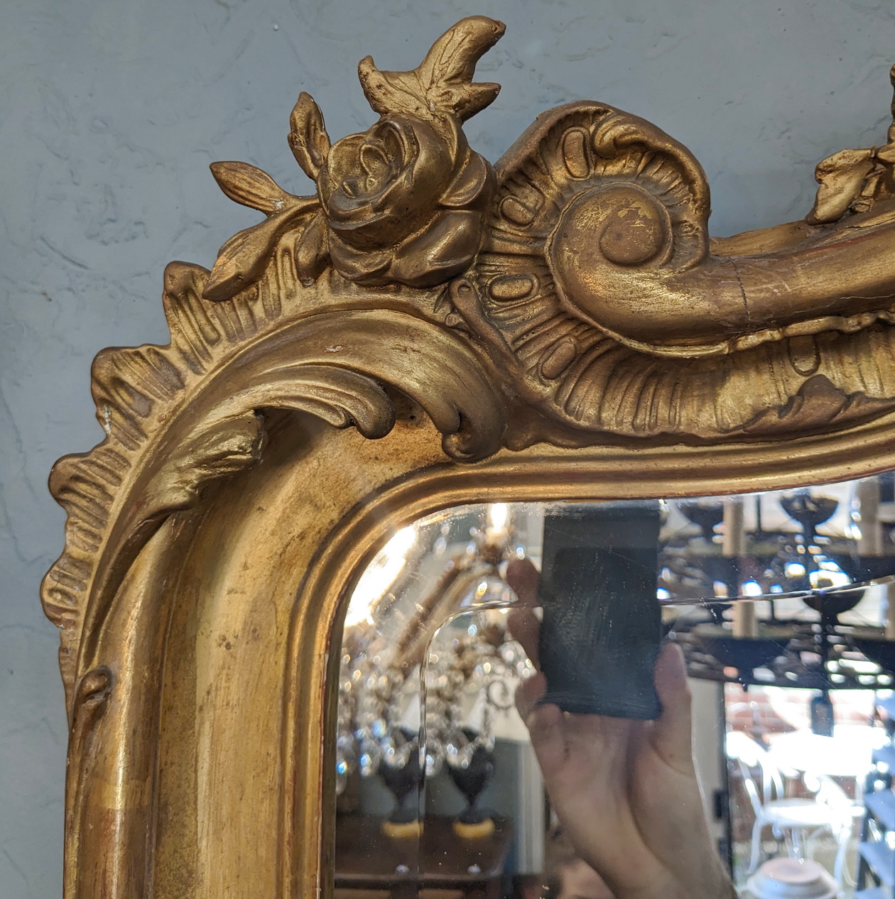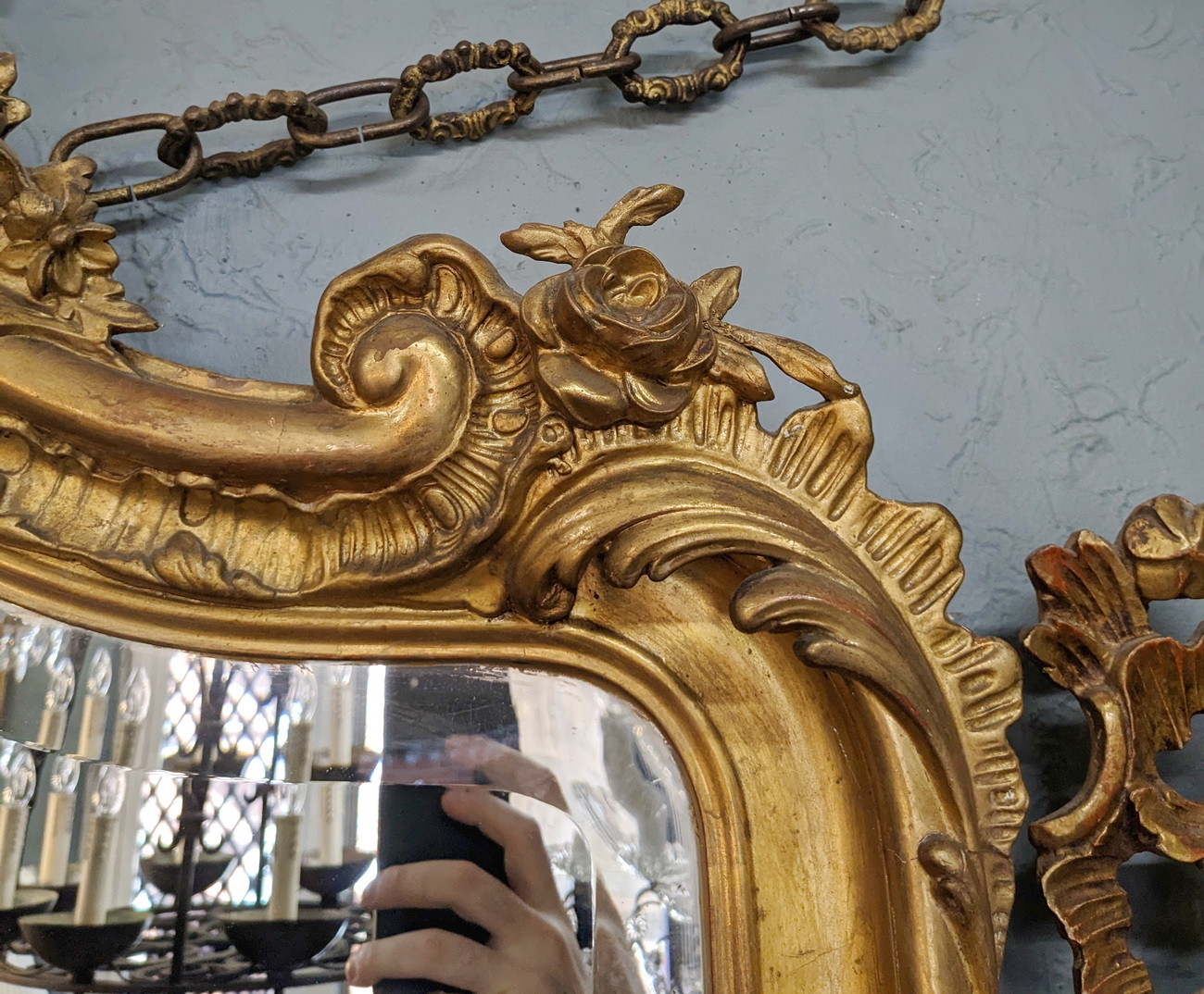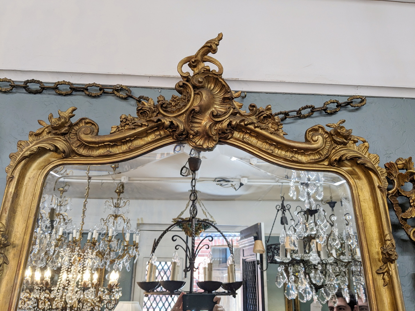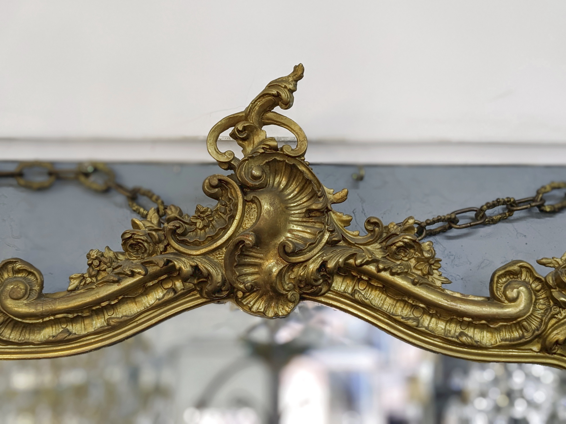A 19th century Napoleon III period, Louis XV style gilt mantle mirror, the water-gilded frame decorated with foliate trellises and with stylised foliate and Rocaille motifs, the plinth with large foliate corbels. The elegantly shaped crest decorated with a large Rocaille Cartouche. Fitted with the original shaped and bevelled mirror plate. Area of Paris, circa 1870.