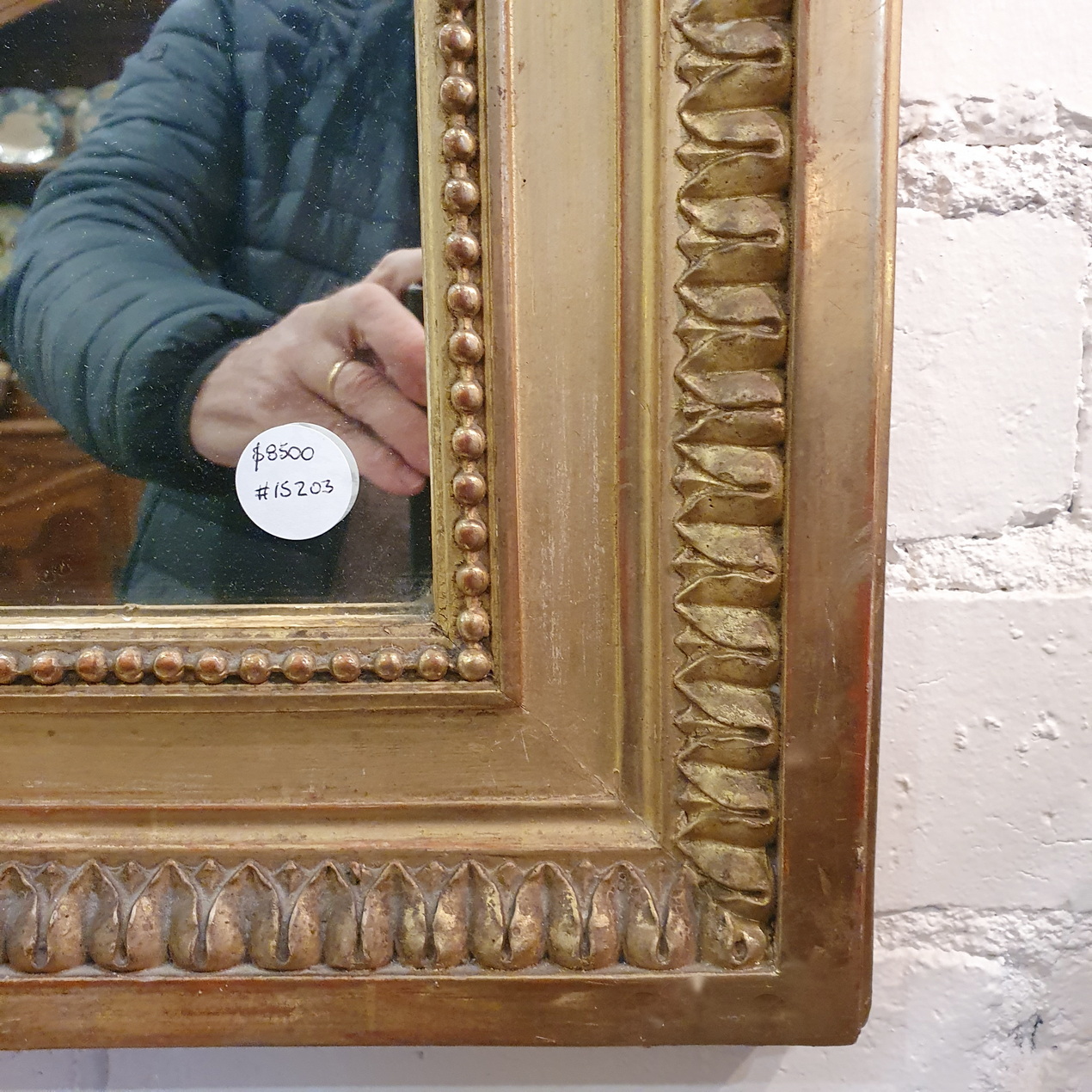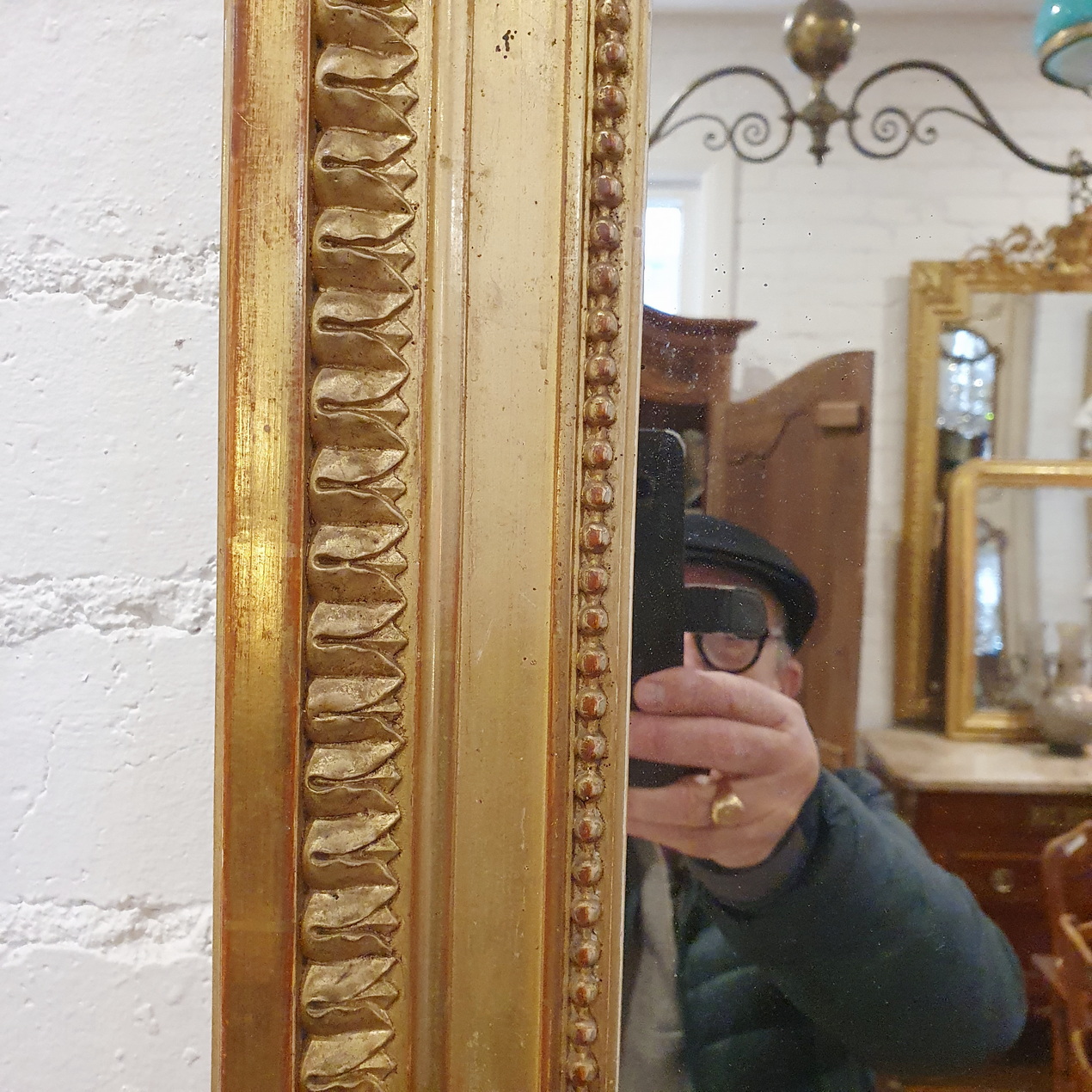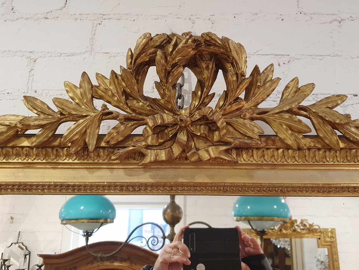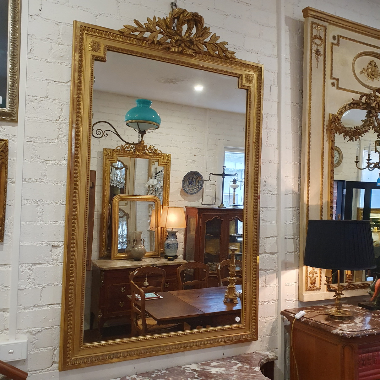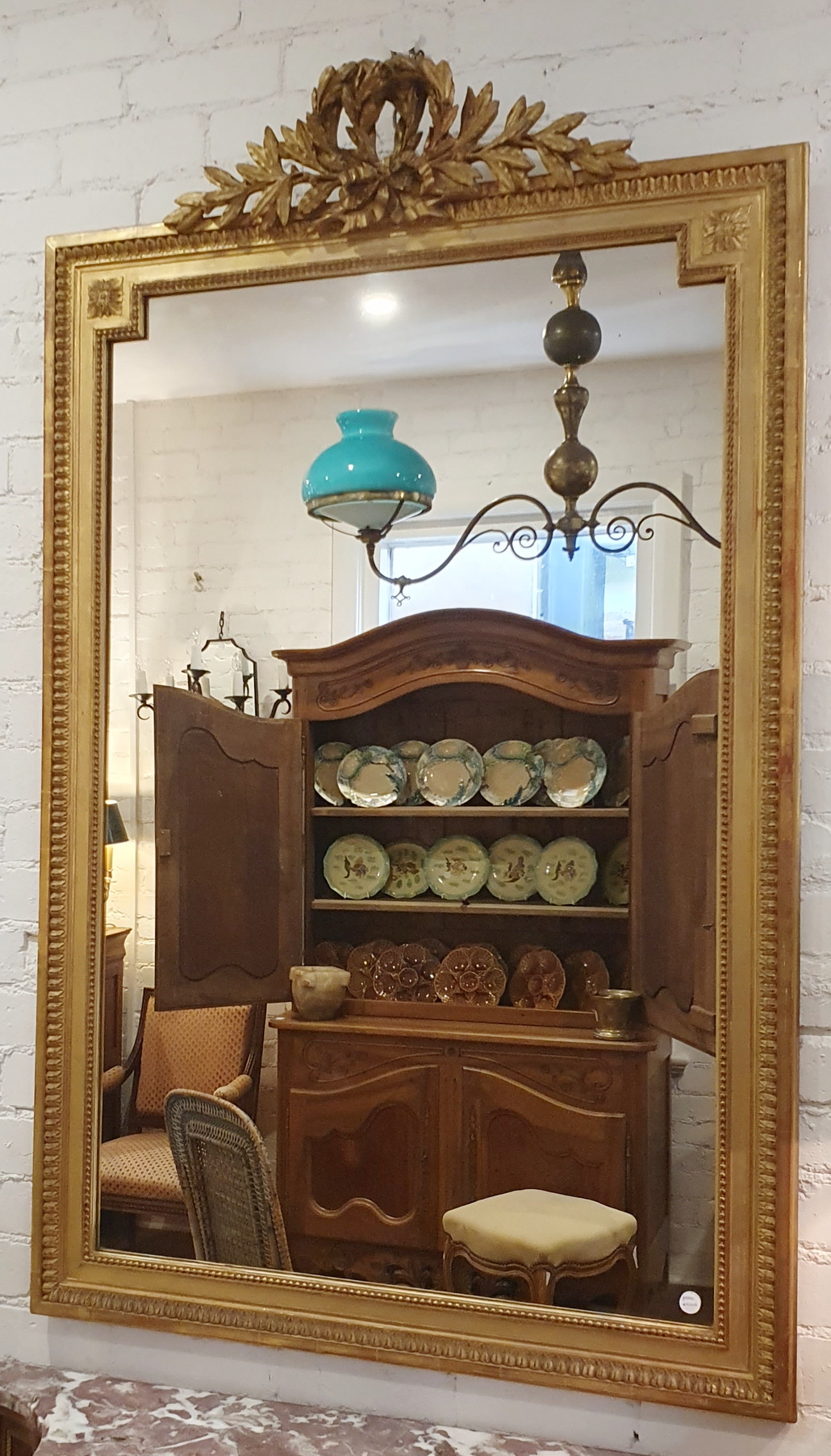 A fine Napoleon III period, French Louis XVI style mirror, surmounted by a large crest decorated with an outsized double-wreath and a knotted bow, and decorated with paterae, stylised acanthus leaf and string-of-pearl mouldings. Retaining its original mirror plate. Area of Paris, circa 1860.
