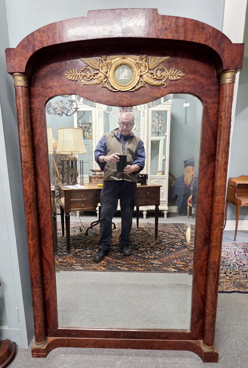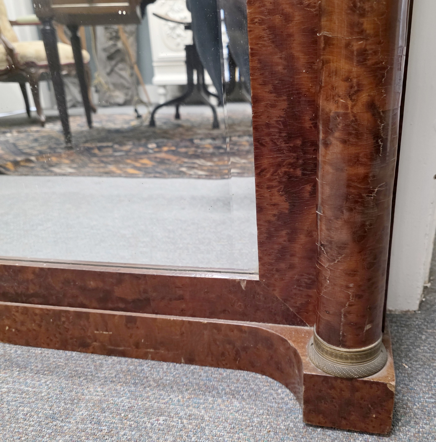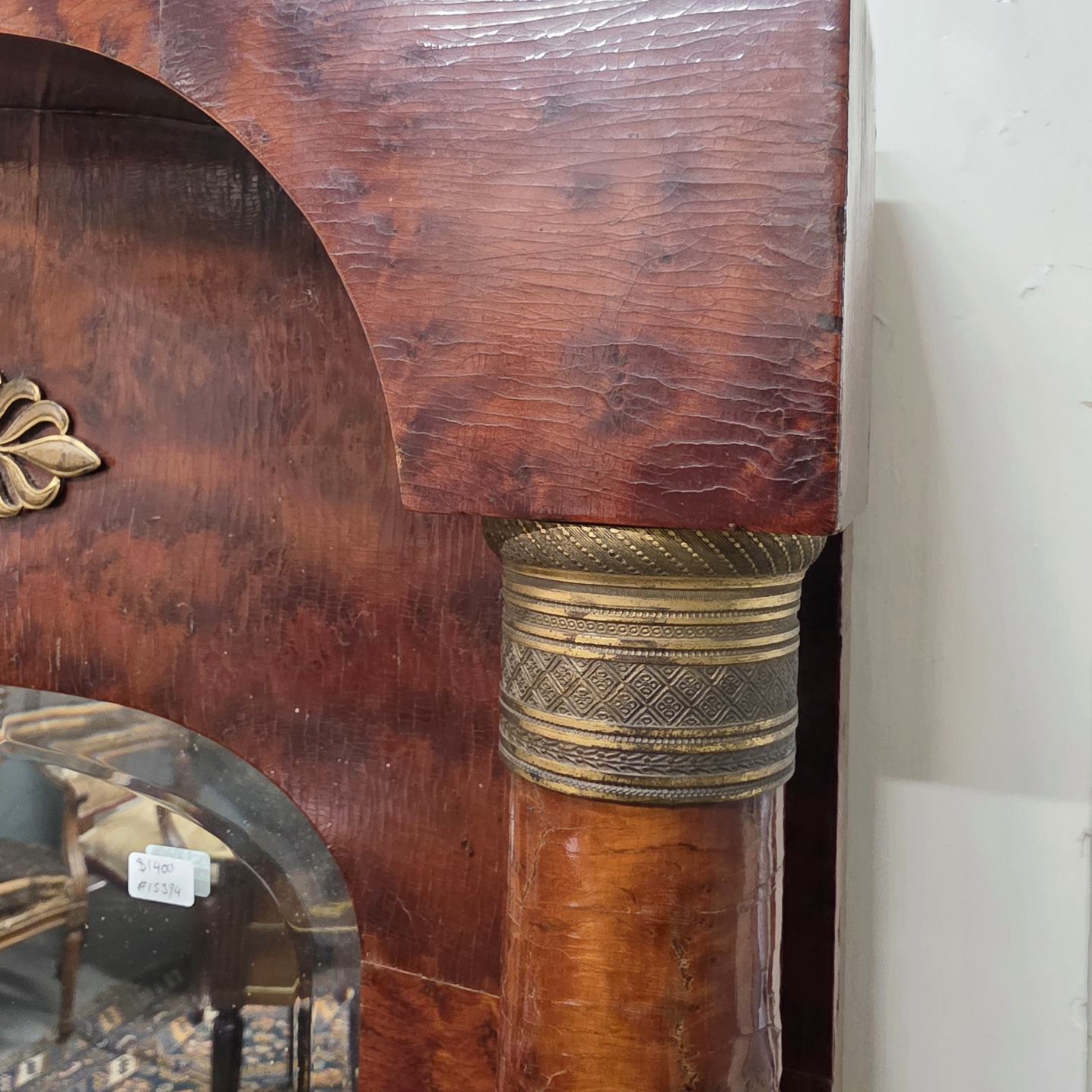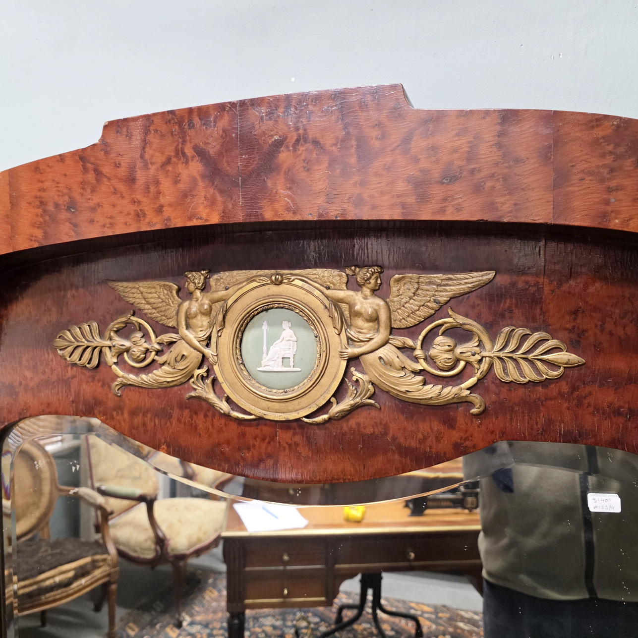 A large, early 20th century French Empire style mahogany and gilt brass mounted mantle mirror, the temple-shaped frame decorated with pilasters and gilt capitols and plinths, an arched pediment decorated with gilt brass 'Winged Victories' flanking a central, Neoclassical style Sevres porcelain plaque. Retaining its original, shaped and bevelled mirror. Area of Paris, circa 1930.