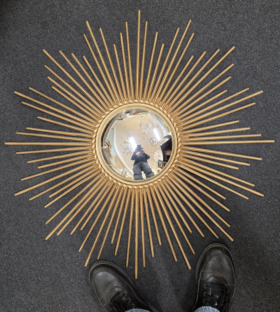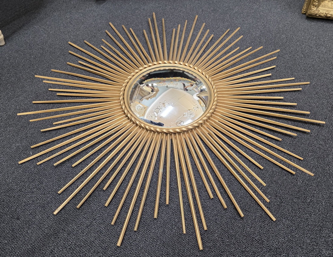 A mid 20th century French pressed and gilt 'tole' (tin) sunburst mirror, the rays arranged in alternate long and short lengths, to give the mirror a ‘pulsating’ feel. Fitted with its original convex mirror. Area of Paris, circa 1950.