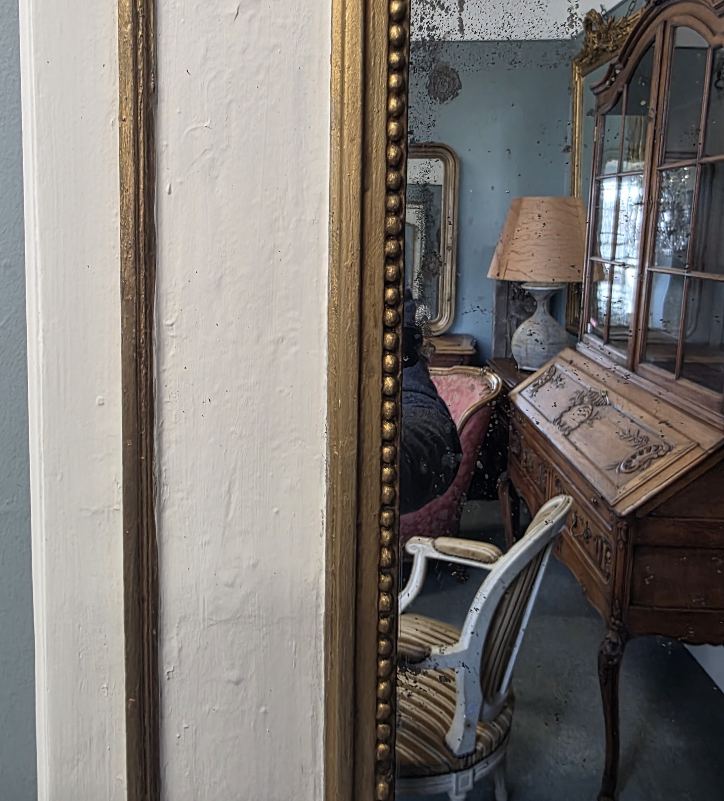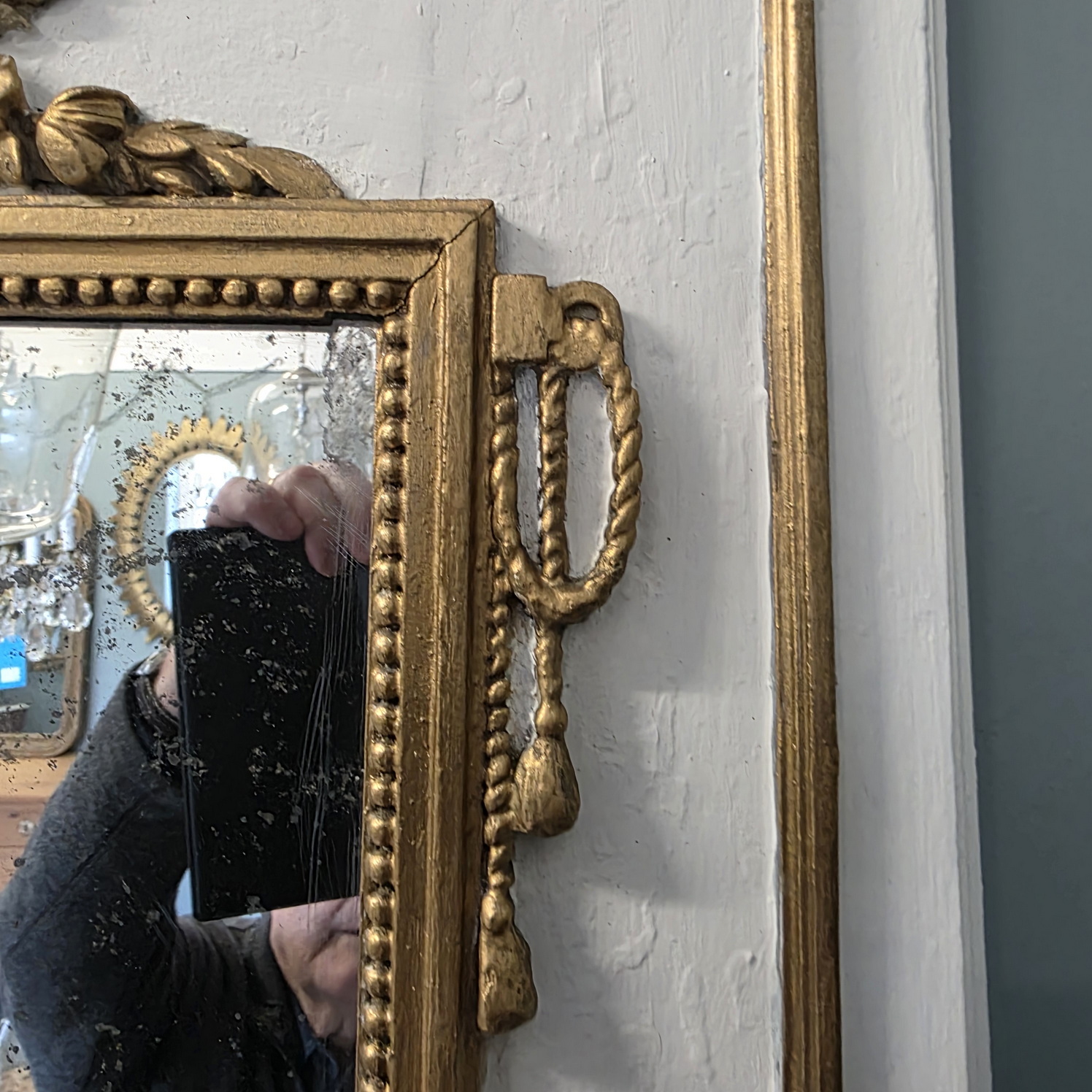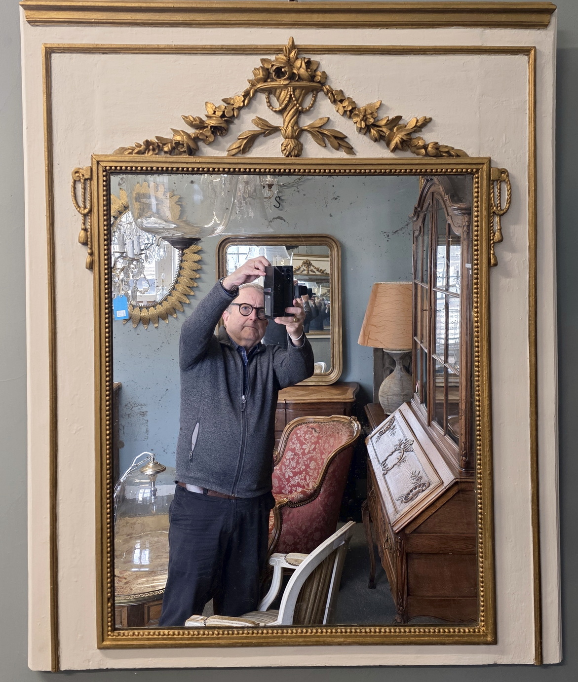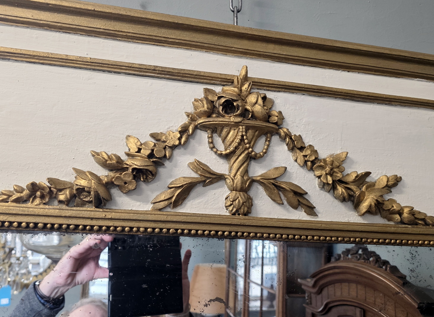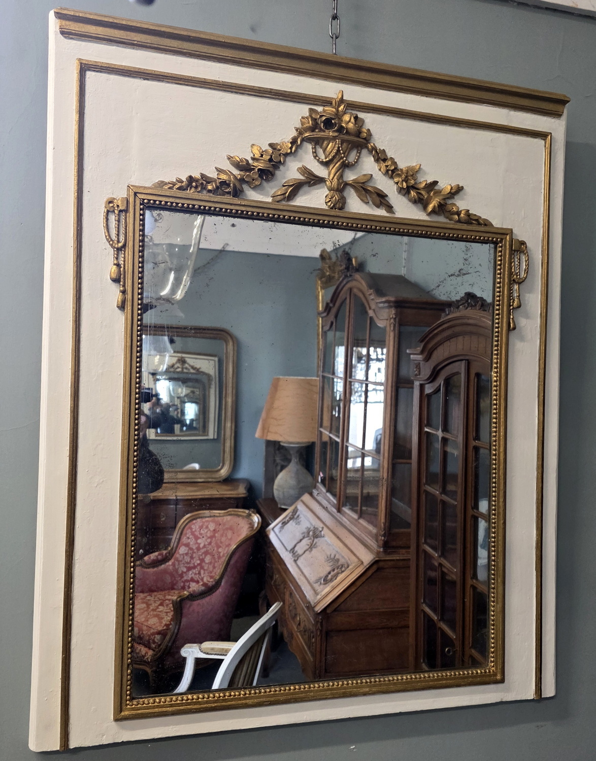 An 18th century French Louis XVI period 'Trumeau' mirror of very good, Neoclassical proportions, the frame is decorated with string-of-pearl pattern mouldings, the pediment is decorated with a central, large urn overflowing with flowers and garlands. Please note the good quality of the gilt and painted finish. Area of Paris, circa 1780.