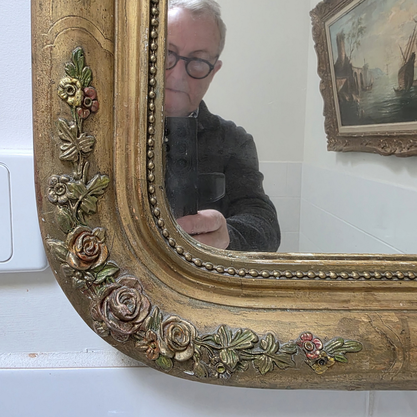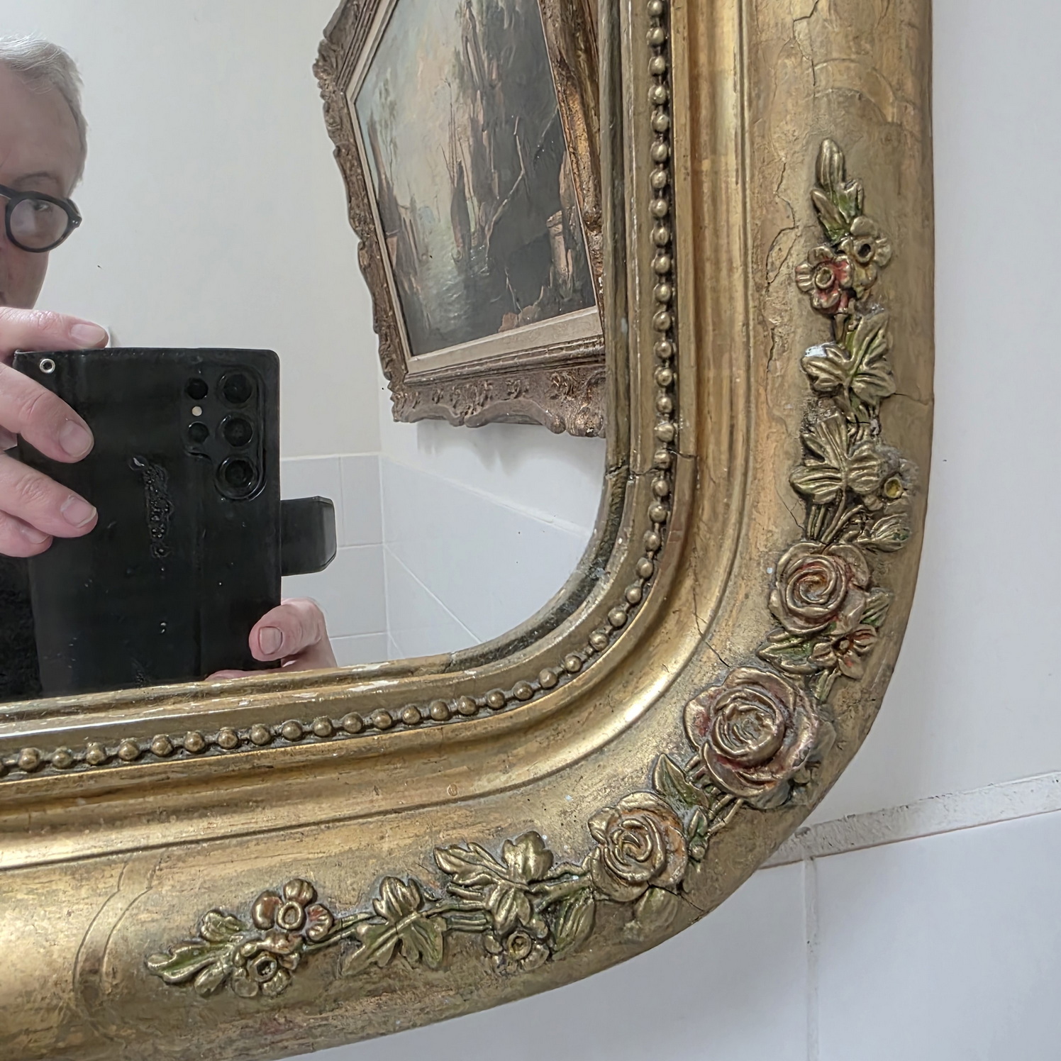 A 19th century French Napoleon III period mirror of fine Parisian quality, the pastille-work gilt frame with rounded corners, etched and gilded, and decorated with haut-relief rose flower trellises. The gold leaf is nicely worn and shows the gilder's original gold leaf overlaying. Retaining the original silvered mirror. Area of Paris, circa 1870.
