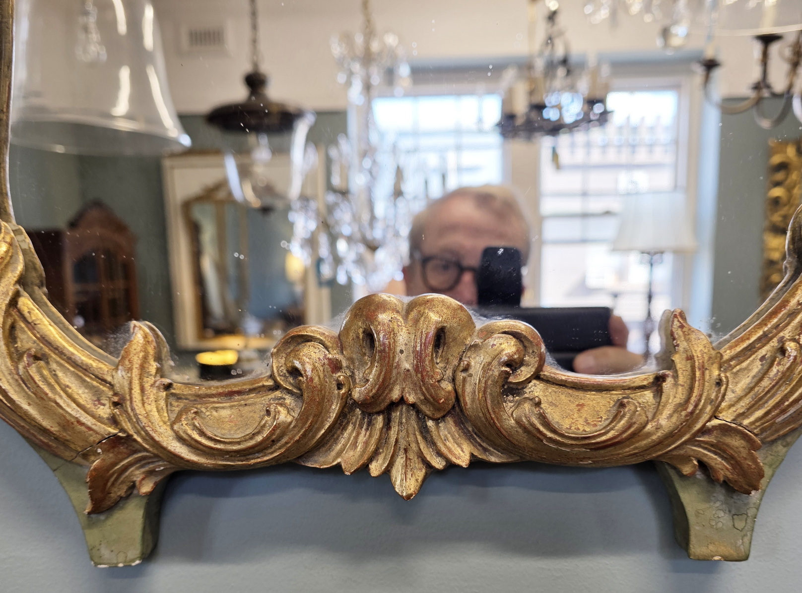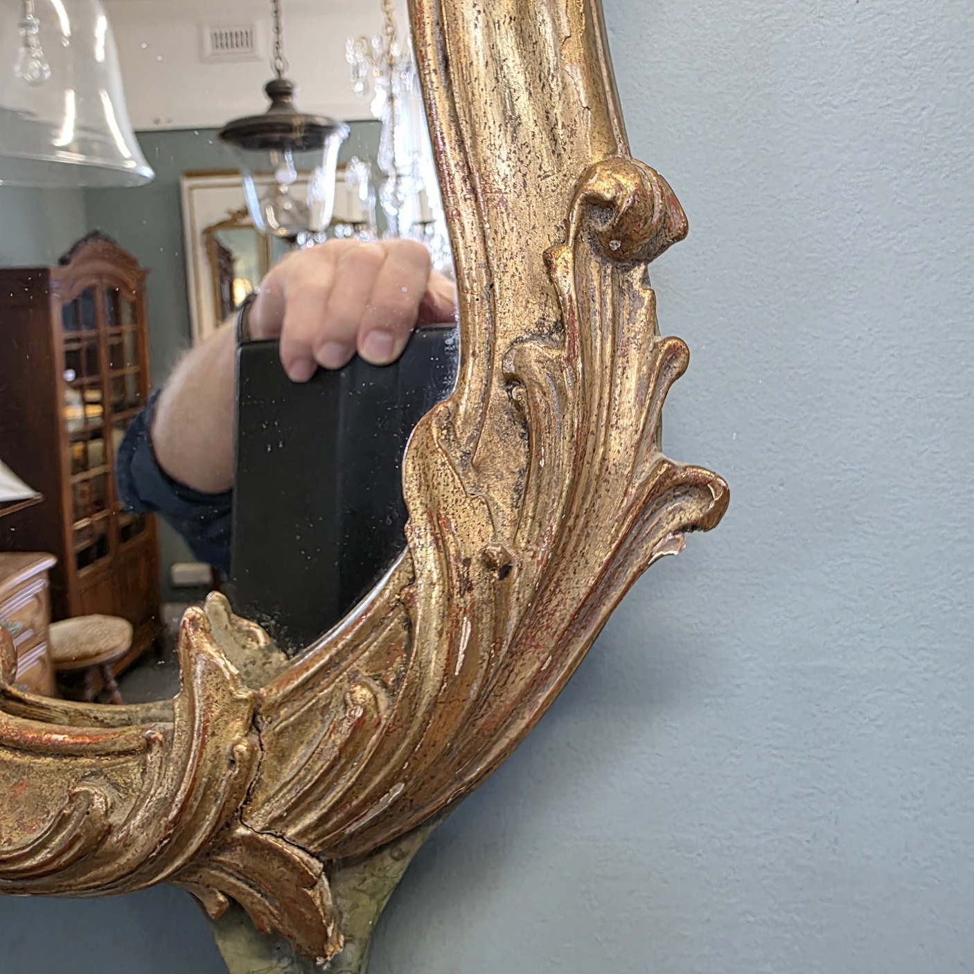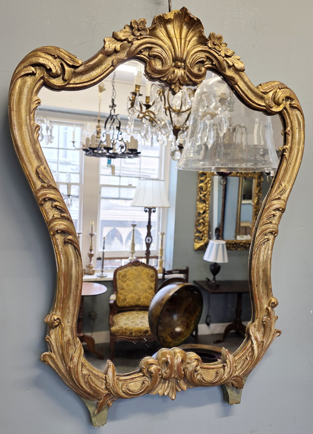 A French Louis XV style gilt timber mirror decorated with Rocaille motifs, including haut relief hand carved foliate scrolls, seashell and flowers motifs. Area of Paris, circa 1930.