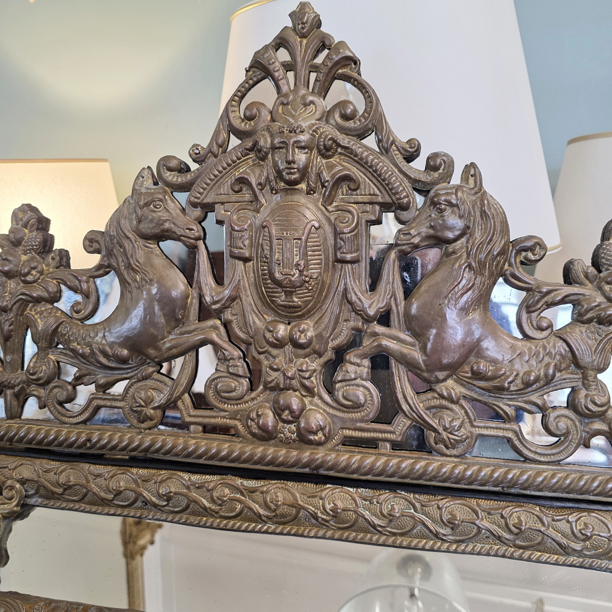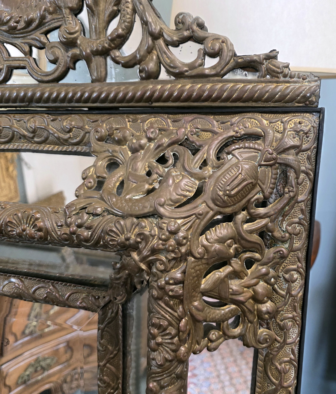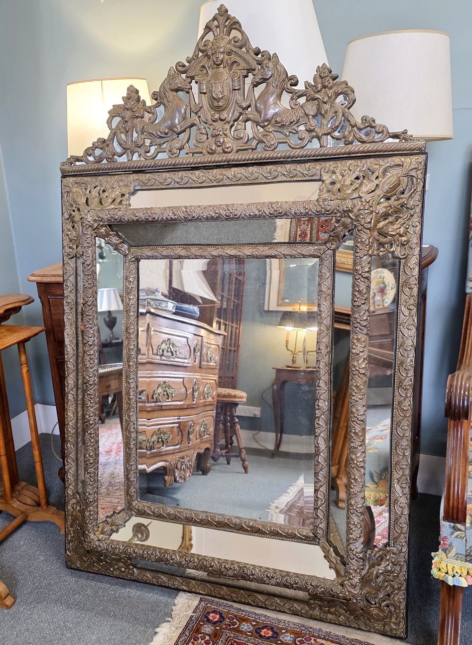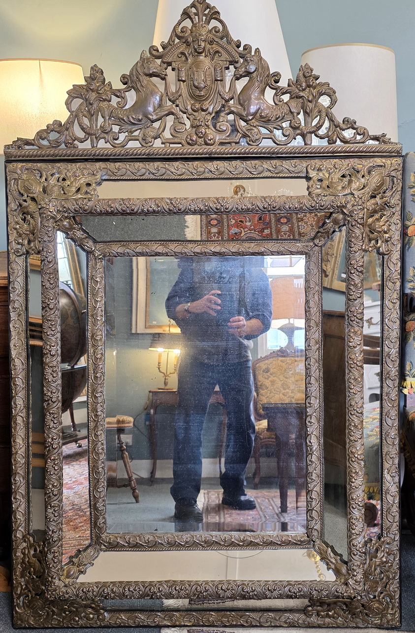 A large, mid 19th century French Napoleon III period, Regence style 'repouséed' brass Cushion mirror of fine quality, retaining all the original mirror plates, including the mirror fitted behind the fretwork of the pediment. Please note the wonderful bronze-like patina of the brass mouldings. Area of Paris, circa 1860.