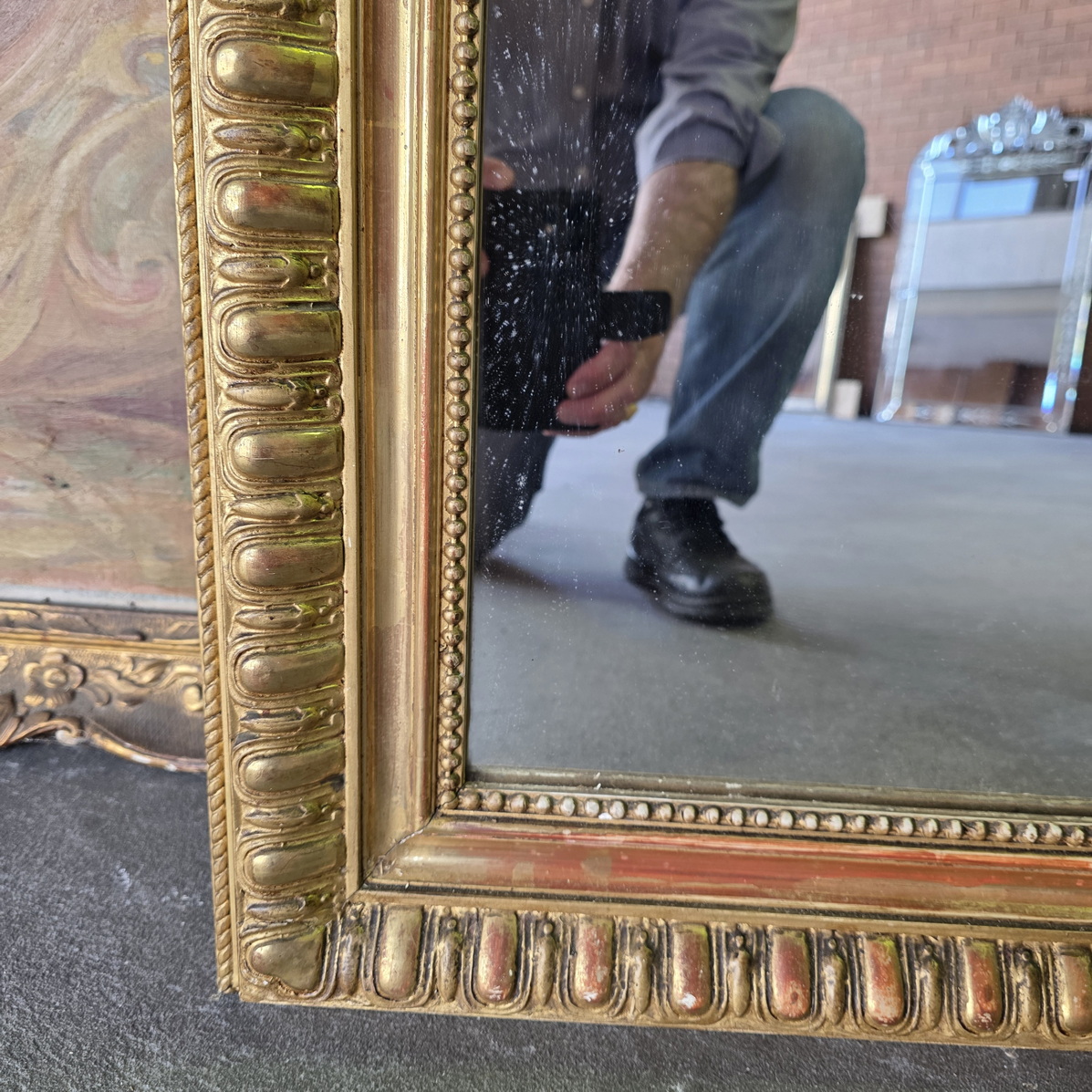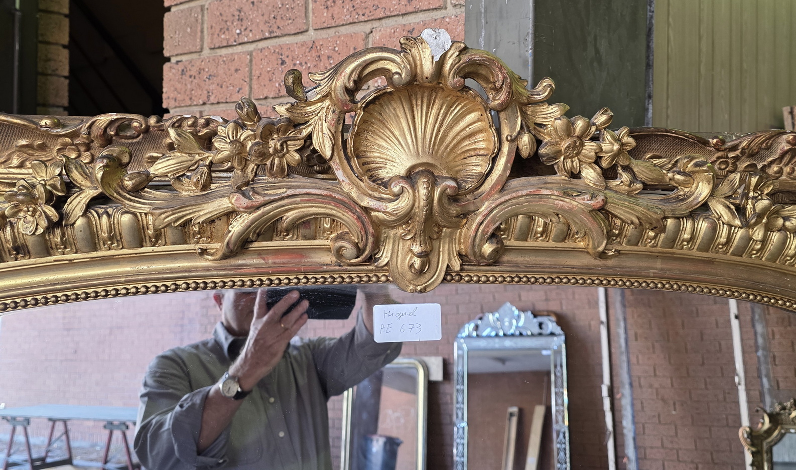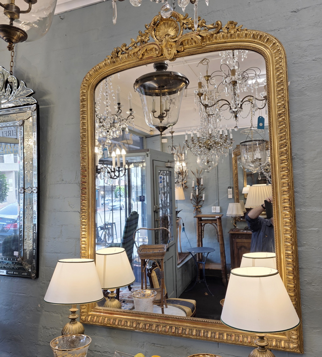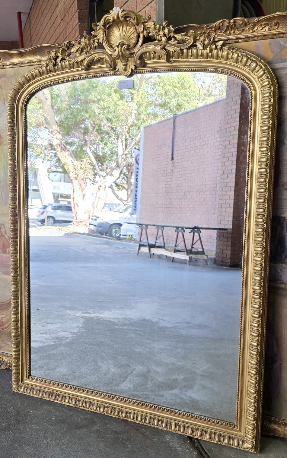 A 19th century French Napoleon III period, Louis XVI style gilt mantle mirror, the pediment decorated with a large and fretted 'Coquille' motif and with trellises of haut-relief foliate and floral scrollwork above a frame decorated with 'egg-and-dart' mouldings. Retaining the original gilt finish and its original mirror plate. Area of Paris, circa 1860.