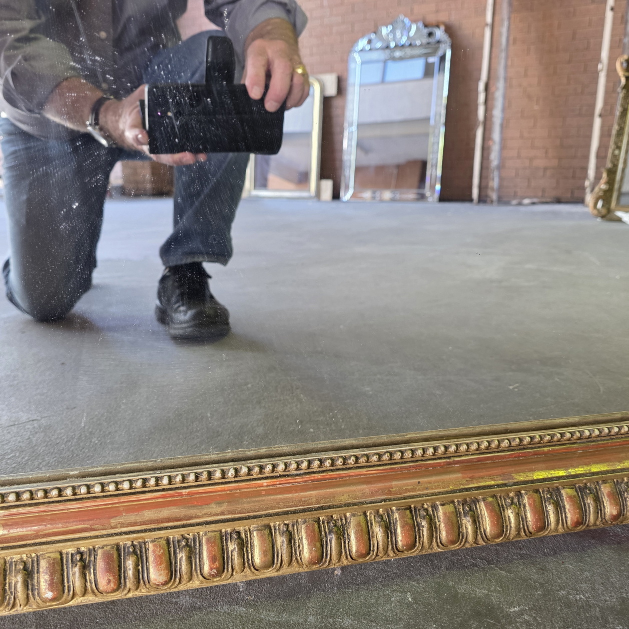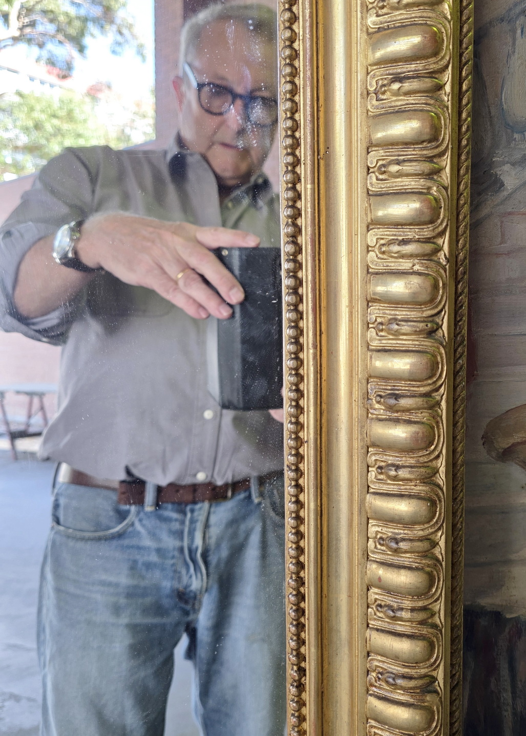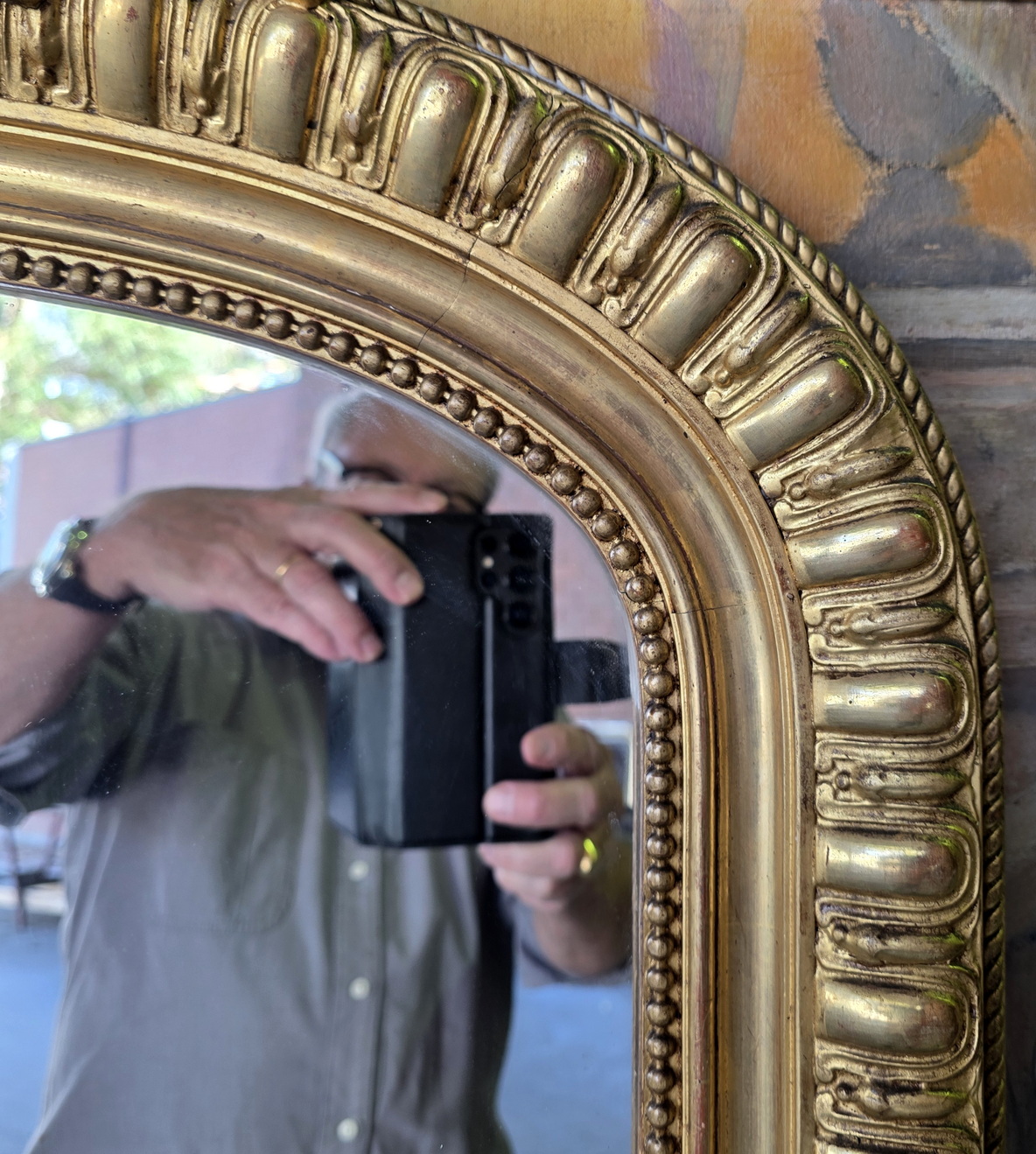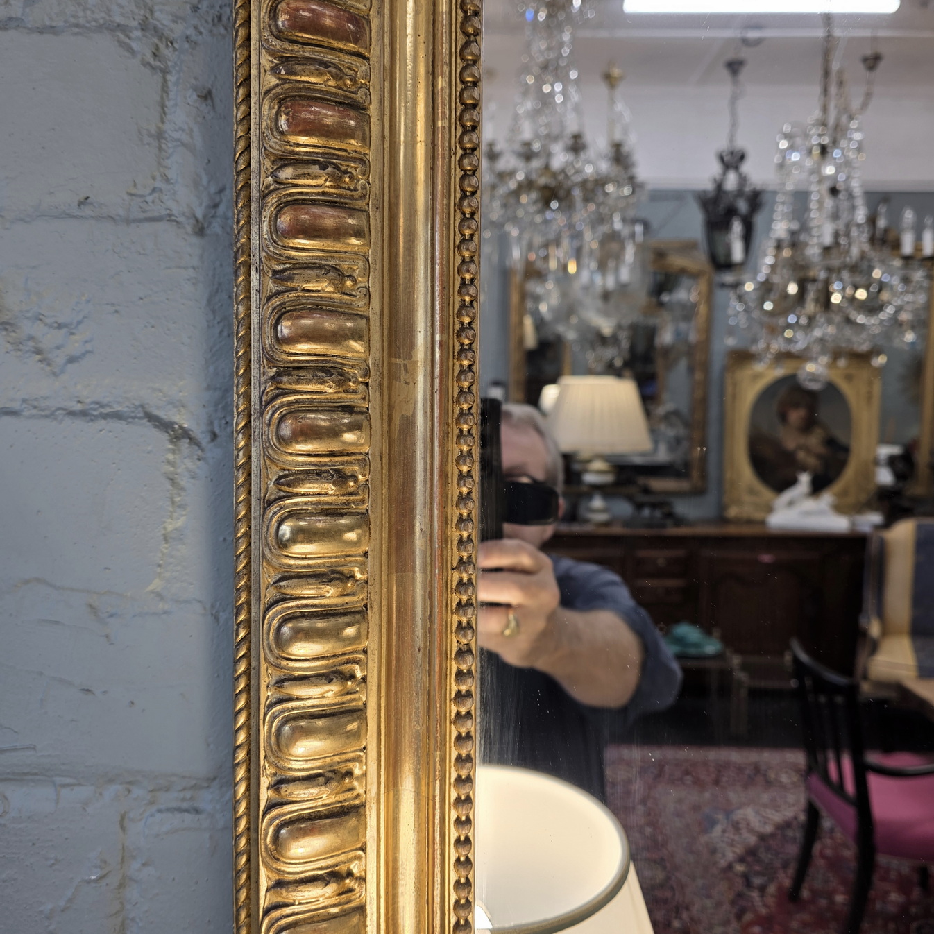 A 19th century French Napoleon III period, Louis XVI style gilt mantle mirror, the pediment decorated with a large and fretted 'Coquille' motif and with trellises of haut-relief foliate and floral scrollwork above a frame decorated with 'egg-and-dart' mouldings. Retaining the original gilt finish and its original mirror plate. Area of Paris, circa 1860.