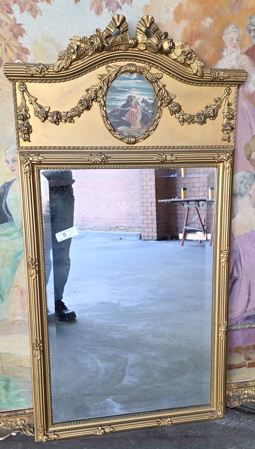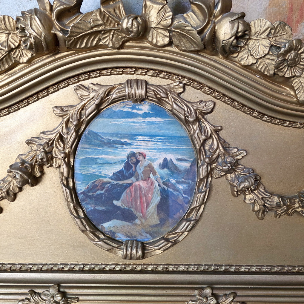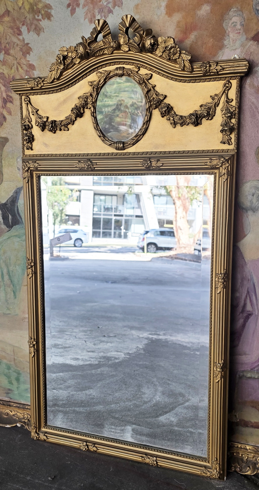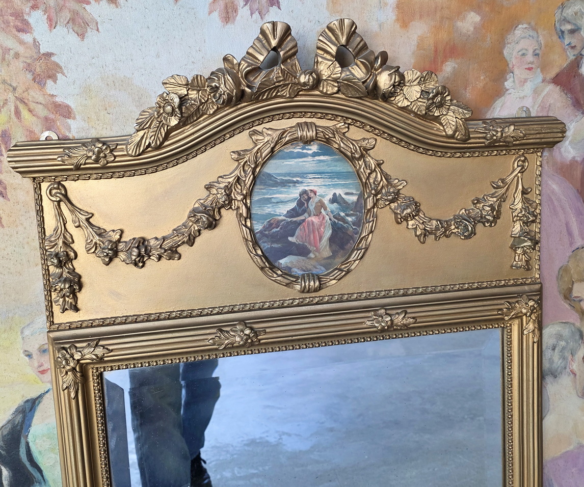 A 19th century French Louis XVI style carved and gilt Trumeau mirror of Parisian quality, the front decorated with fasces and flowers mouldings, the curve pediment festooned with swags of flowers. An oval medallion containing a water-coloured print depicting a romantic ‘Scene Galante’ is fitted to the centre of the pediment. Retaining the original bevelled mirror pane. Area of Paris, circa 1880.