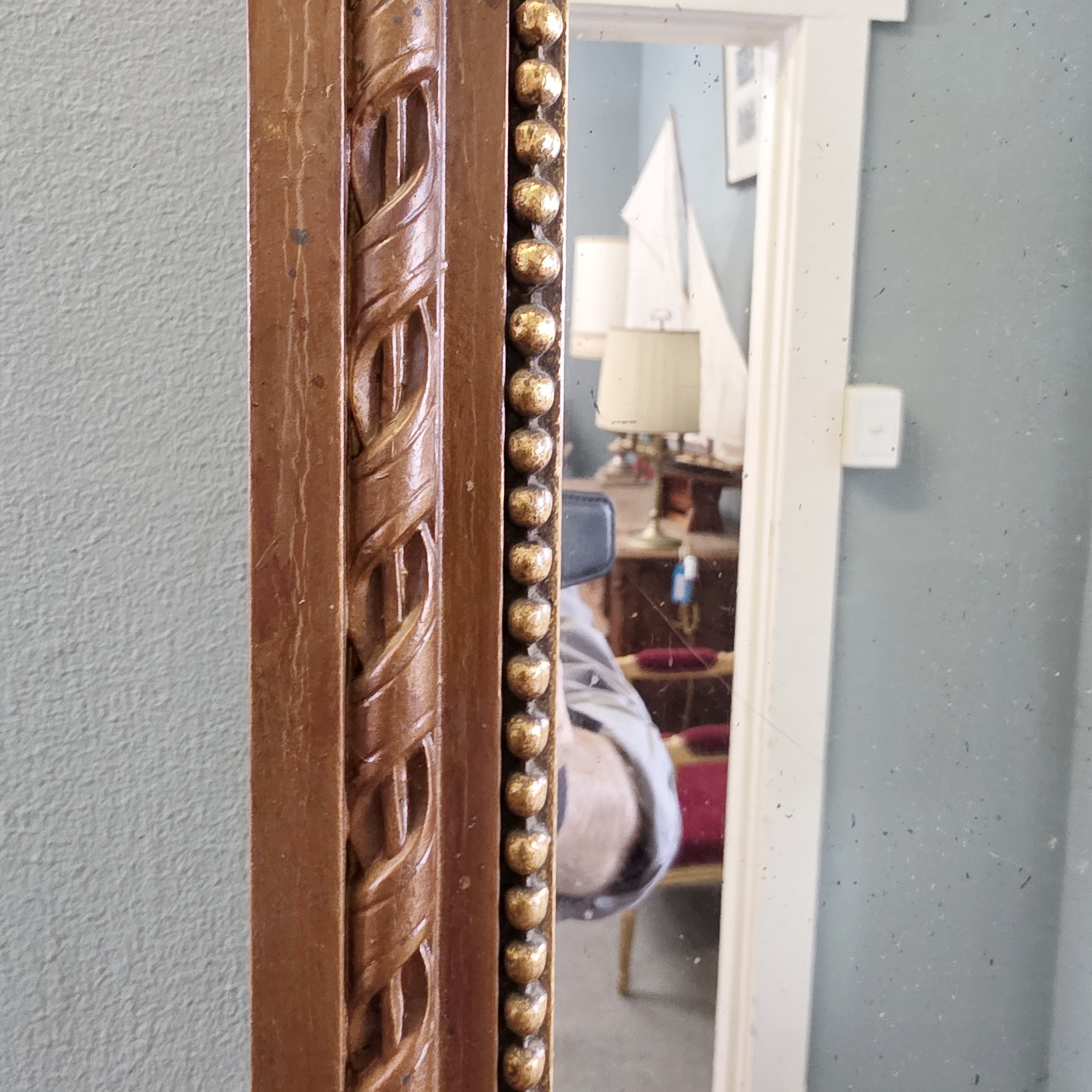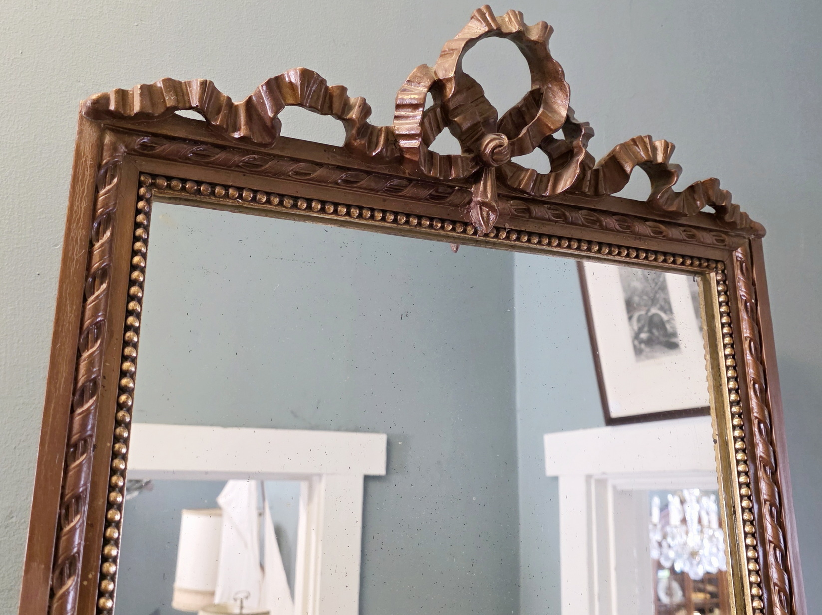 A tall and narrow French Louis XVI style 'Entre-fenetres' pier glass mirror, the gilt frame decorated with string-of-pearls and with 'continuous-ribbon' mouldings, surmounted by an outsized knotted bow. Fitted with the original mirror plate. Please note the wonderfully simple and understated Neoclassical design. Paris, circa 1880.