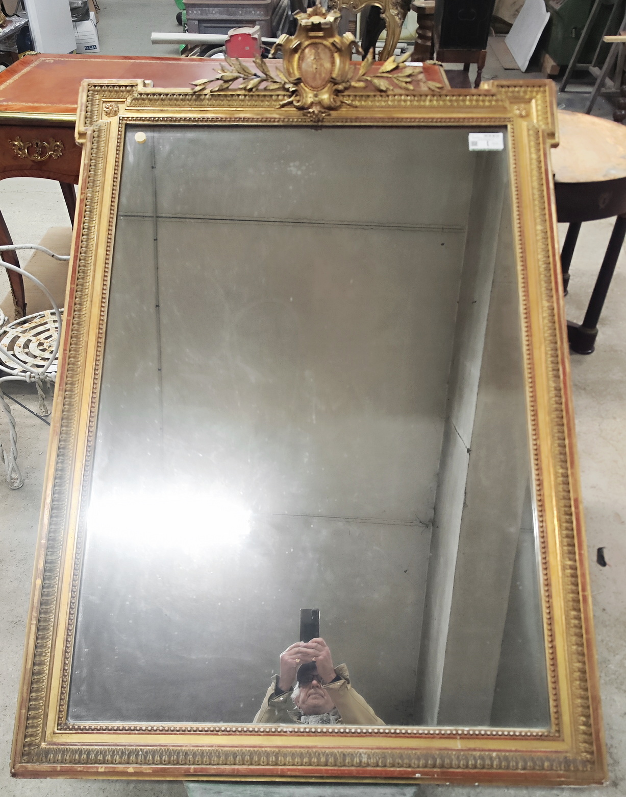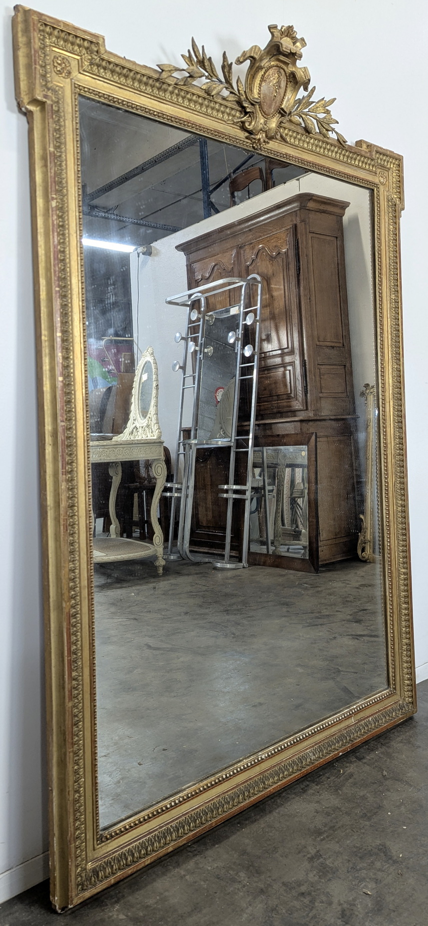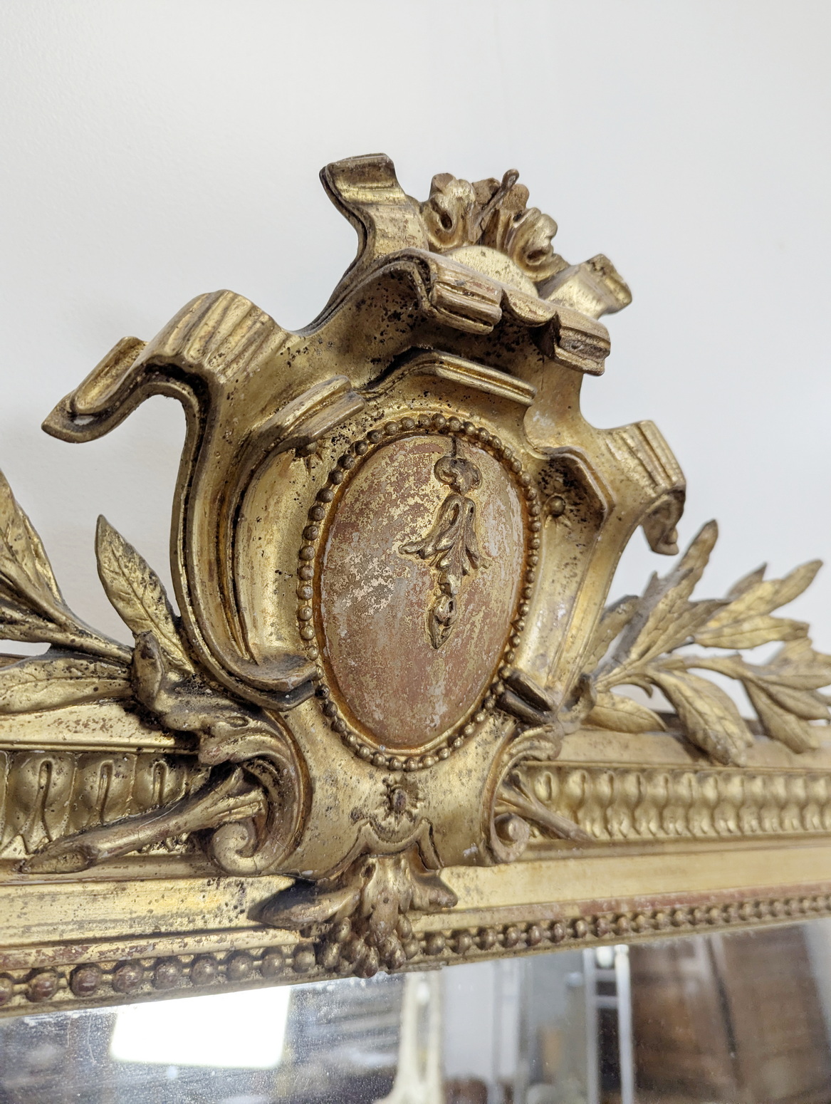 A large, 19th century French Napoleon III period, Louis XVI style gilt mirror of fine quality and elegant Neoclassical proportions. The haut-relief frame is decorated with acanthus leaf and string-of-pearl mouldings, surmounted by a stepped pediment, the central 'Cartouche' crest is flanked by outsized laurel branches. The mirror frame retains its original gilt finish and the original mirror plate. Area of Paris, circa 1870.