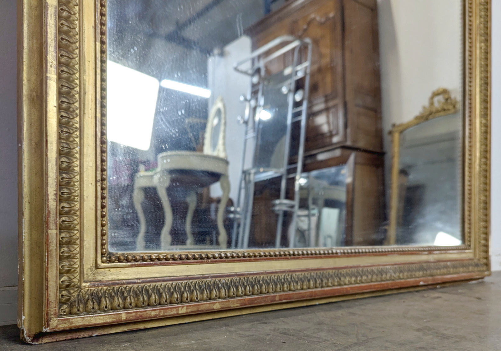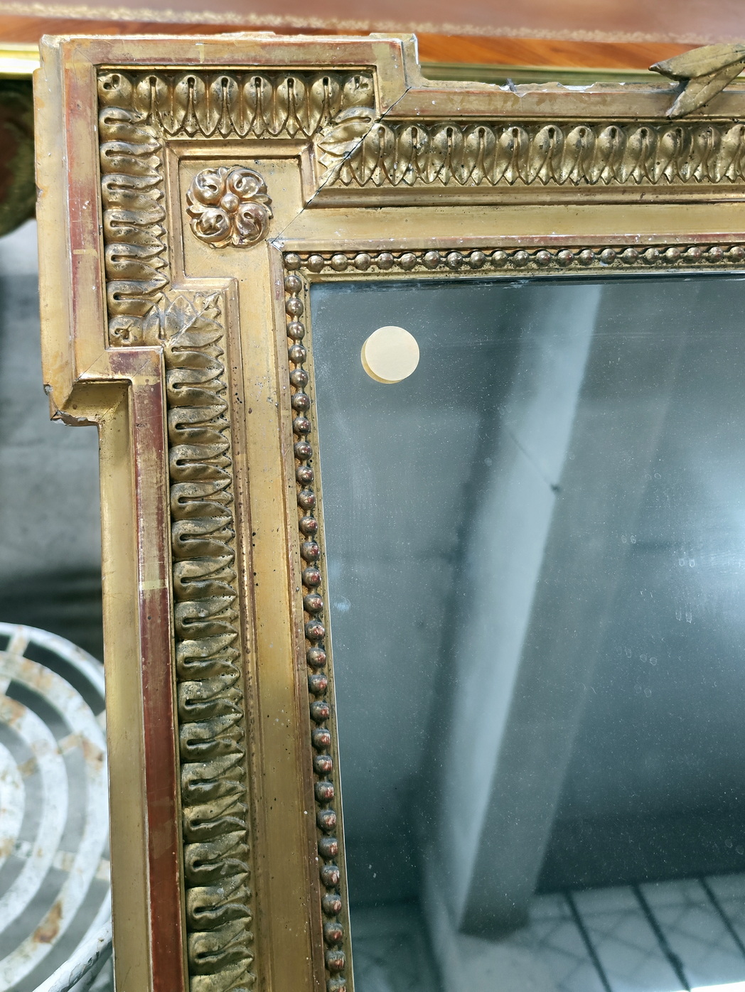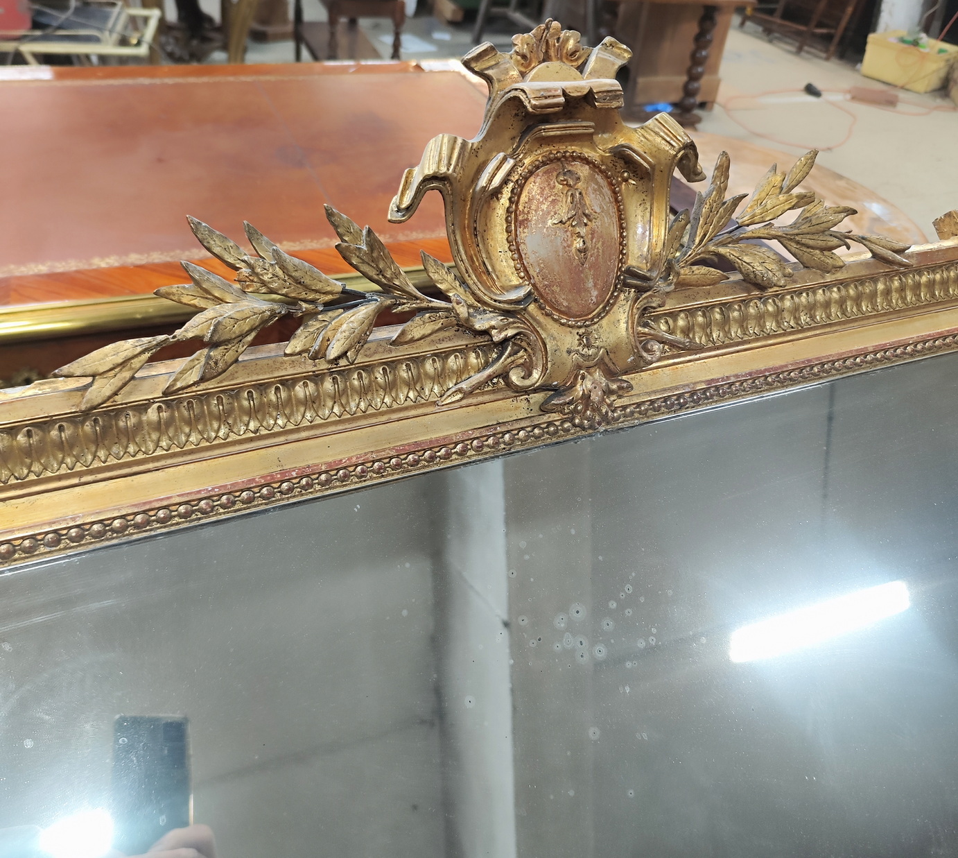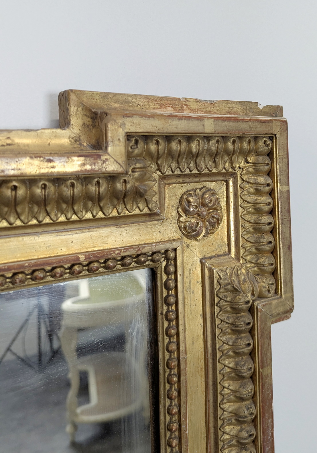 A large, 19th century French Napoleon III period, Louis XVI style gilt mirror of fine quality and elegant Neoclassical proportions. The haut-relief frame is decorated with acanthus leaf and string-of-pearl mouldings, surmounted by a stepped pediment, the central 'Cartouche' crest is flanked by outsized laurel branches. The mirror frame retains its original gilt finish and the original mirror plate. Area of Paris, circa 1870.