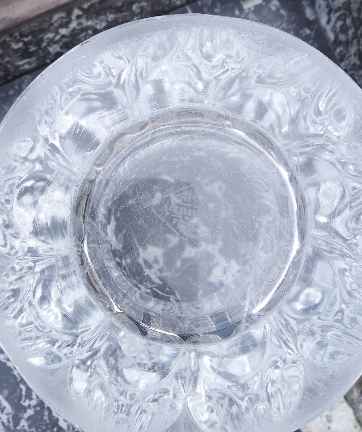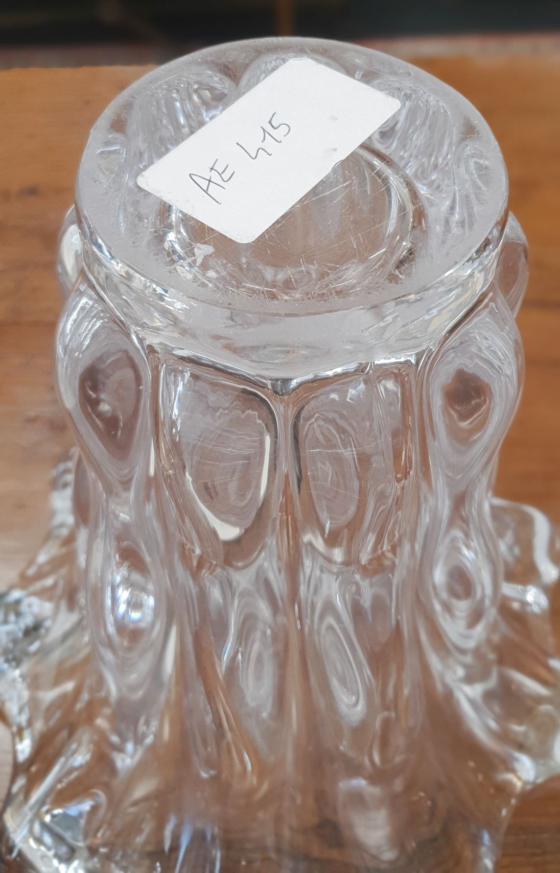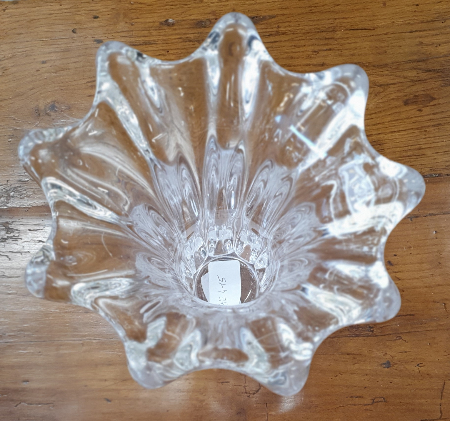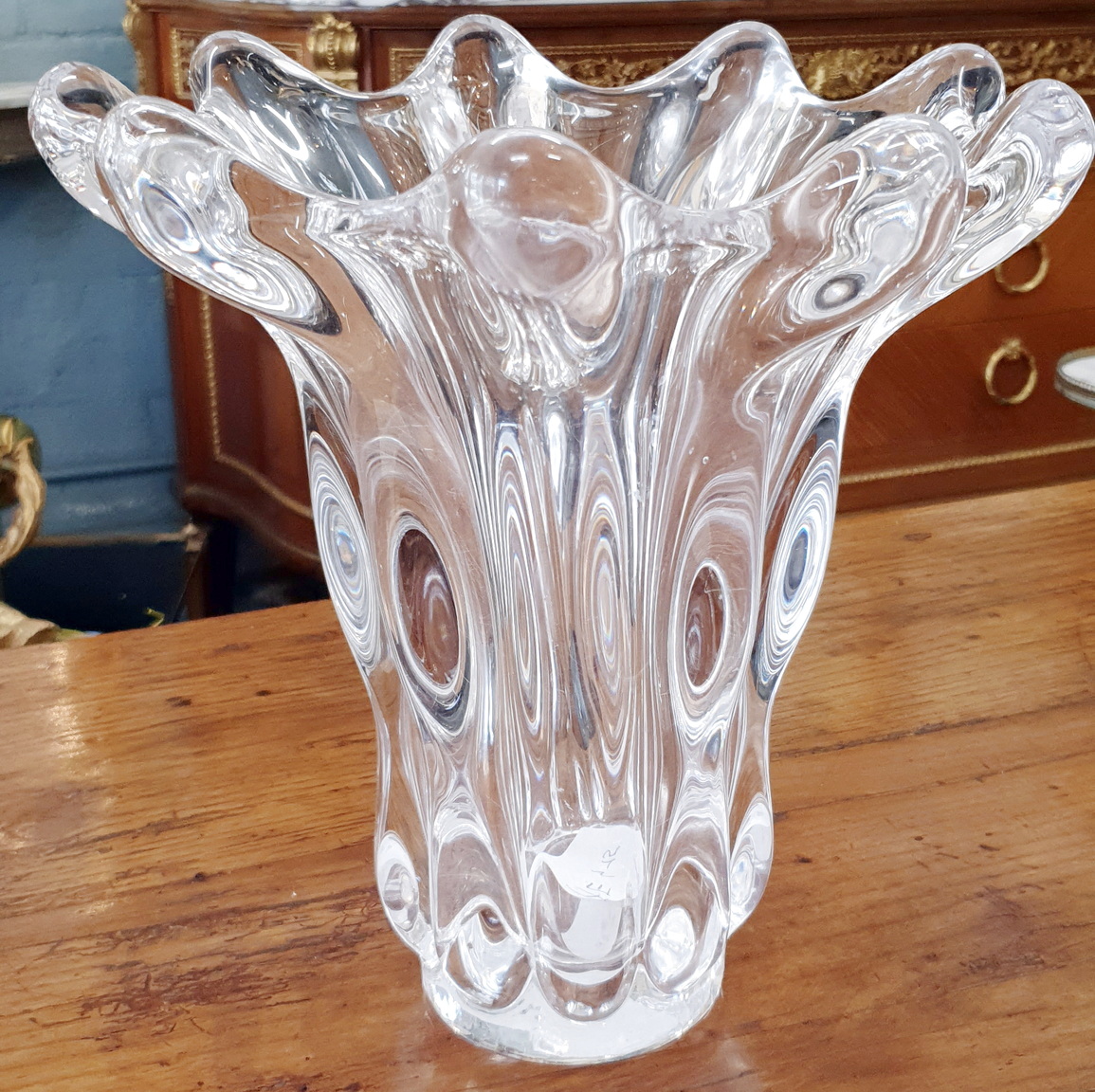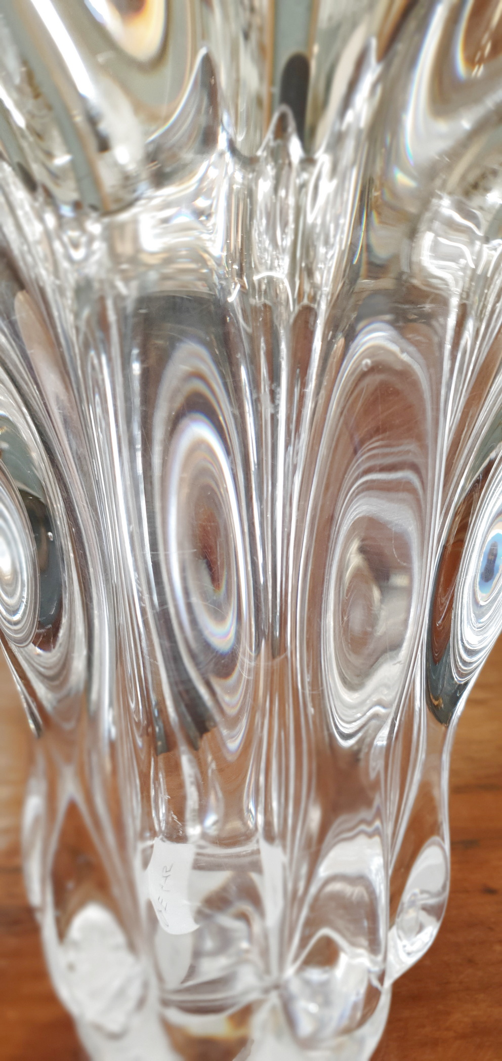 A vintage French 1960s design Cristalleries de Vannes "Giraffe Vase", the heavy and very luminous crystal shaped with characteristic light-catching wave forms, the top rim decorated with giraffes' "horns". The underside with the Cristalleries de Vannes hallmark. Area of Nancy, circa 1960.