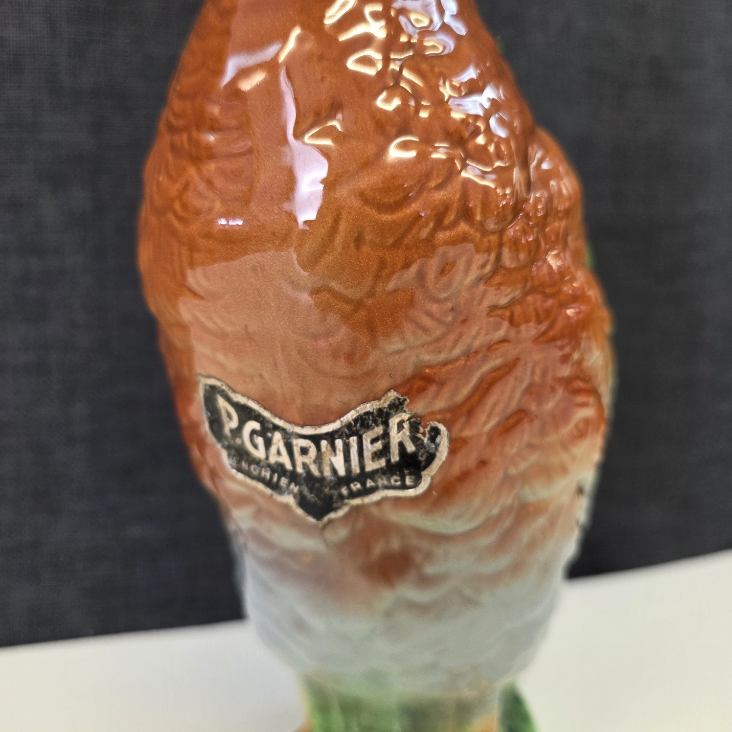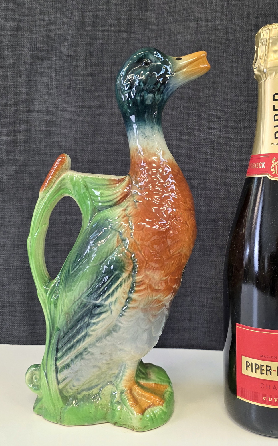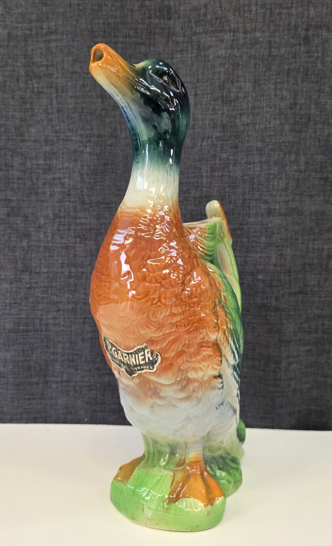 A 19th century French Saint Clement majolica water jug in the shape of a duck, the design in the French Art Nouveau style. The spout is the duck's bill, a decorative carrying handle is at the back. Please note the sticker on the body of the duck, from when 'P. Garnier' marketed and sold absinthe in this duck. Area of Nancy, circa 1880.
