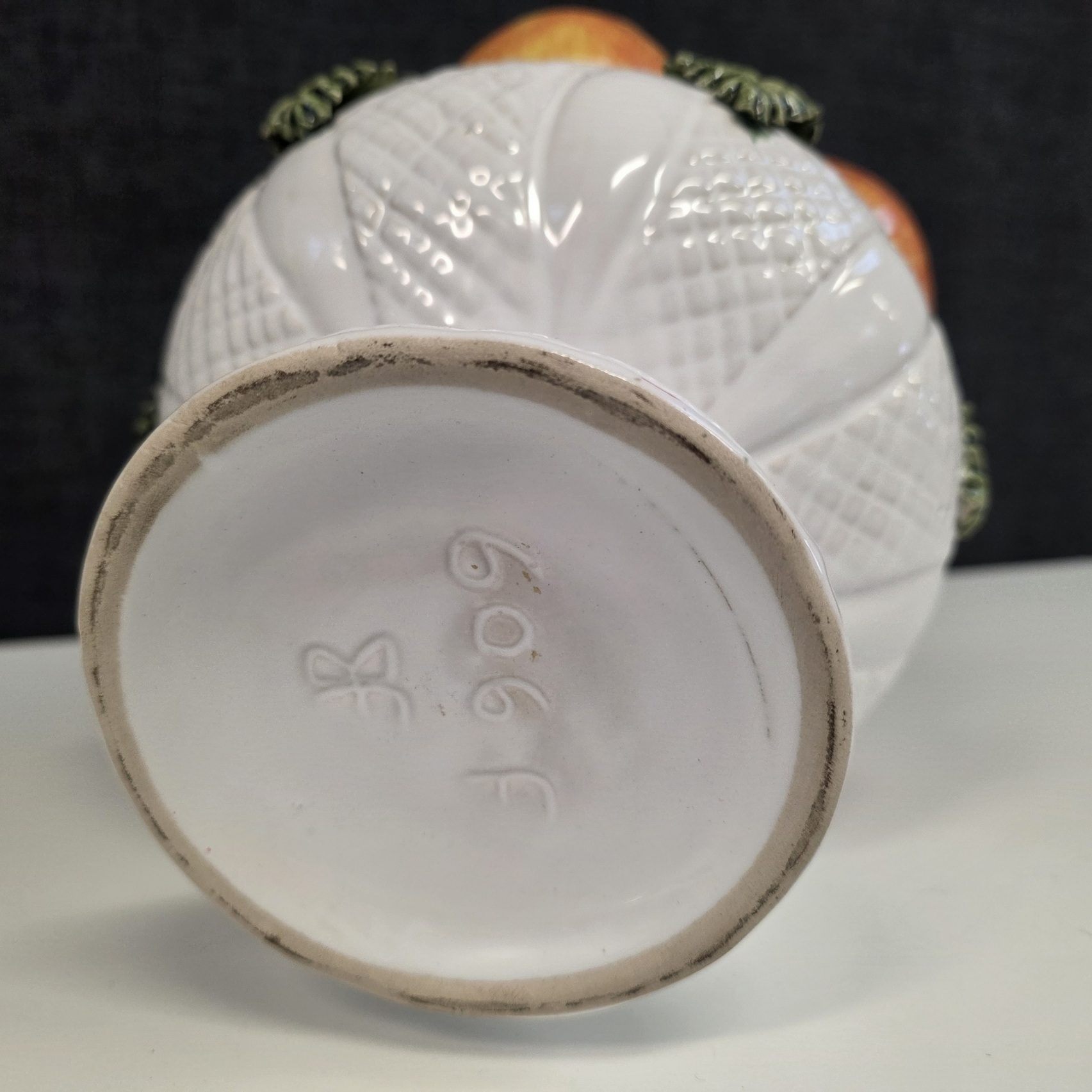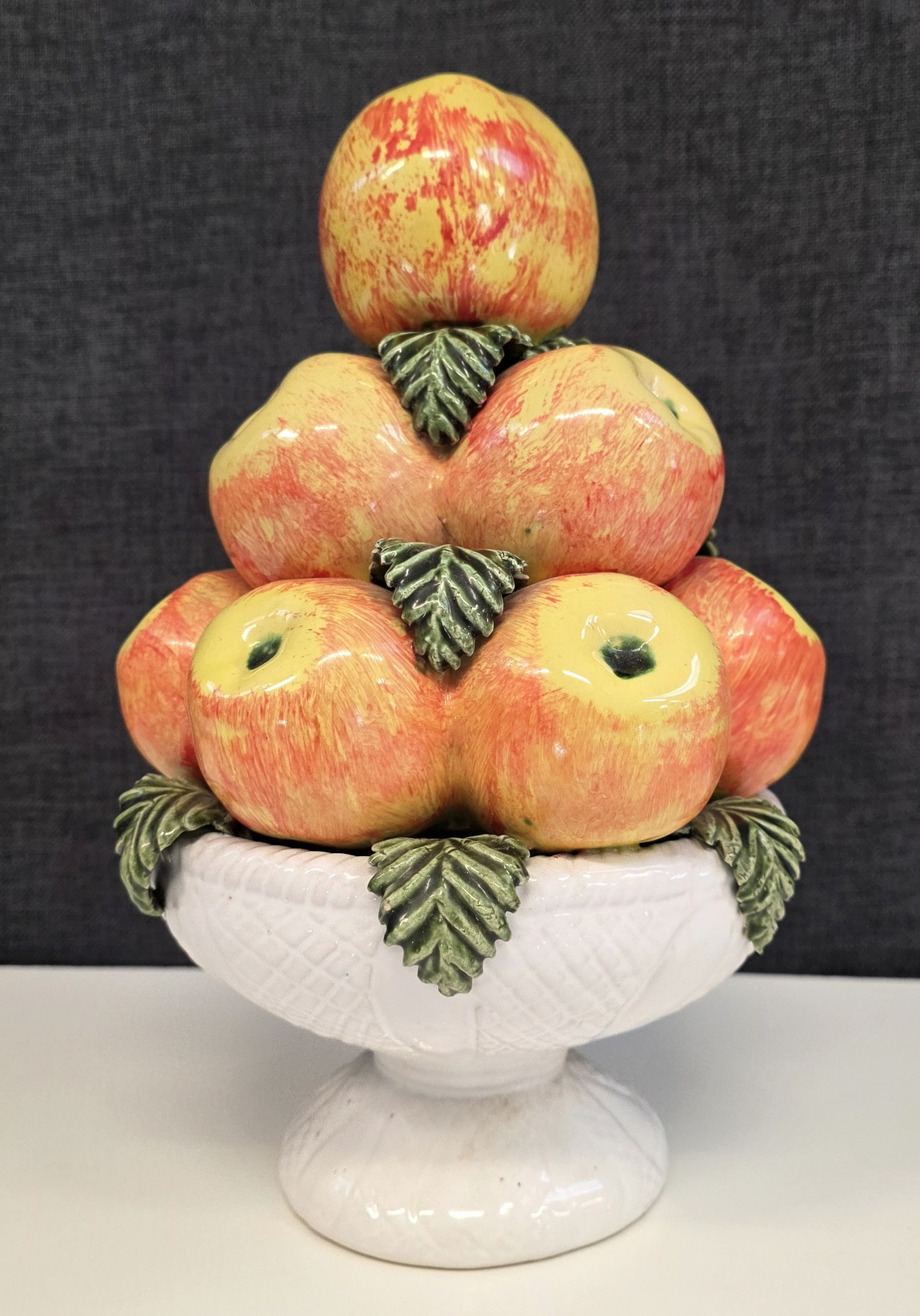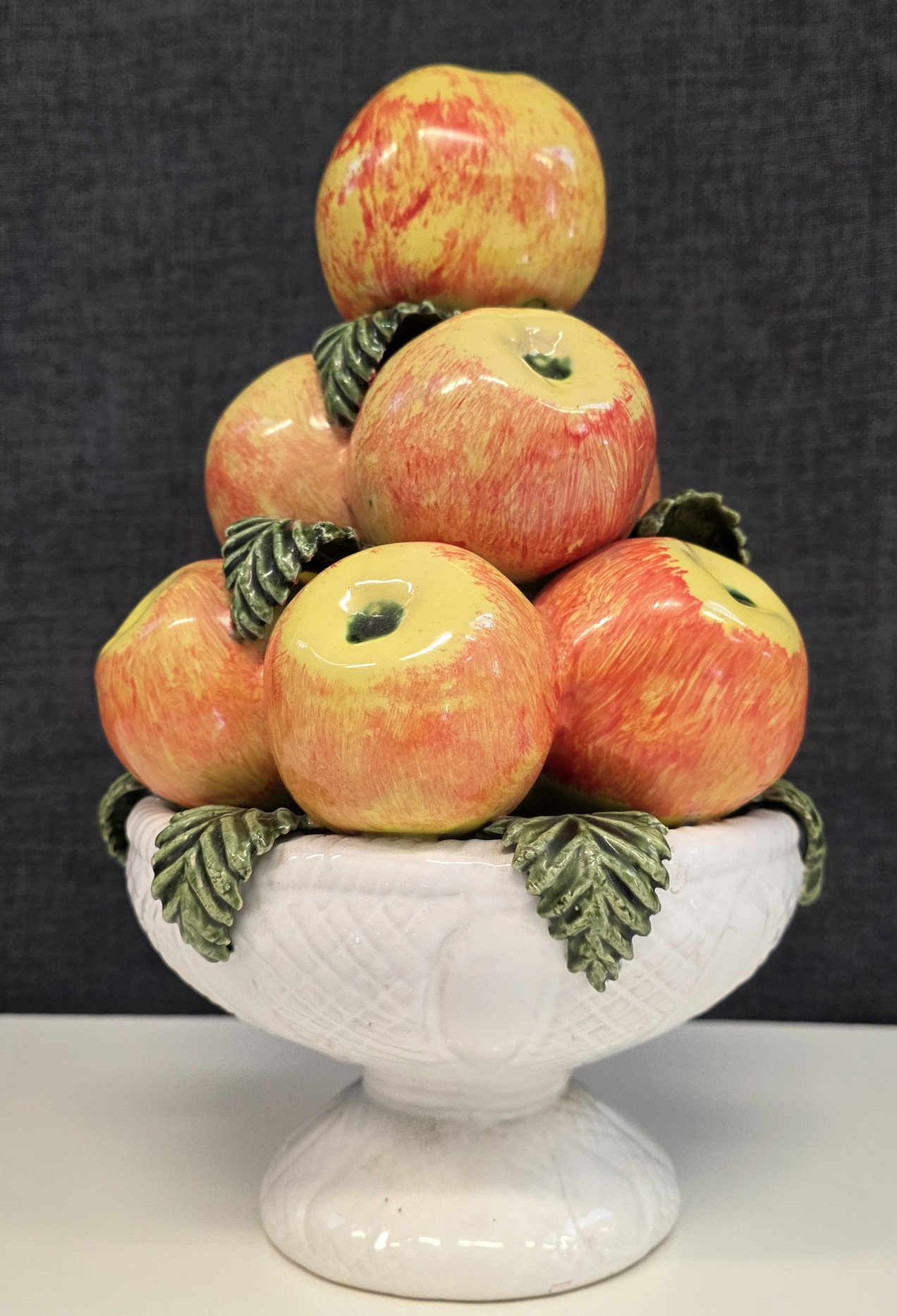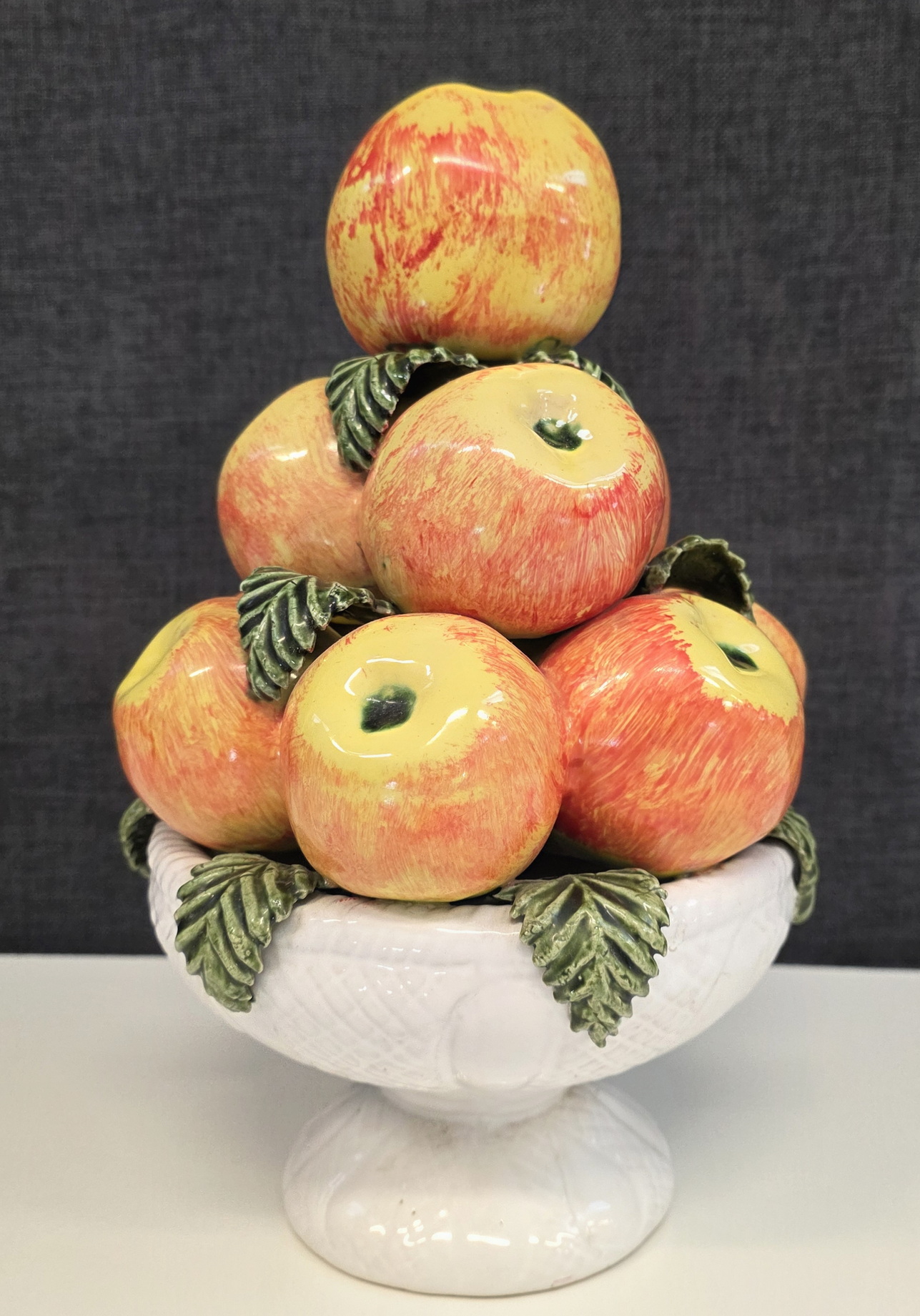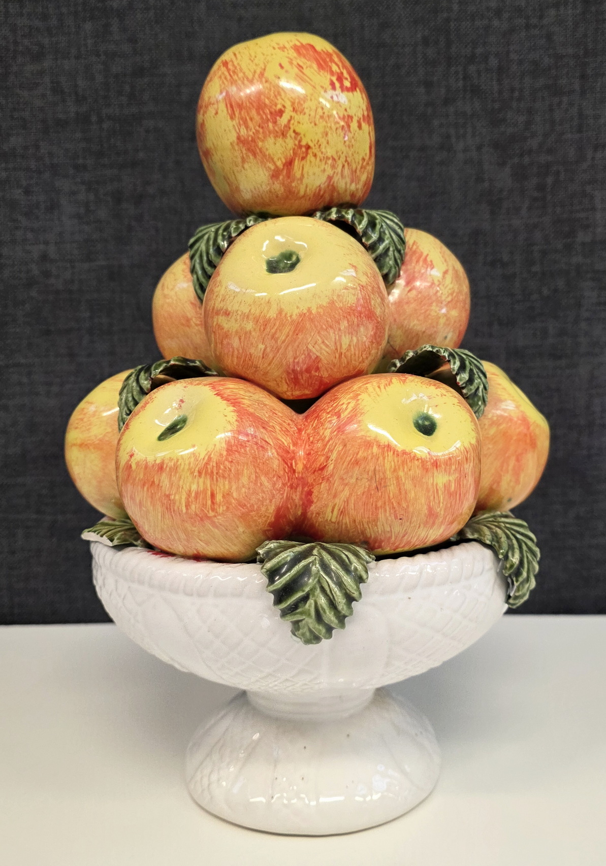 An early 20th century French majolica table decoration in the shape of a circular white-glazed bowl with a pile of apples and leaves. France, circa 1930. Please note: this type of pottery work is considered a virtuoso level of work, due to the difficulty of double-firing a clay object (once for the red clay, once for the glazes).