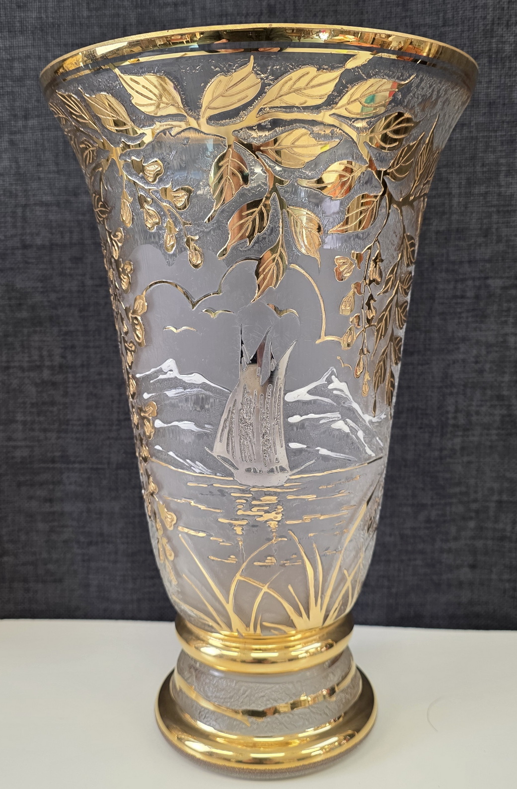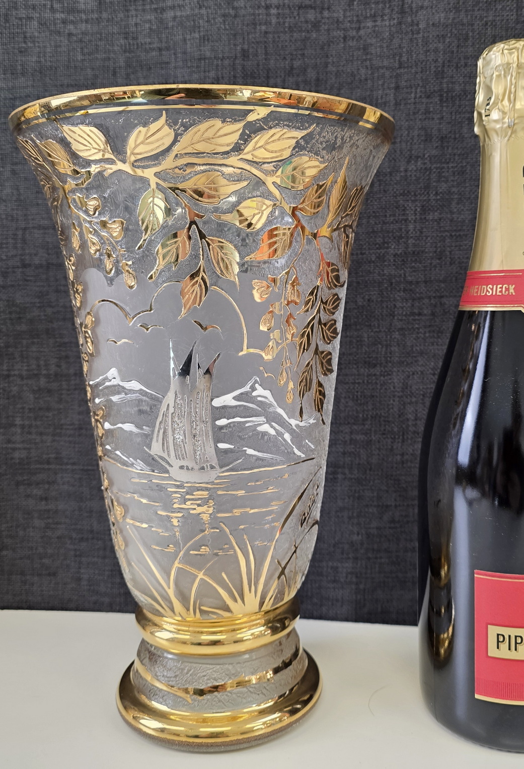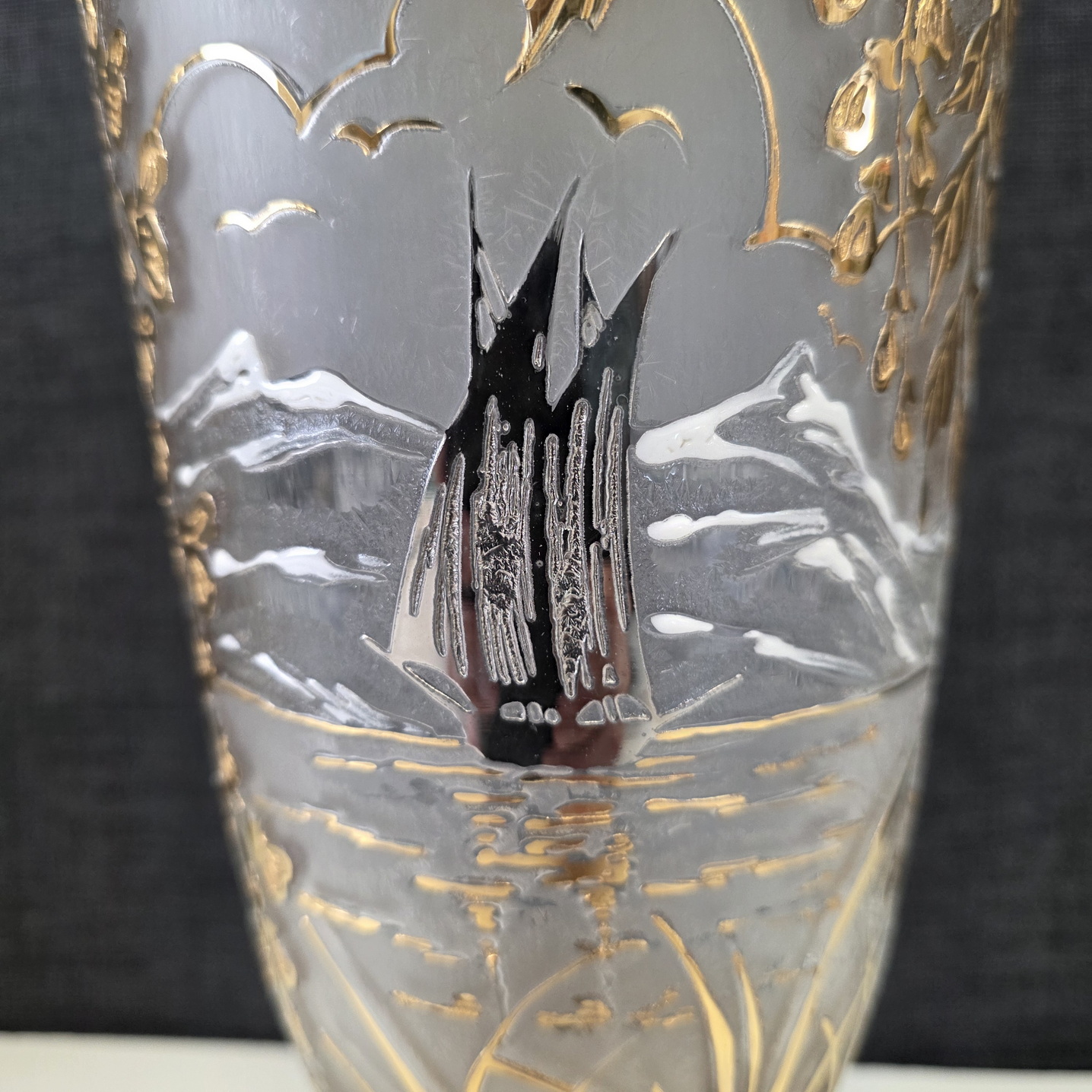 A French Art Deco period blown, gilt and etched glass vase decorated with gold and silver foliate motifs, depicting a sailing boat. The rear signed 'Adat'. Area of Paris, circa 1930.