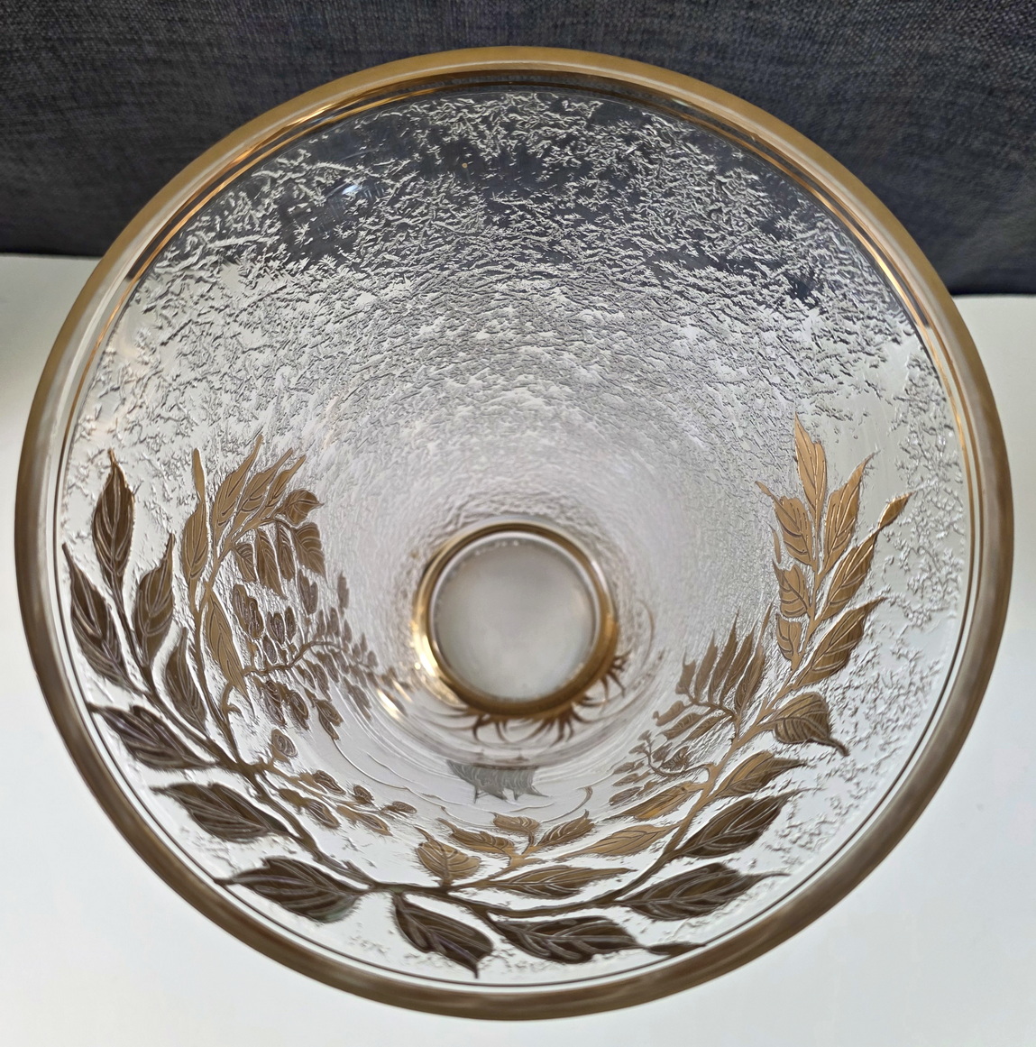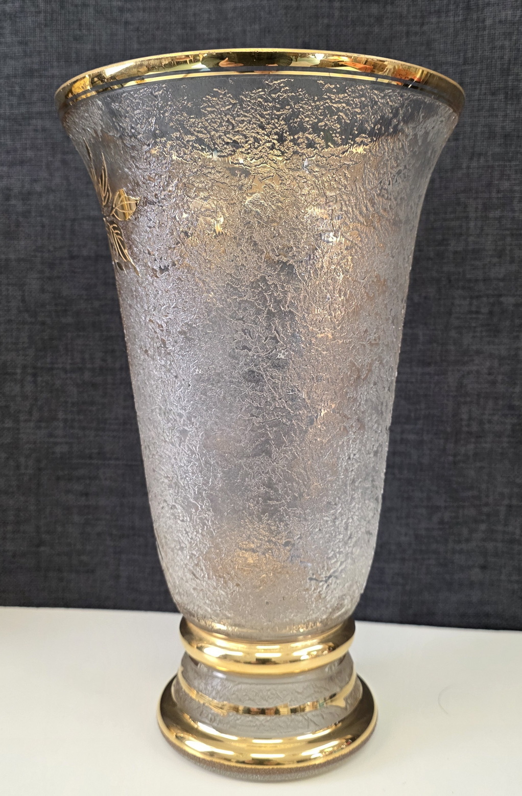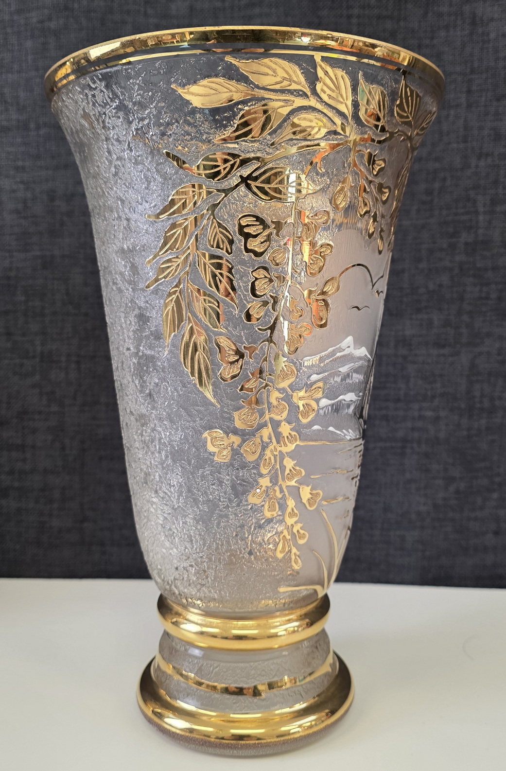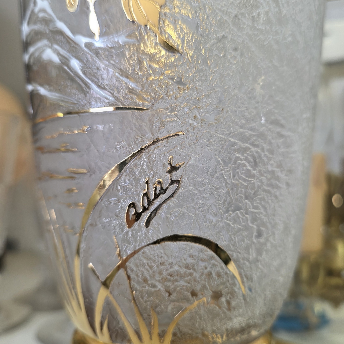 A French Art Deco period blown, gilt and etched glass vase decorated with gold and silver foliate motifs, depicting a sailing boat. The rear signed 'Adat'. Area of Paris, circa 1930.