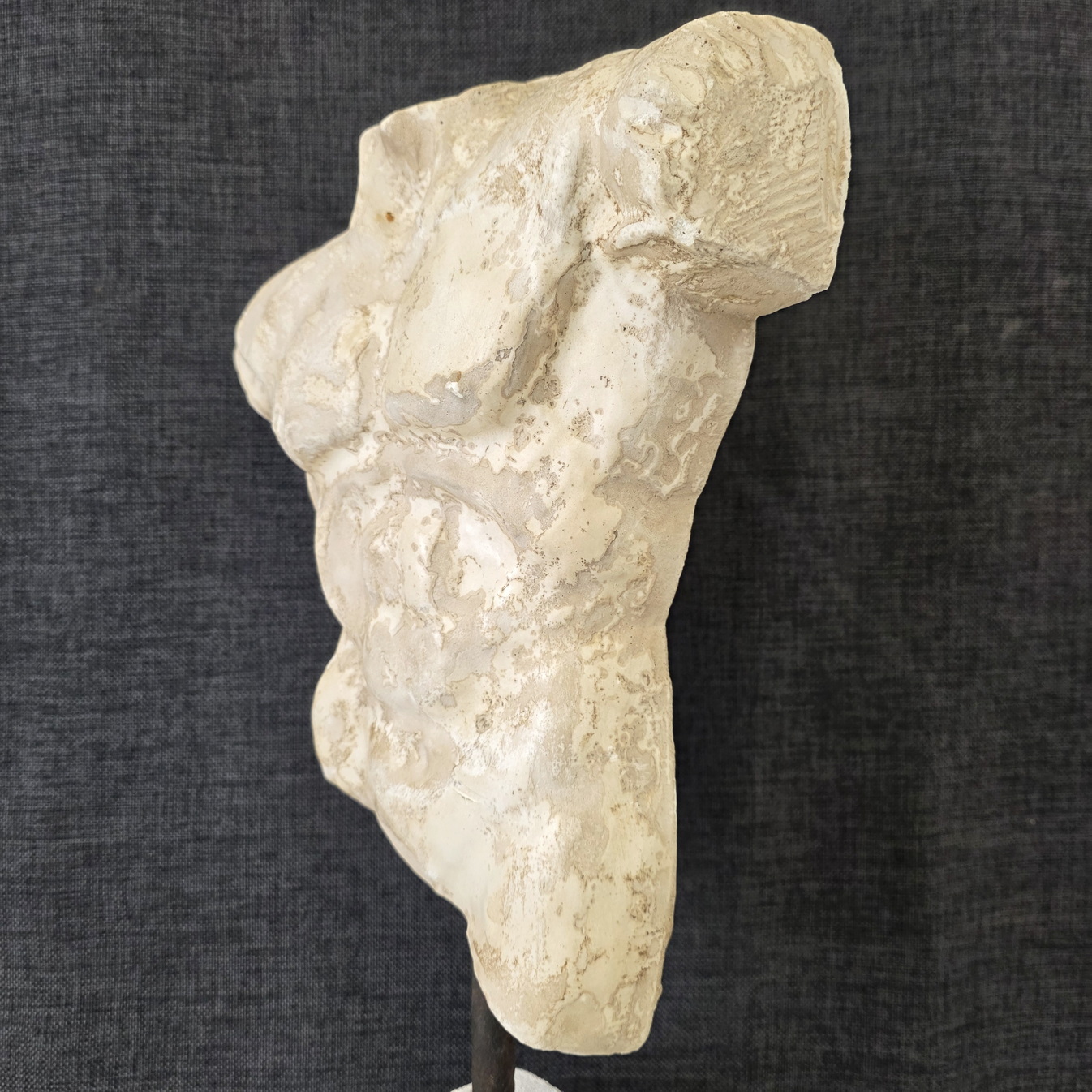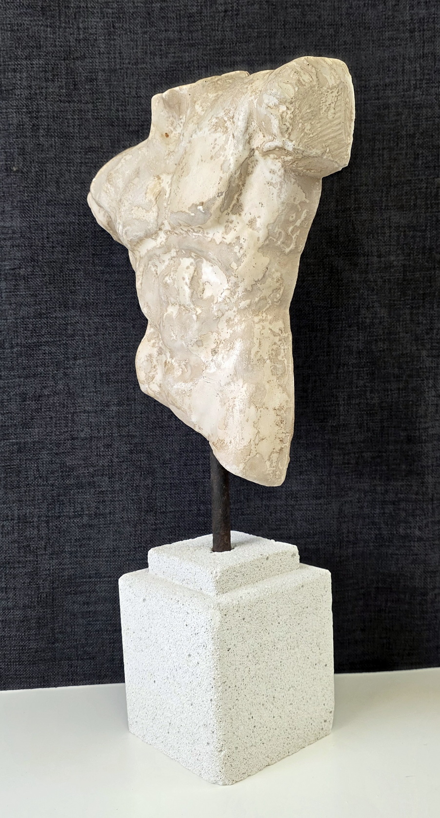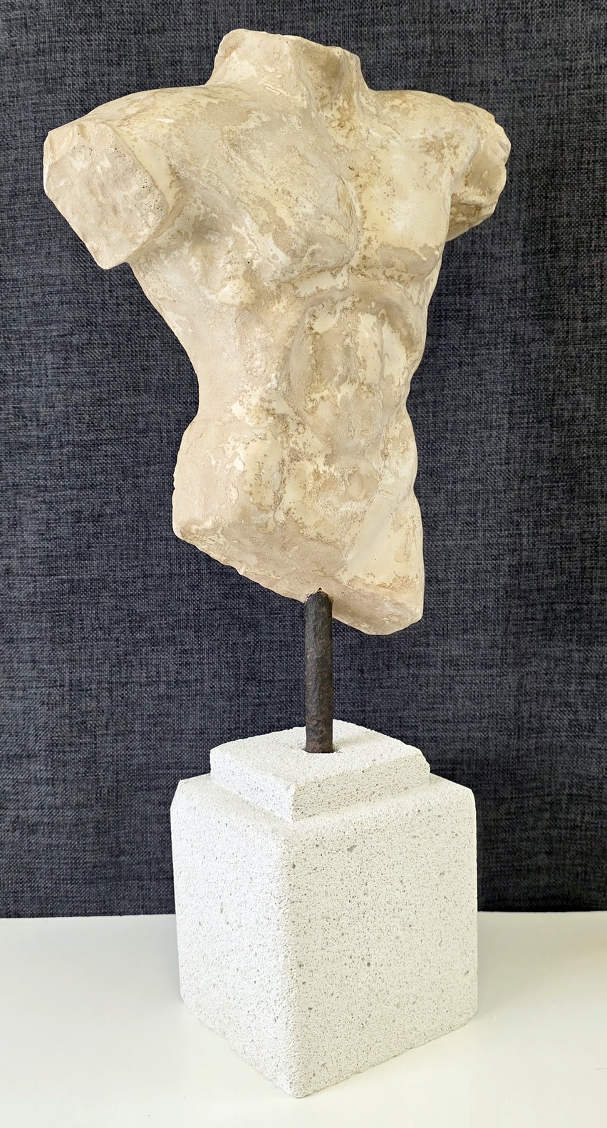 A French Classical Roman reconstituted stone torso of of a young man, standing on its carved hebel stone plinth. The reconstituted stone finish is a hand-painted faux-marble. Area of Paris, circa 1970.