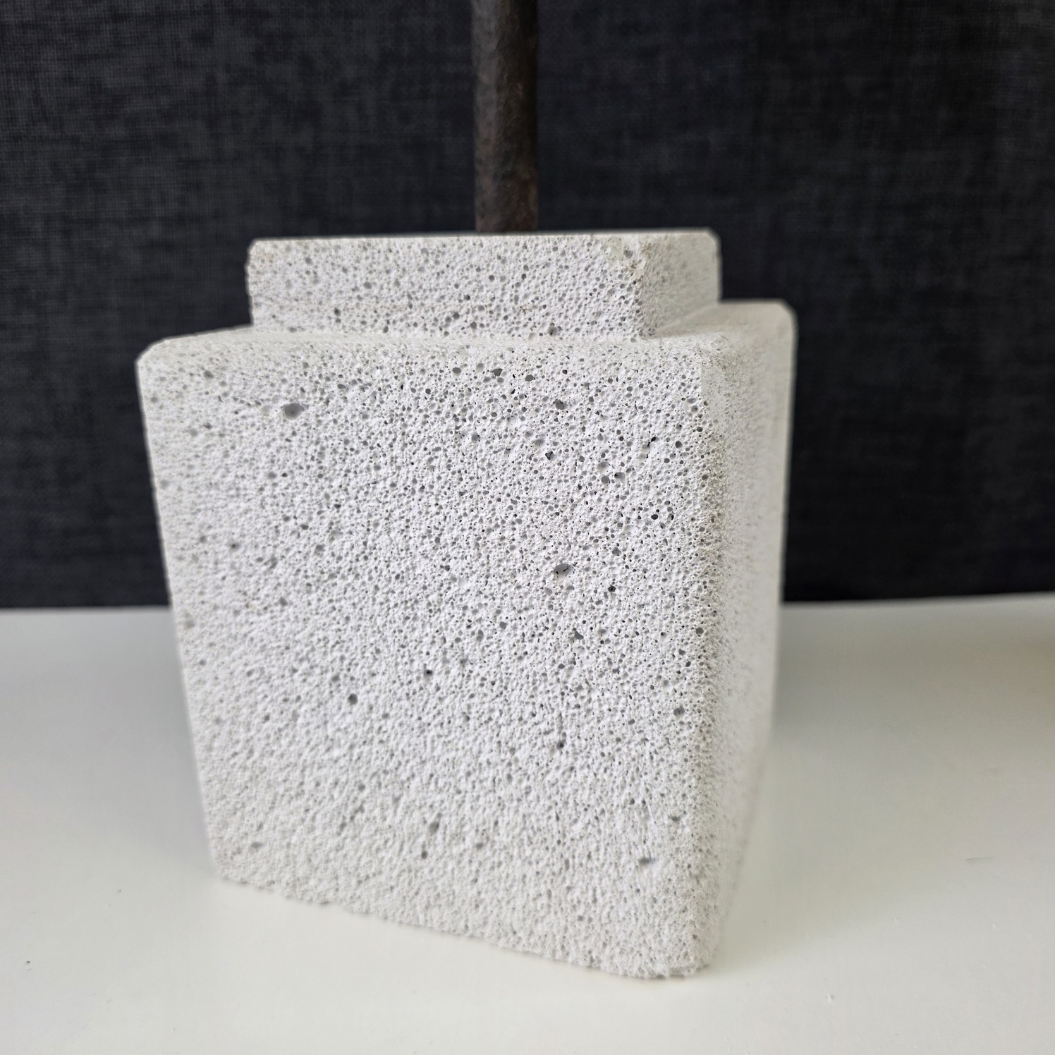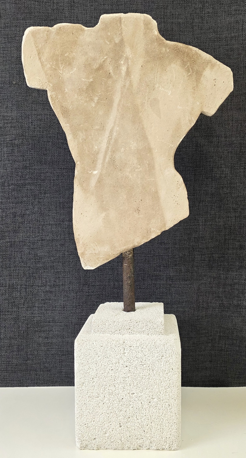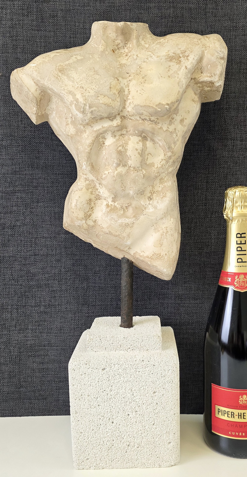 A French Classical Roman reconstituted stone torso of of a young man, standing on its carved hebel stone plinth. The reconstituted stone finish is a hand-painted faux-marble. Area of Paris, circa 1970.