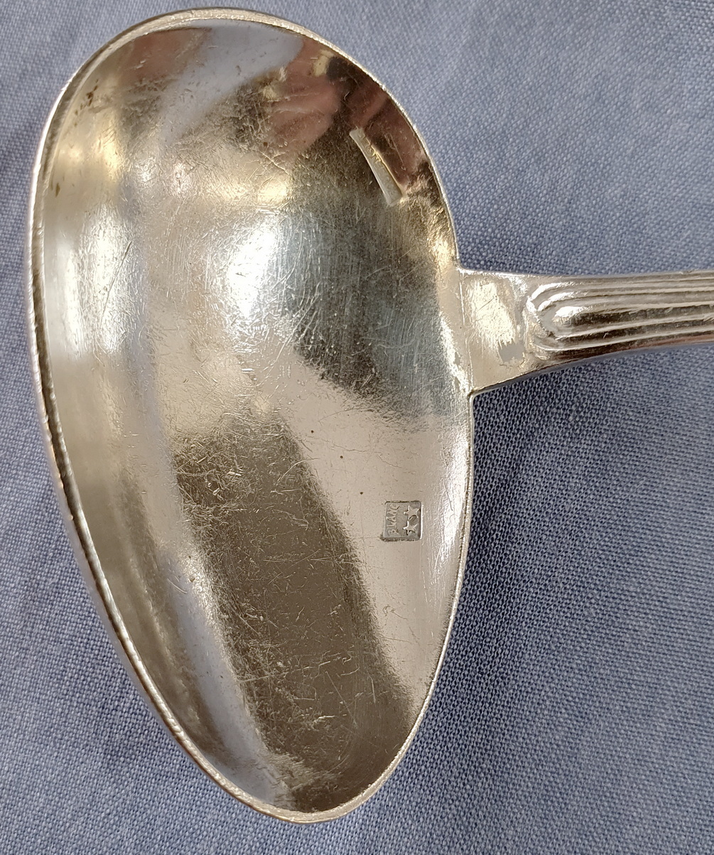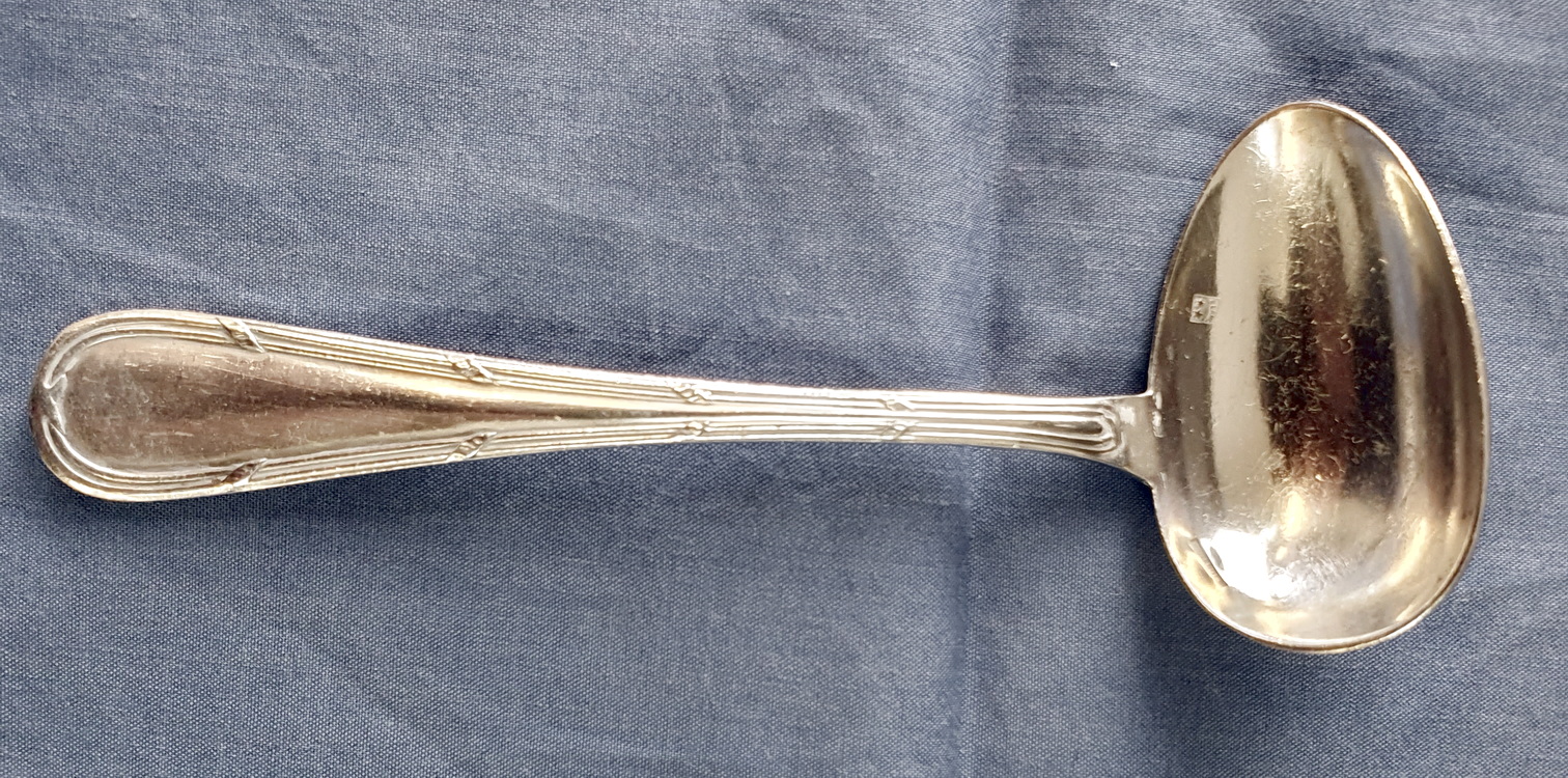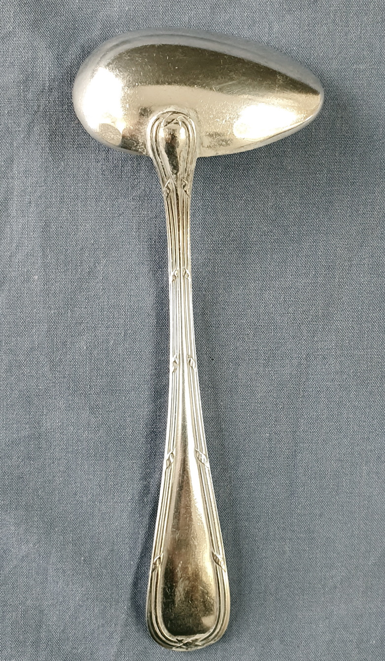 An early 20th century silver plated baby feeding spoon, the asymmetrical bowl designed to gently fit into the baby's mouth. The edges of the bowl with the Christofle and the 'Blanc' hallmarks. Blanc silver was specifically employed in Christofle hotel collections. Area of Paris, circa 1930.