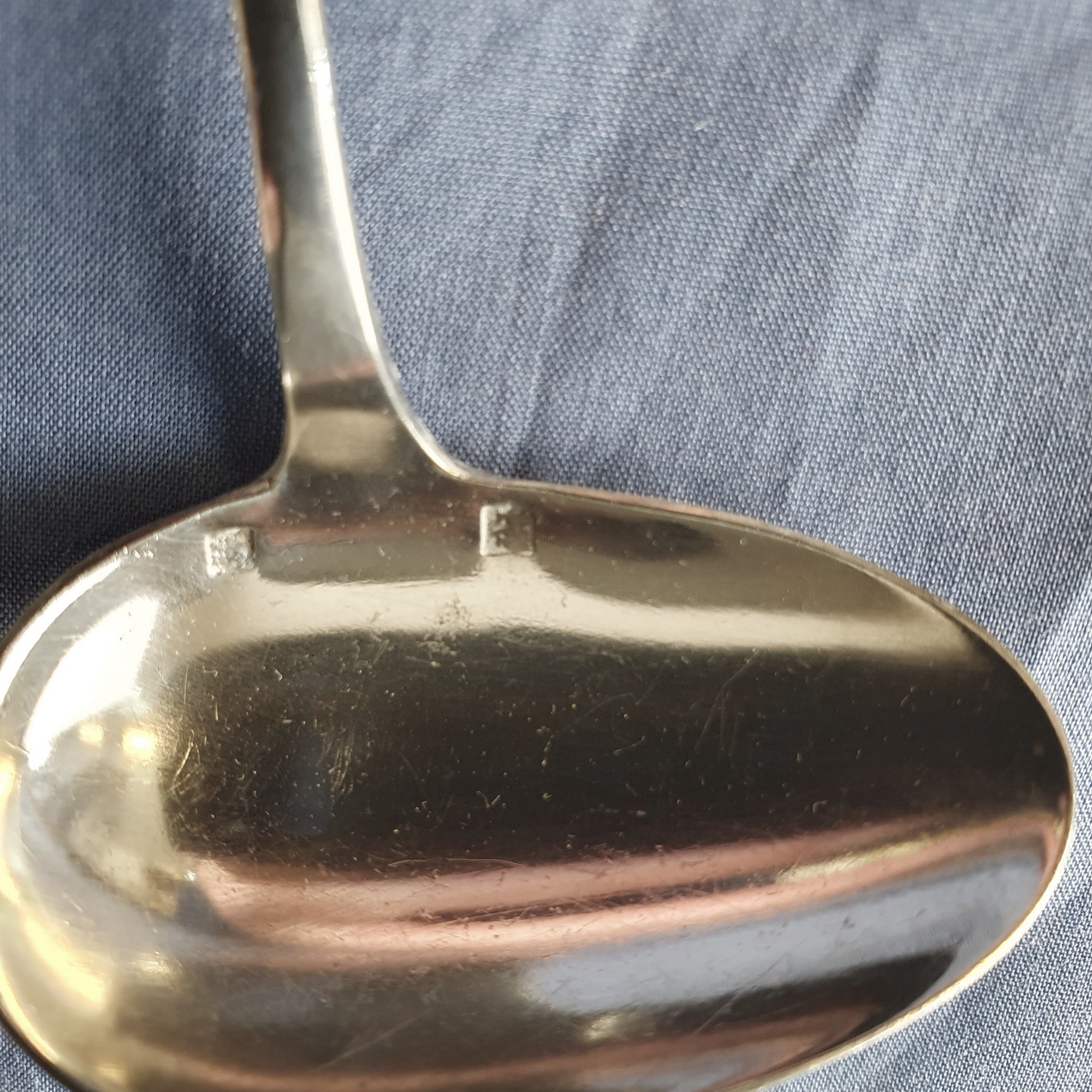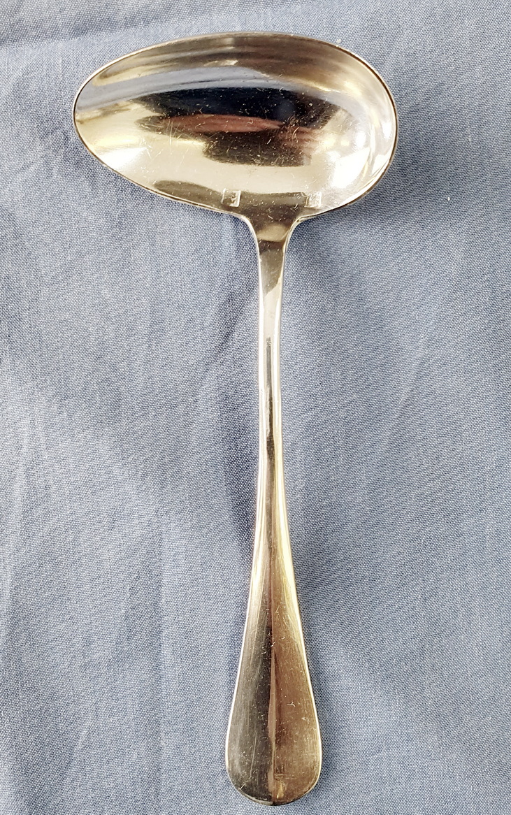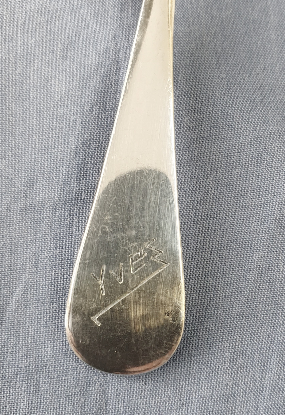 An early 20th century silver baby feeding spoon, the asymmetrical bowl designed to gently fit into the baby's mouth. The edges of the bowl with the Minerva hallmarks for French sterling silver. The underside of the handle engraved with the name 'Yves'. Area of Paris, circa 1930.