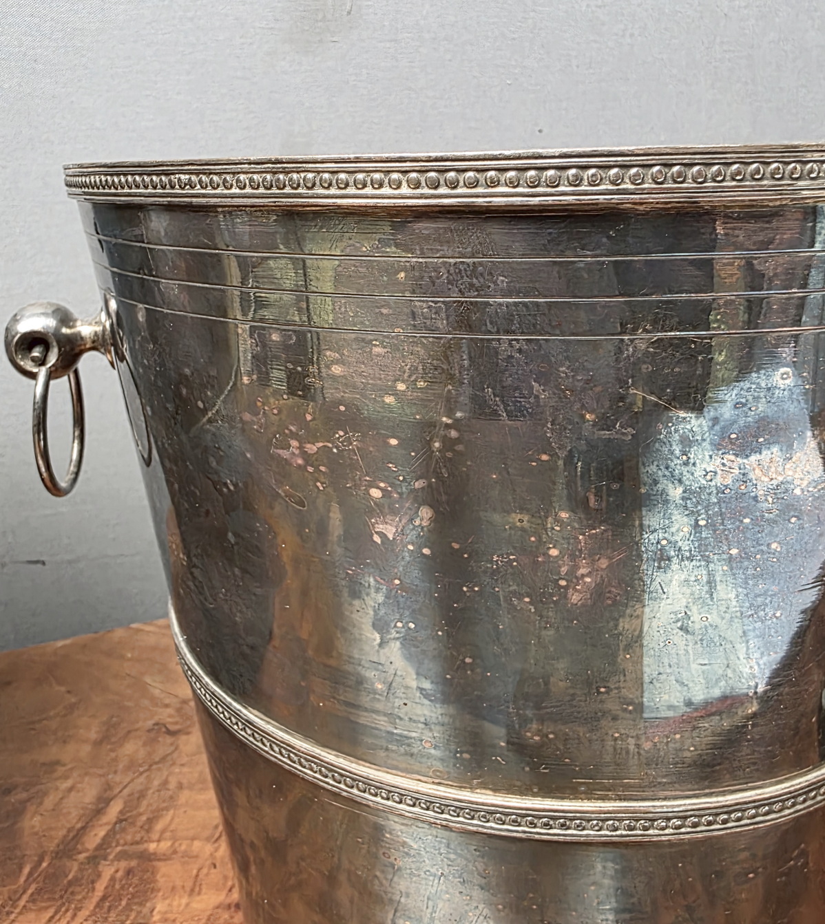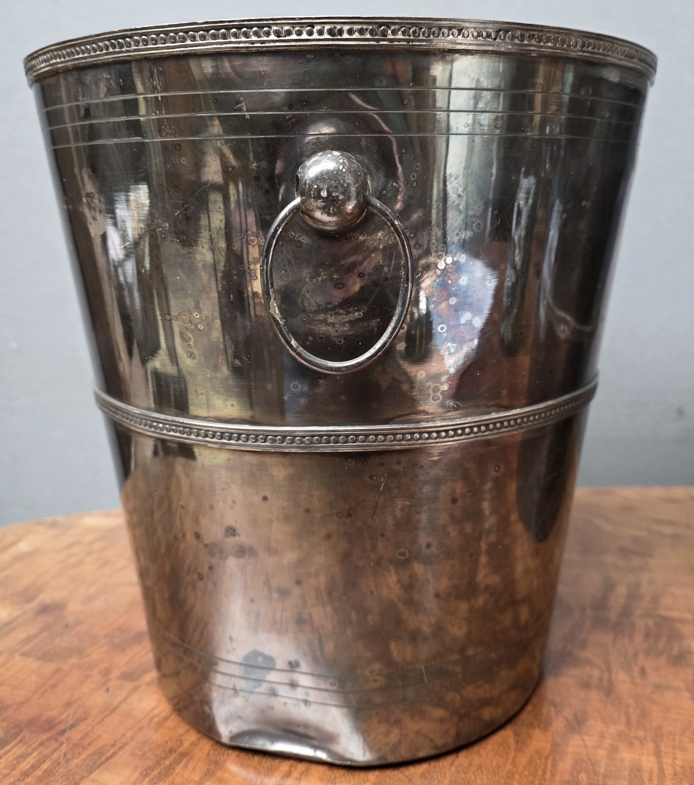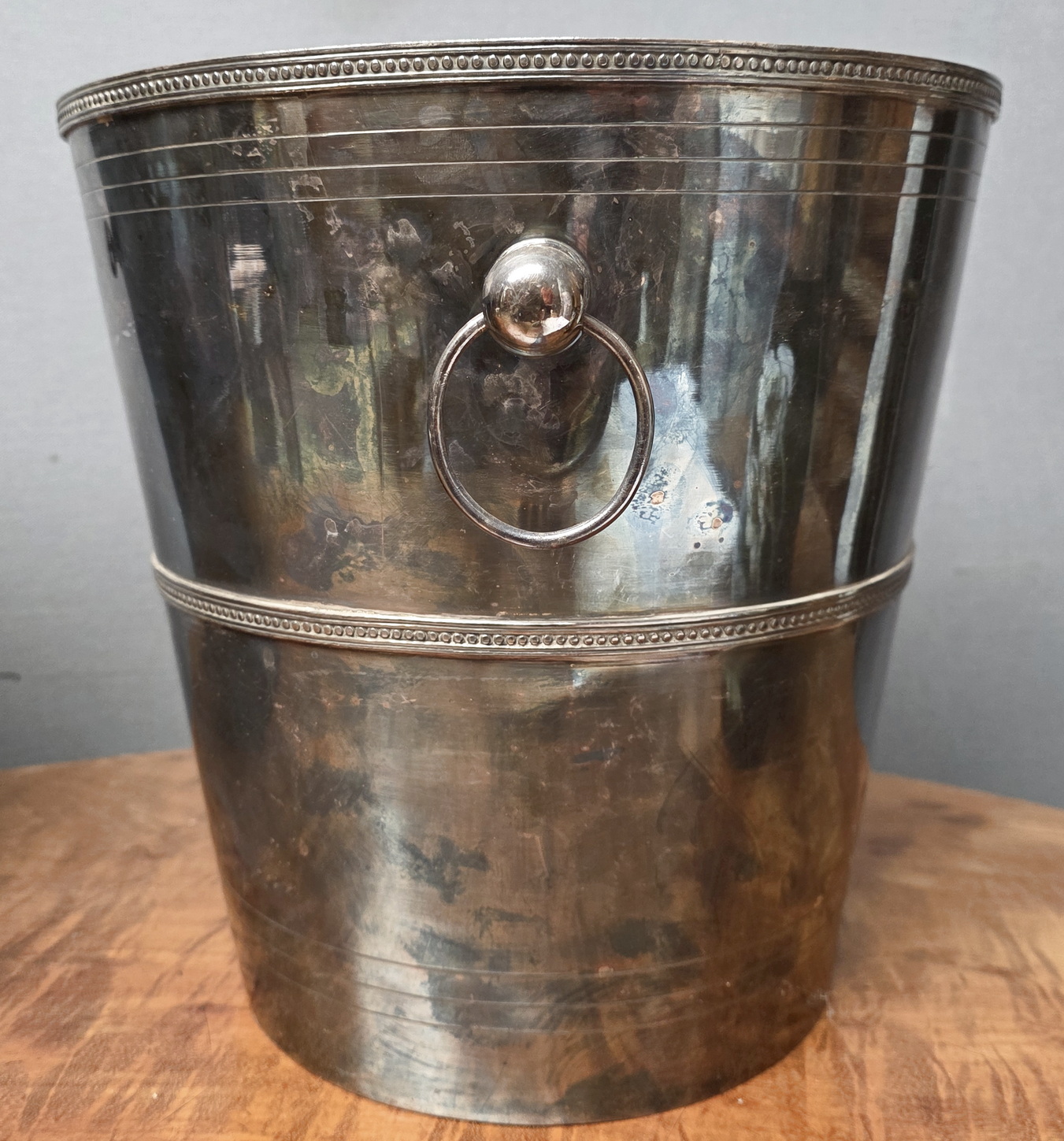 An identical pair of large, early 20th century French silvered Champagne buckets of Classical vase shape, decorated with haut relief 'string-of-pearl' mouldings and fitted with ring shaped carrying handles. The undersides are stamped by a Parisian silversmithing workshop. Area of Paris, circa 1930.