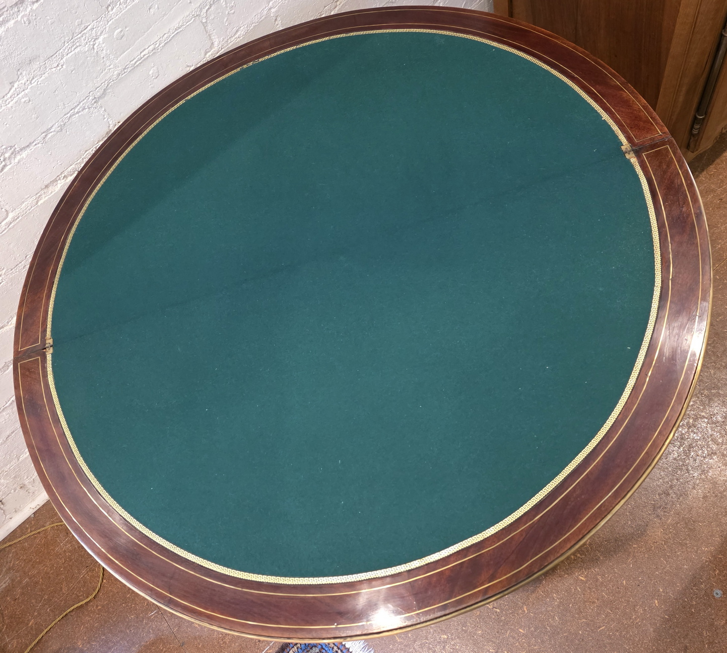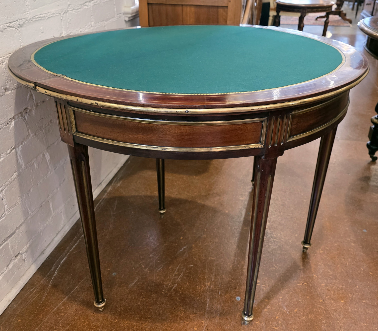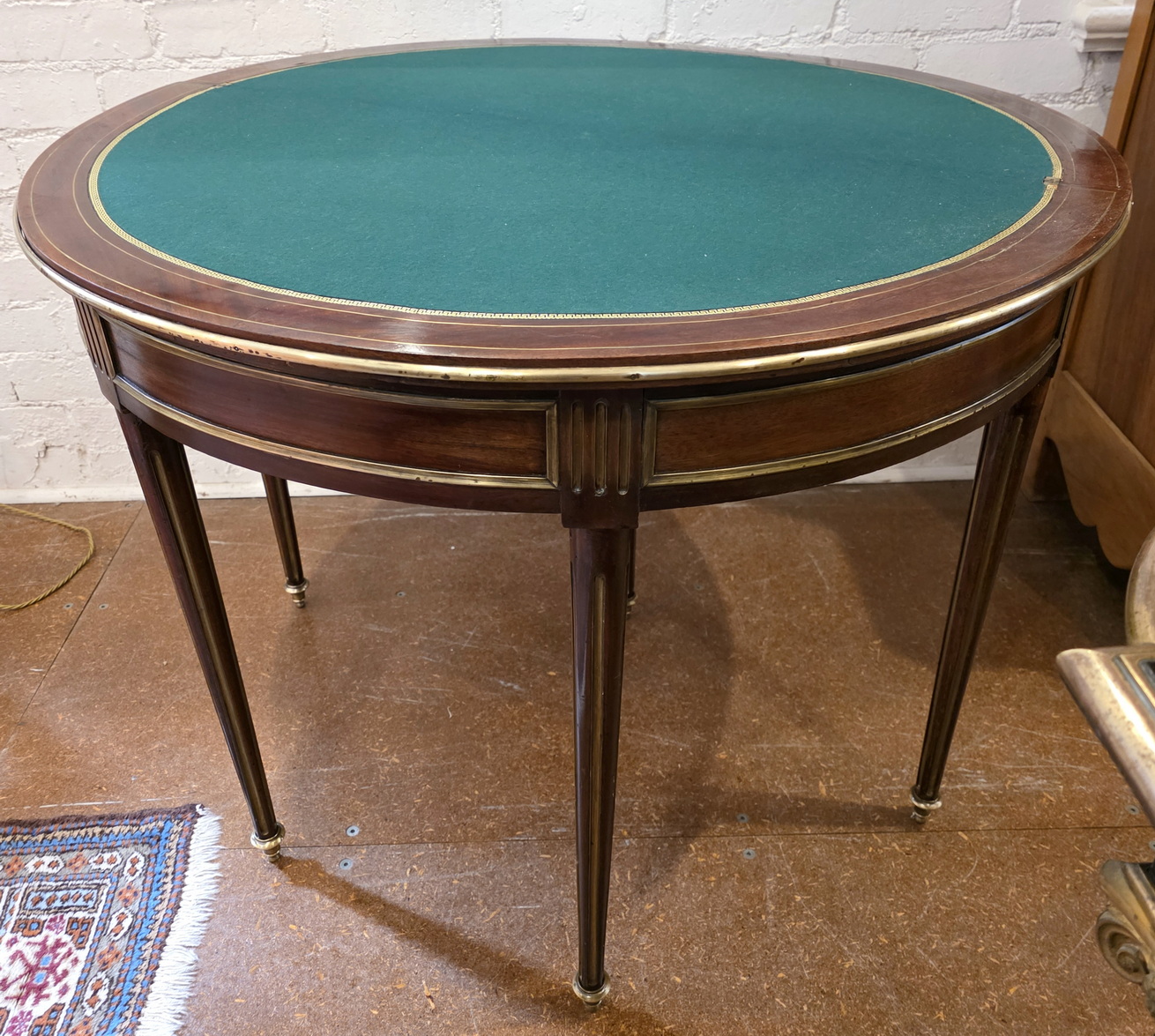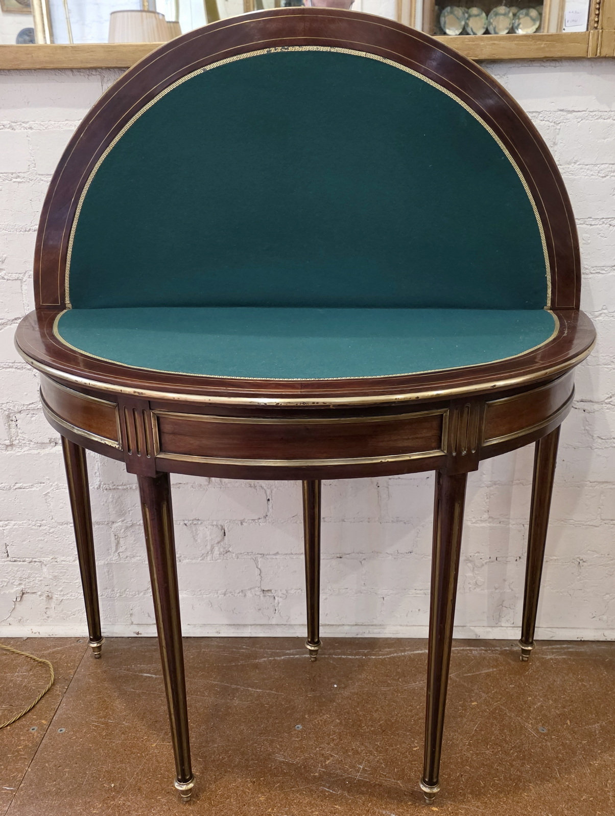 An elegant 19th century French Napoleon III period, Louis XVI style mahogany and gilt brass-inlaid and gilt brass-mounted demilune card table standing on finely turned and reeded legs, the top opens to reveal a circular playing surface lined with baize fabric and with a gilt leather trim. Please note that when closed, this table becomes an excellent Console table. Area of Paris, circa 1870.