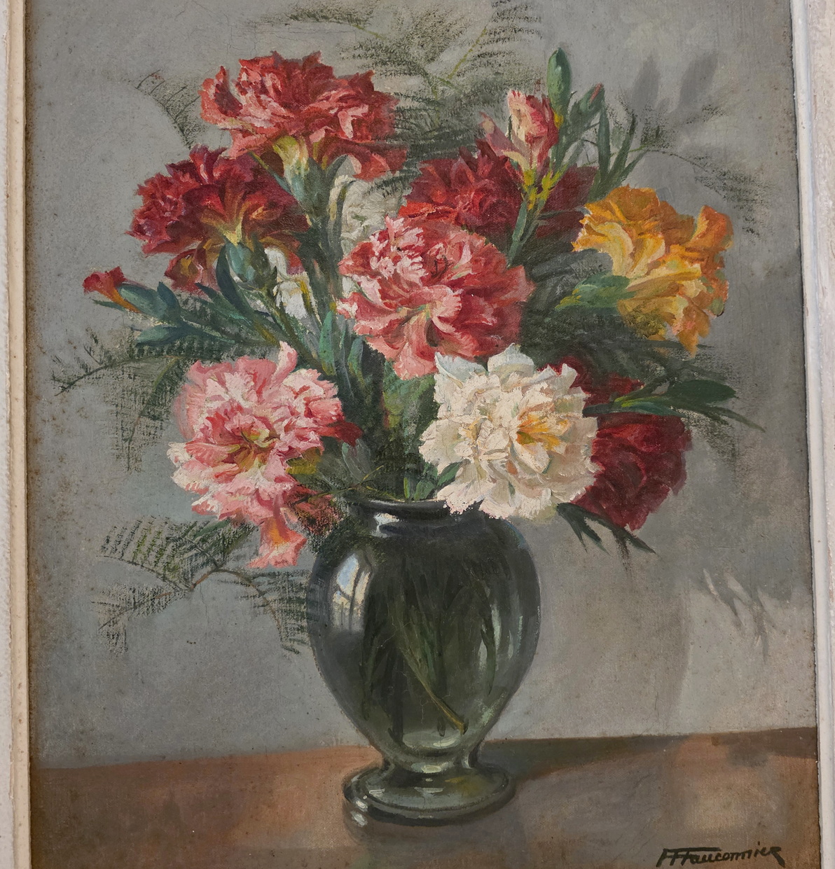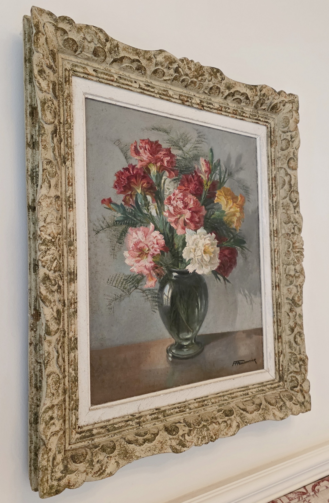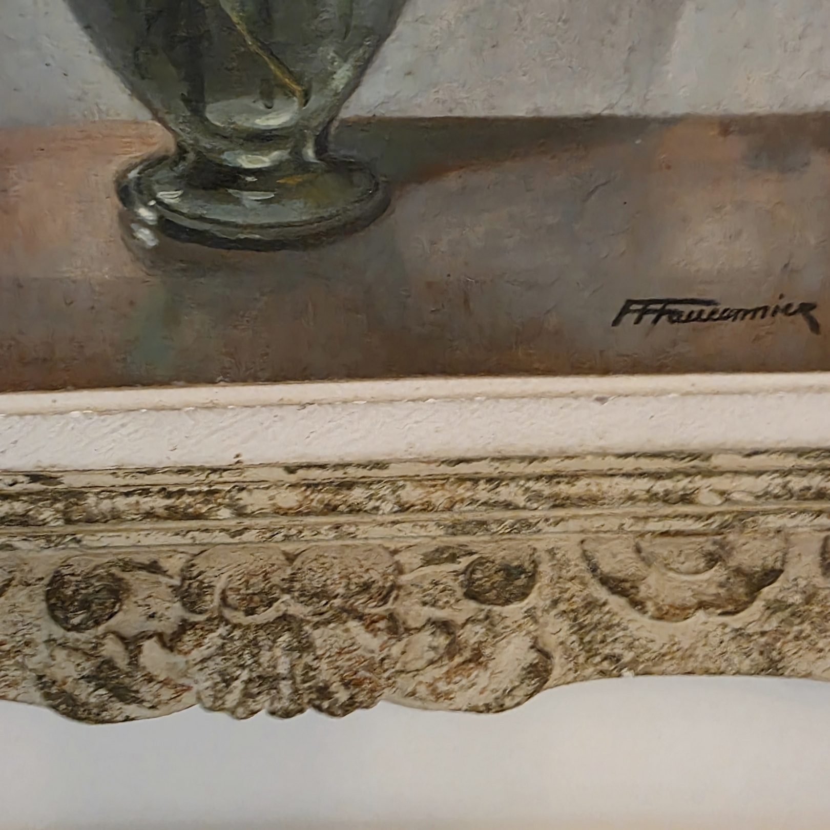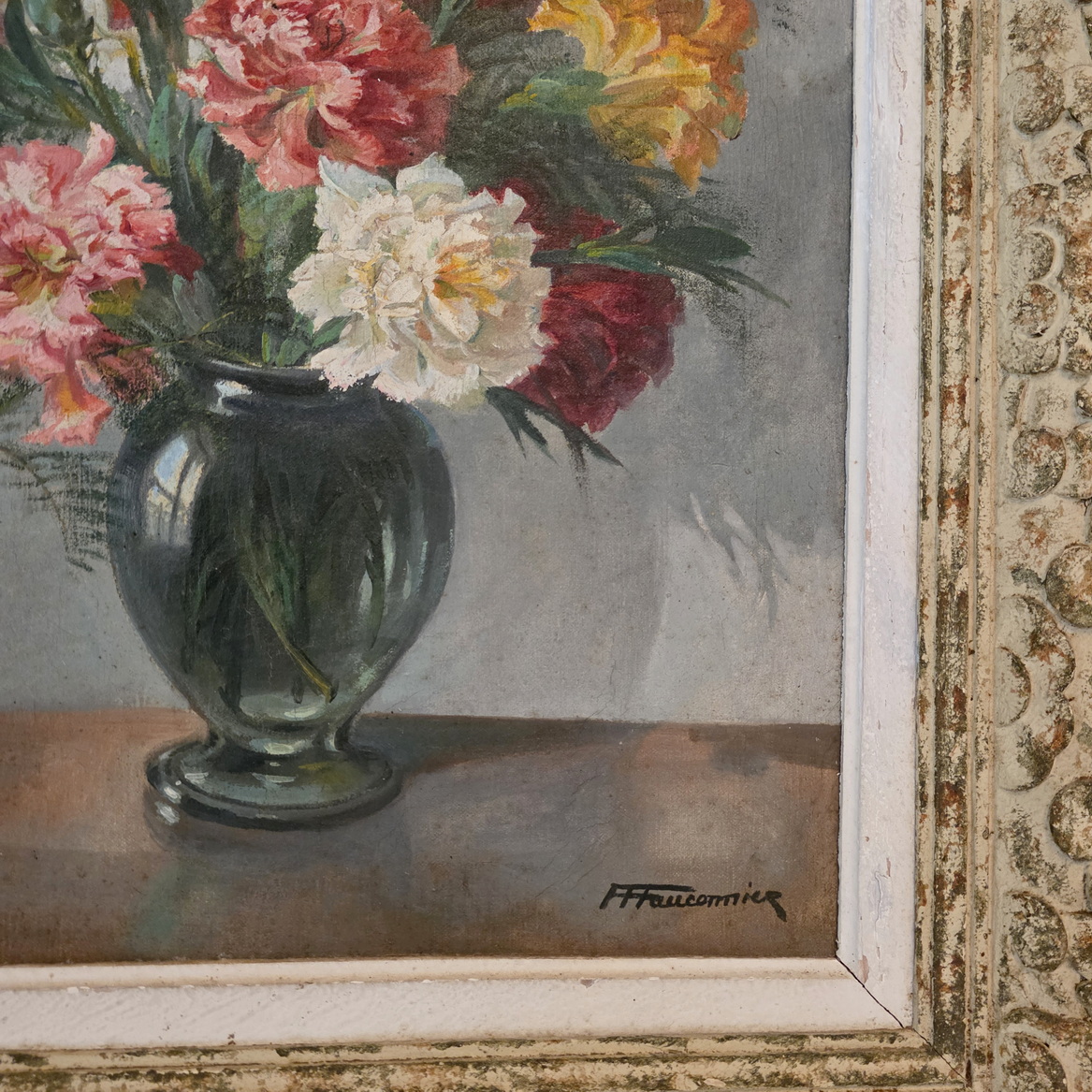 A French oil-on-canvas still life of very good composition and colours depicting an arrangement of Summer flowers in a glass vase, retaining its original carved and painted 'Montparnasse' frame. Please note the luminosity of this painting. Signed on the bottom left "F.F. Fauconnier". Area of Paris, circa 1930.