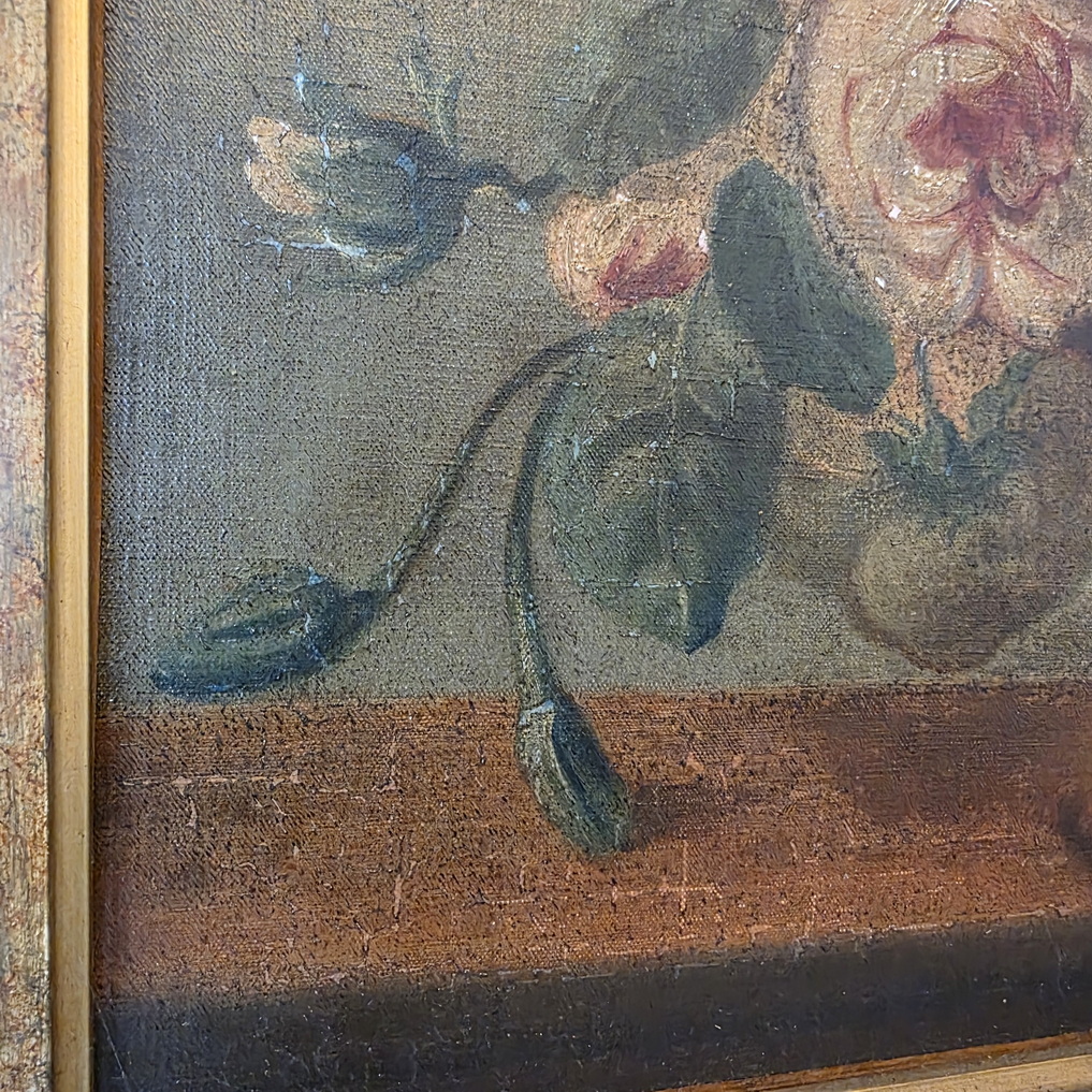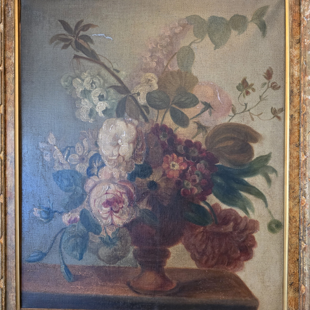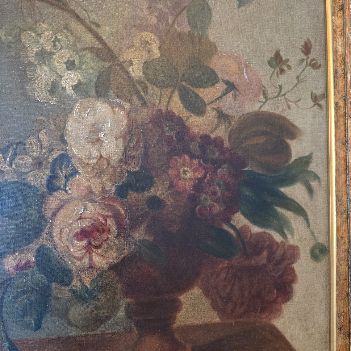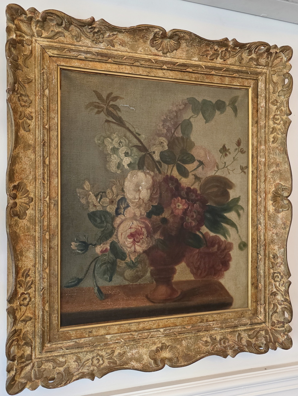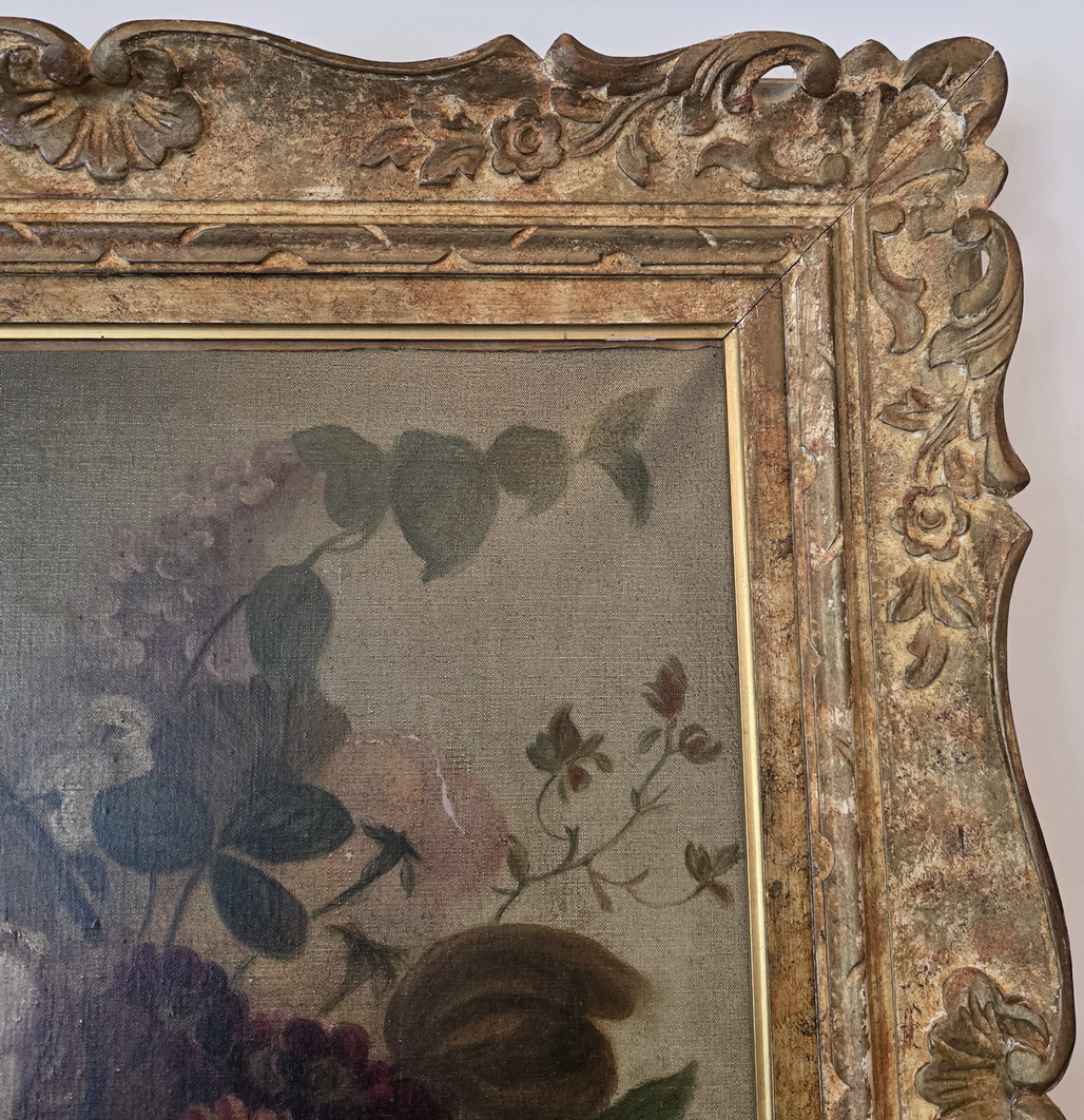 A French oil-on-canvas still life of very good composition and colours depicting Summer flowers in a vase, fitted into its original carved and gilt 'Montparnasse' frame. Area of Paris, circa 1930.