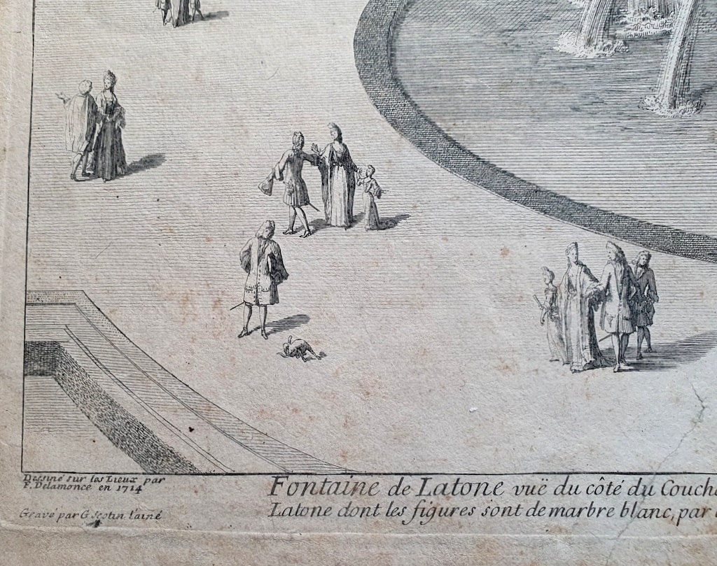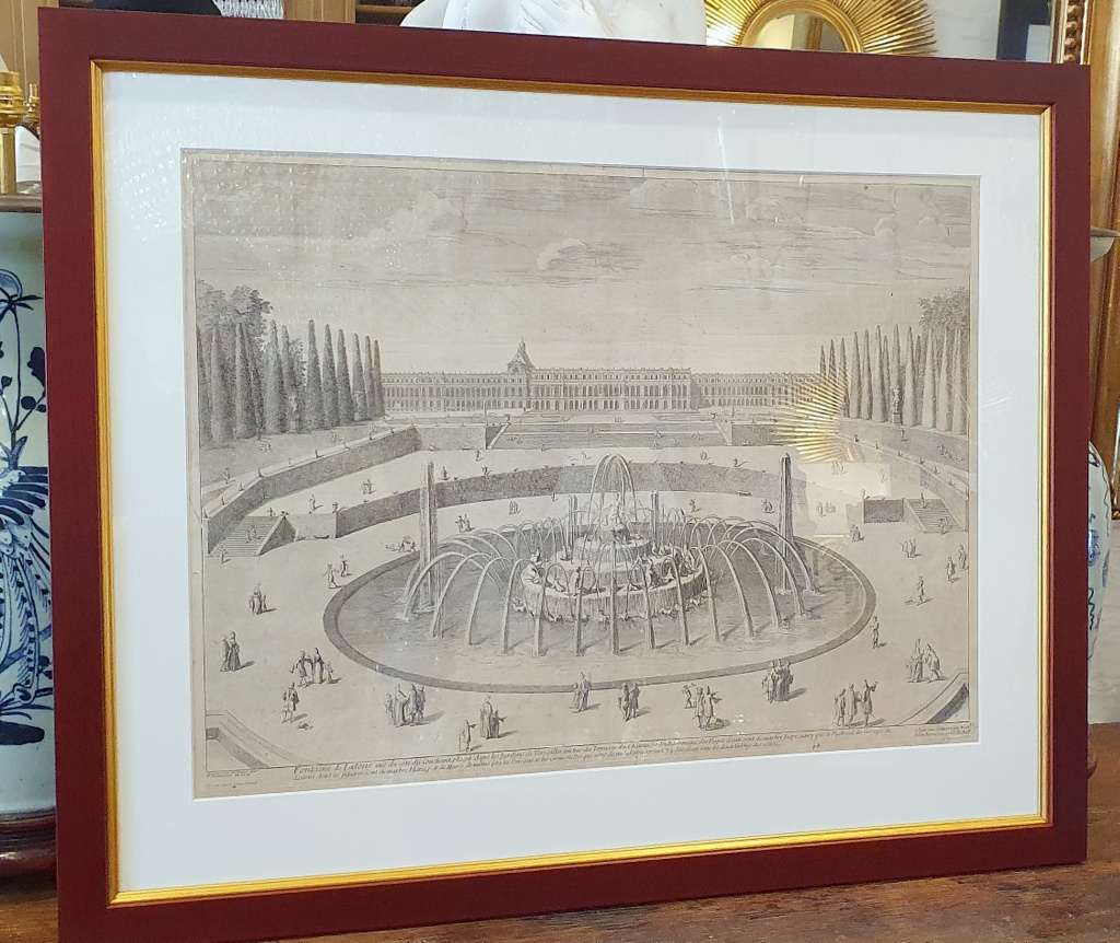 A large, early 17th century French Louis XIV period, copper-plate etching depicting the Fountain of Latona and a perspective of of the gardens and the Chateau of Versailles. Etched by by Adam Perelle (1638-1695). Perelle was an engraver to the King Louis XIV and worked from his atelier in Rue St. Jacques a la Victoire in Paris.