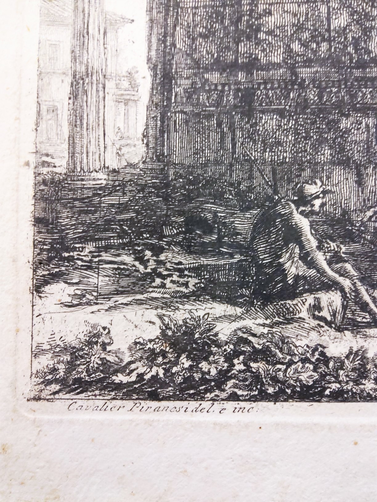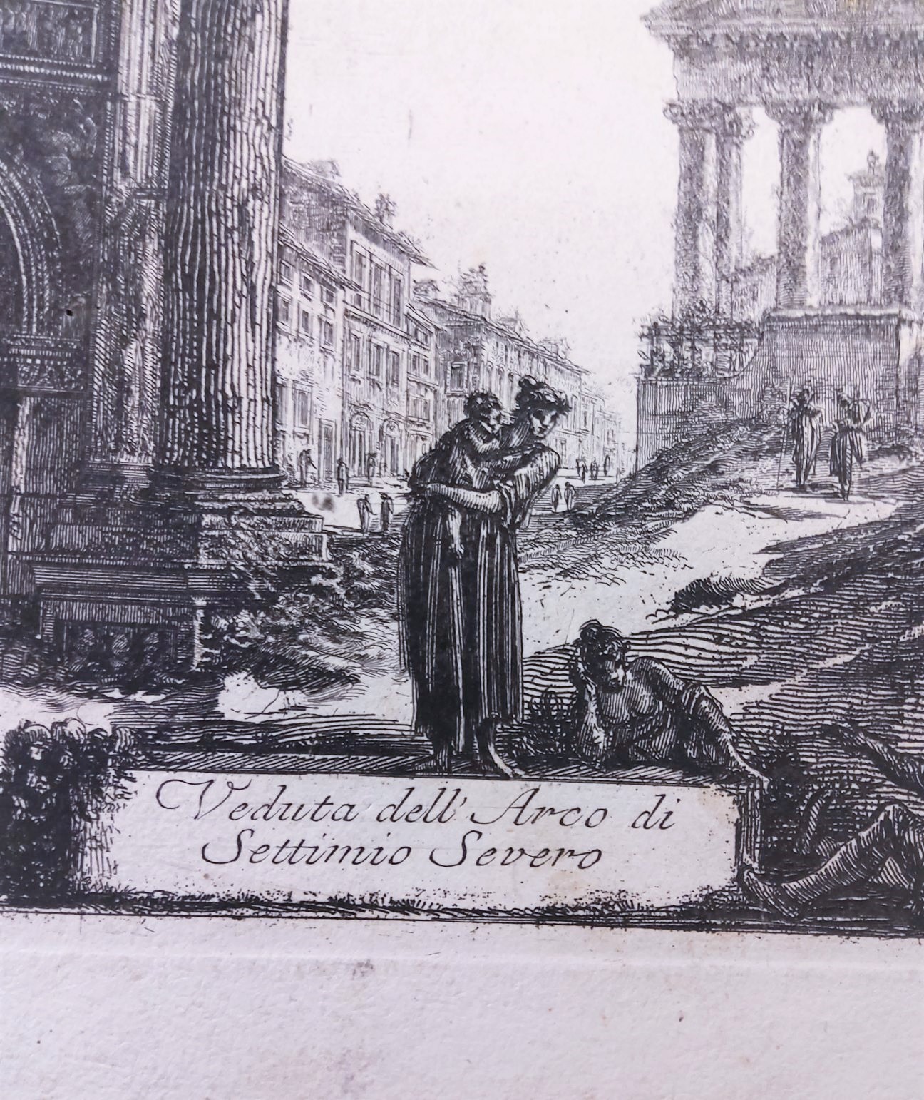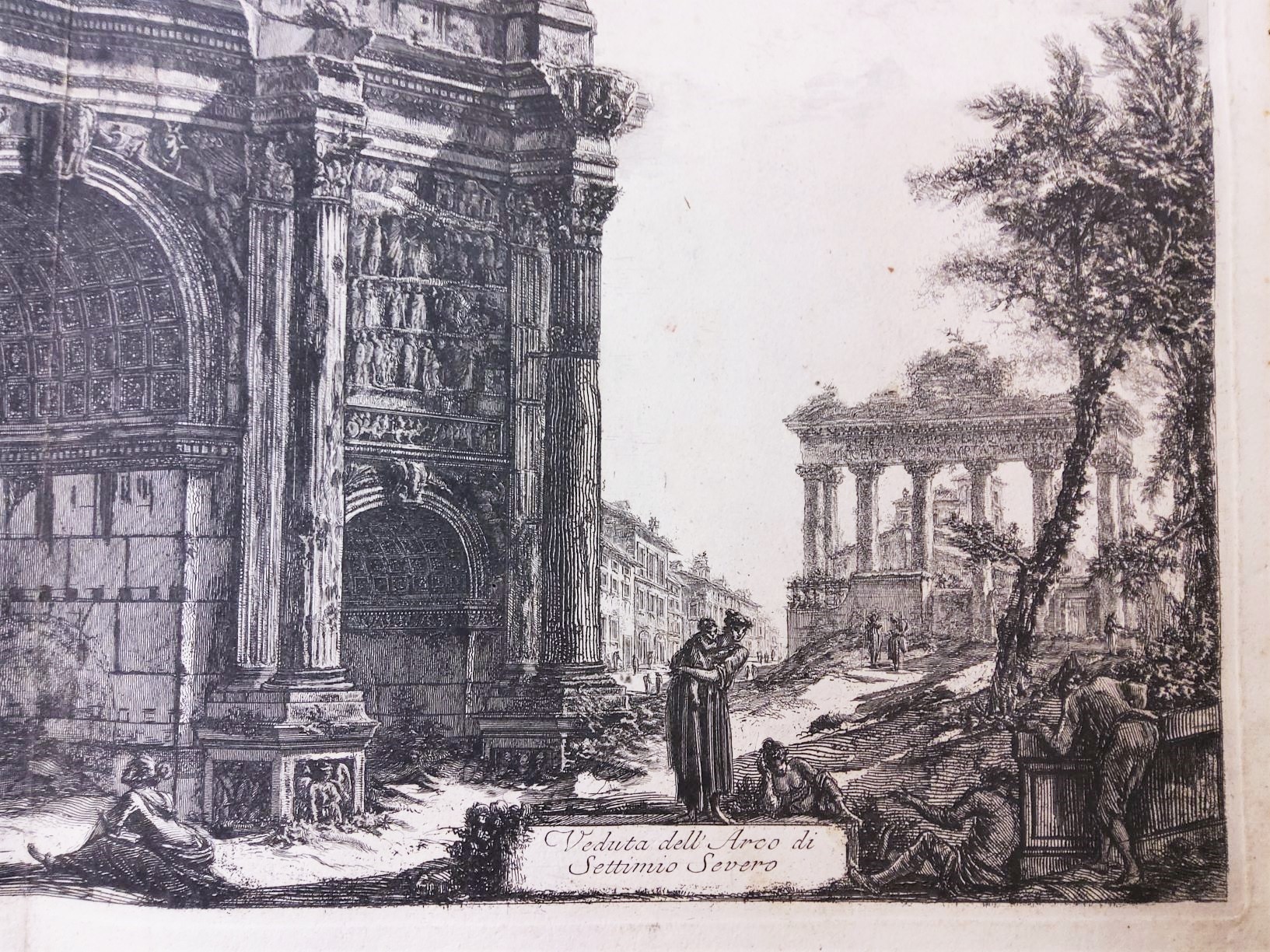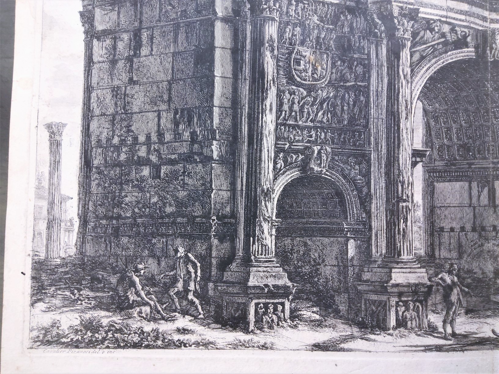 A large 18th century etching by Giovanni Battista Piranesi (Rome (1720-1778), with a view of the Arch of Septimius Severus in Rome, the Temple of Saturn depicted in the background. Typically for the works of Piranesi, this etching depicts not only the decaying ruins of Ancient Rome, but also figures in ragged clothes and unkempt vegetation in the foreground. Inscribed on the bottom left  "Cavalier Piranesi Del. et Inc.". This etching is from Piranesi's famous series of etching of the 'Views of Rome', sold in the 18th century to European 'Grand Tour' clients. The lower-right hand with a Cartouche inscribed with "Veduta dell' Arco di Settimio Severo".  Area of Rome, circa 1770.