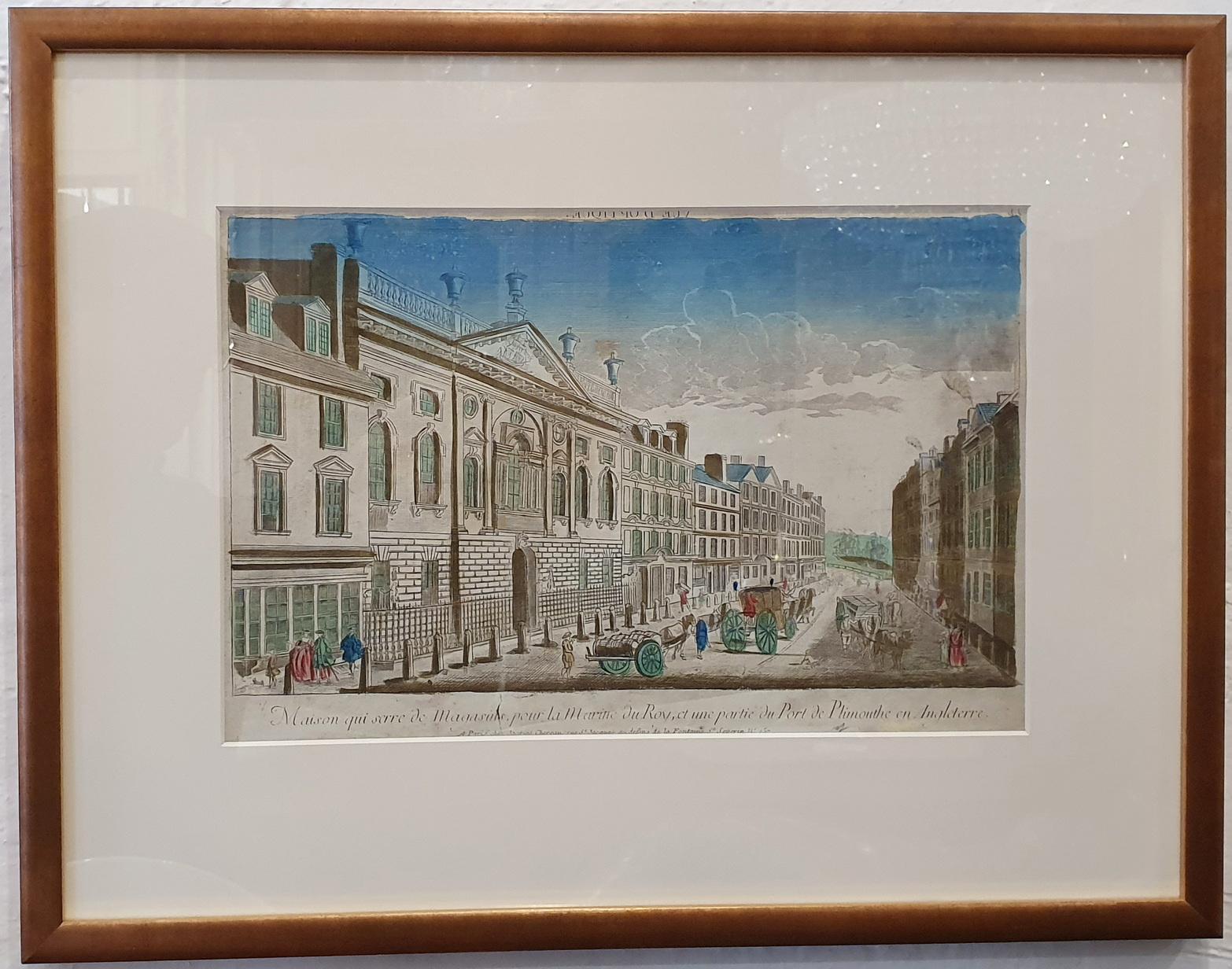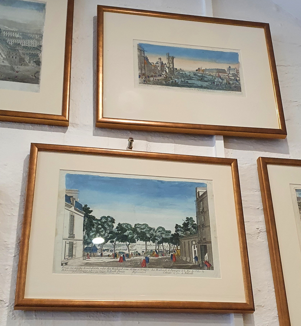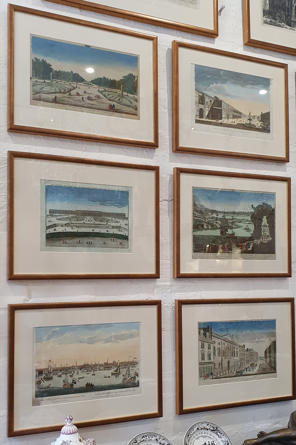 A lot 18th century French Louis XVI period 'Vues d'Optique' (perspective view) prints depicting panoramas of cities, monuments and the interiors of famous constructions, each retaining their original hand water-colouring. These type of printed etchings were normally designed with a deliberately strong linear perspective, so as to be viewed through a "Zograscope", (an optical diagonal machine) which enhanced the viewer's experience. Vues d'Optique became a popular entertainment for 18th century French Salons. Area of Paris, circa 1770 to 1790.