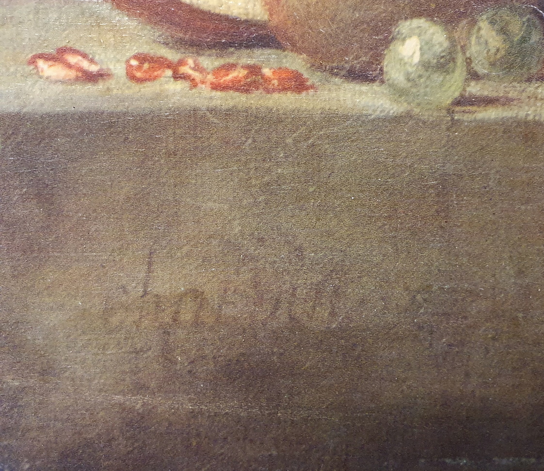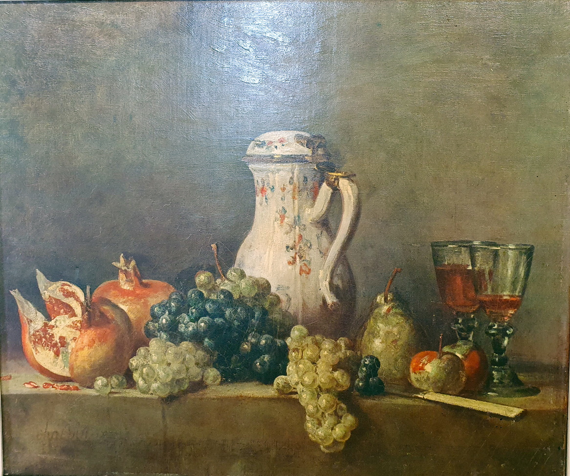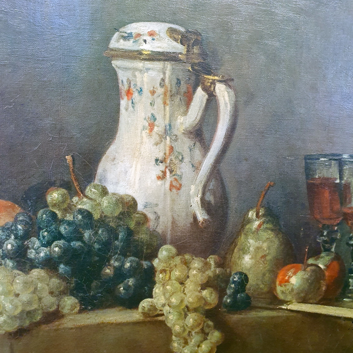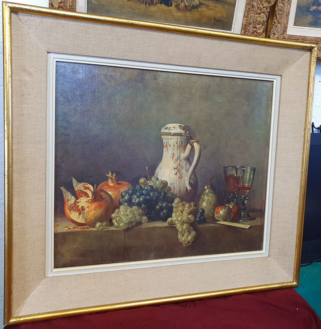 A mid 20th century French oil-on-canvas still-life of excellent composition and colour, depicting grapes, pears, pomegranates and an antique majolica wine pitcher and glasses in the background. Signed in the bottom l.h. corner, (the signature is as yet undeciphered) . Retaining the original gilt and fabric lined frame. Area of Paris, circa 1970.